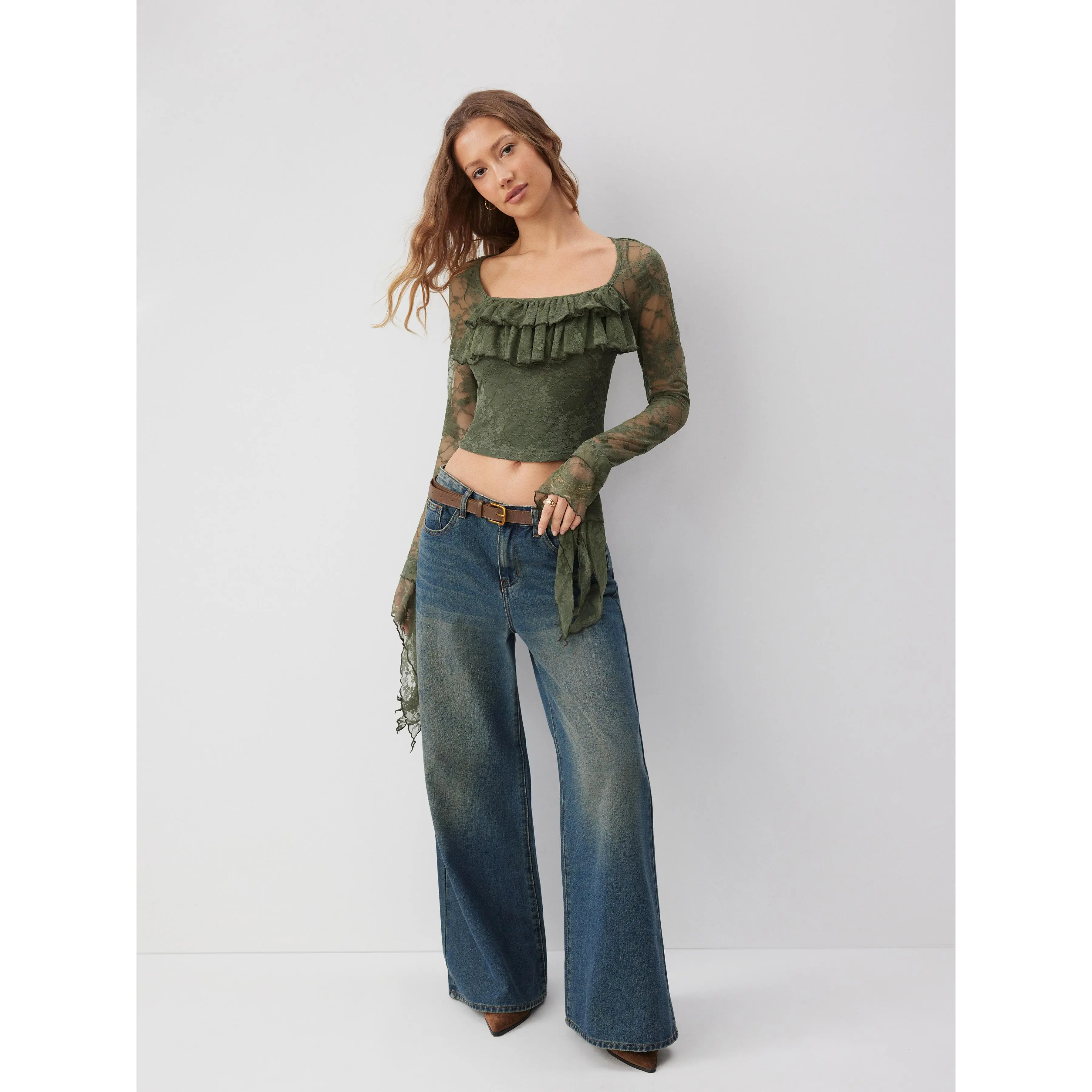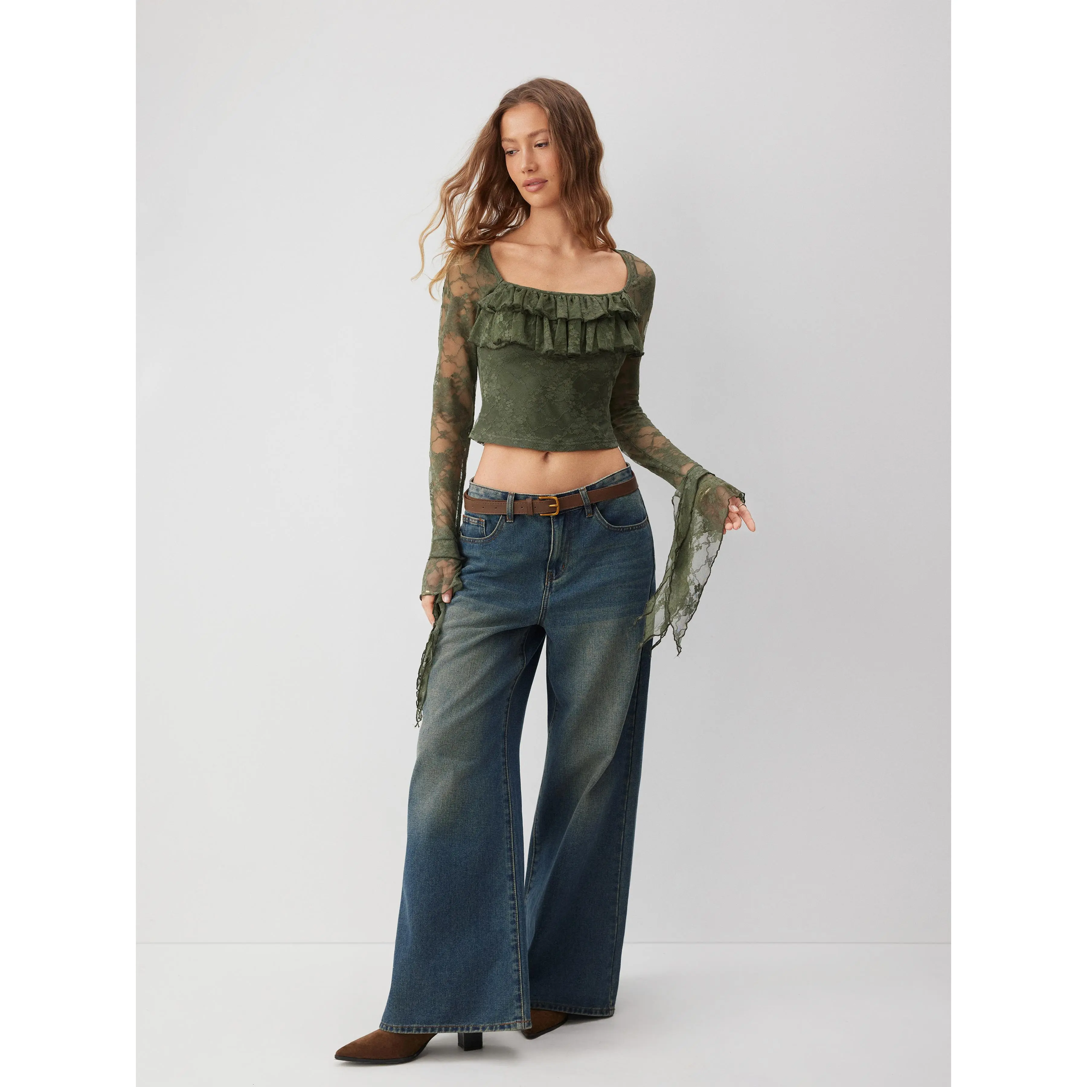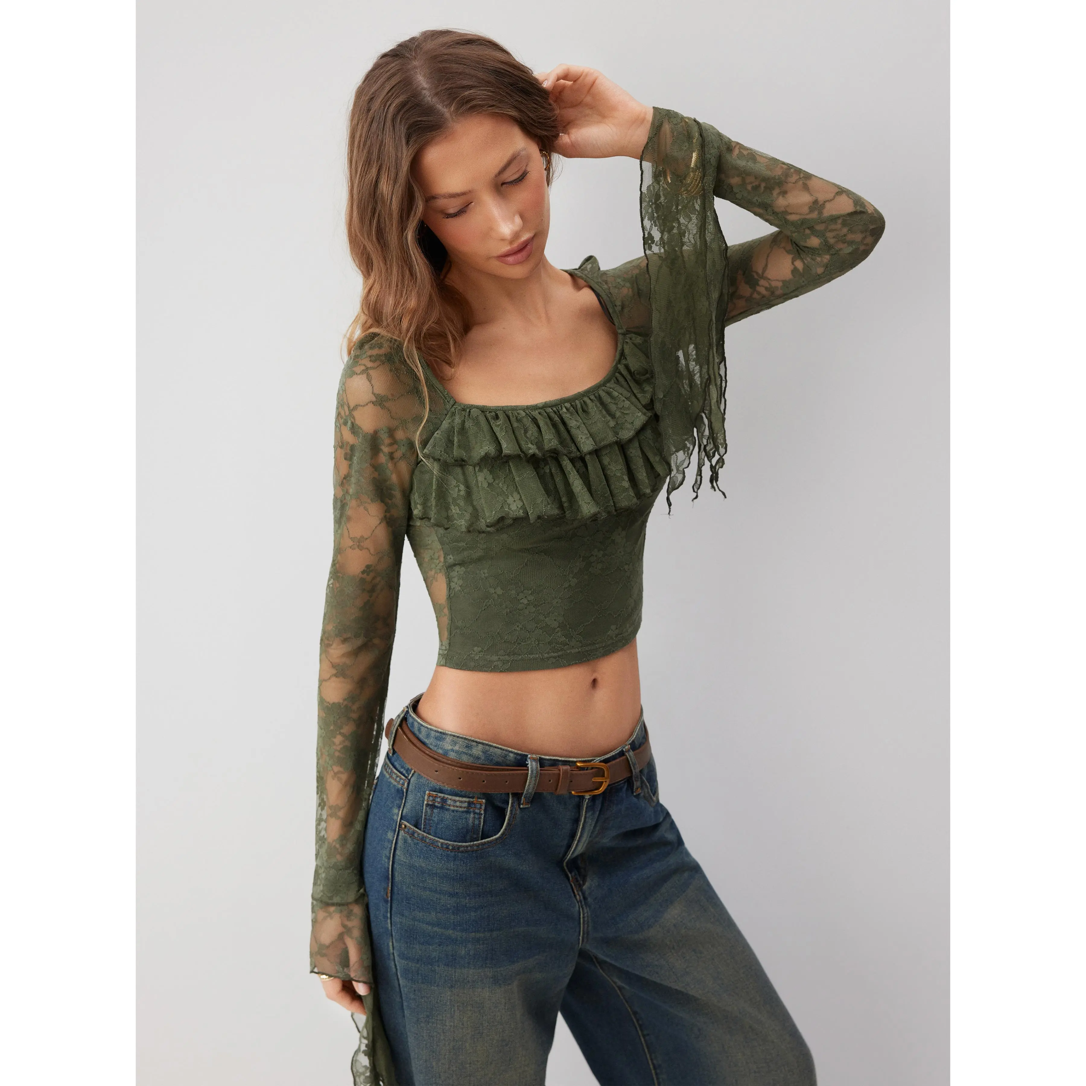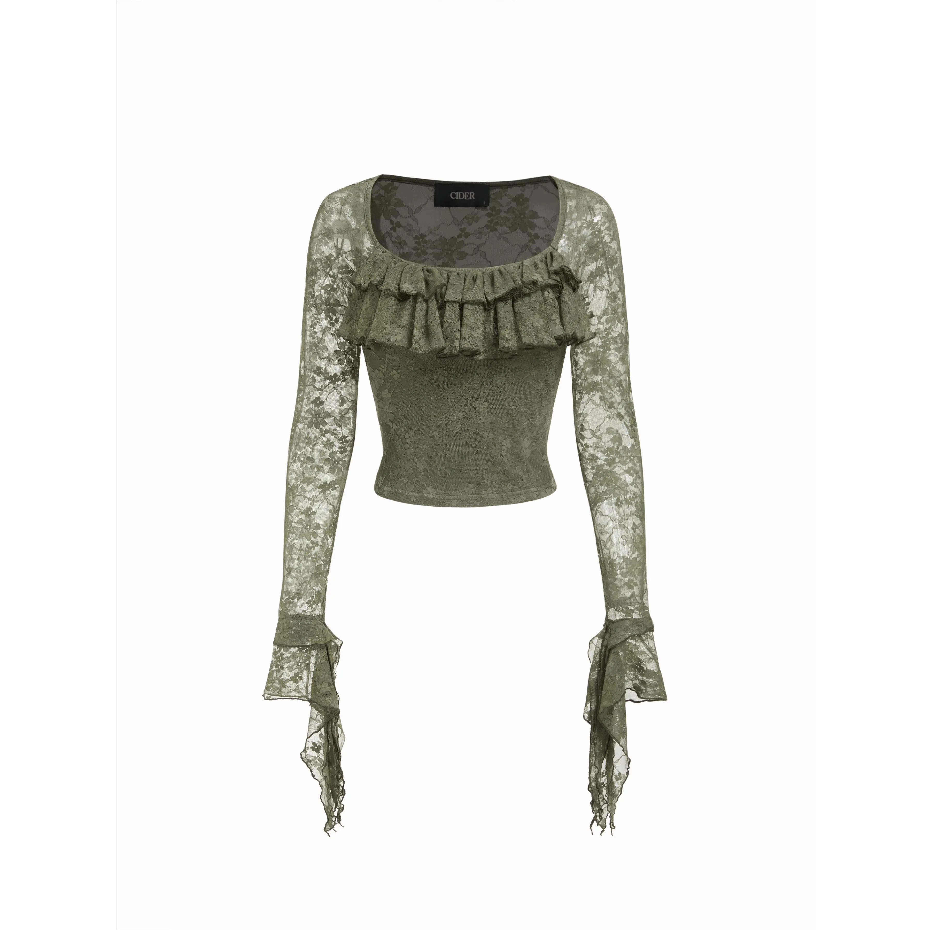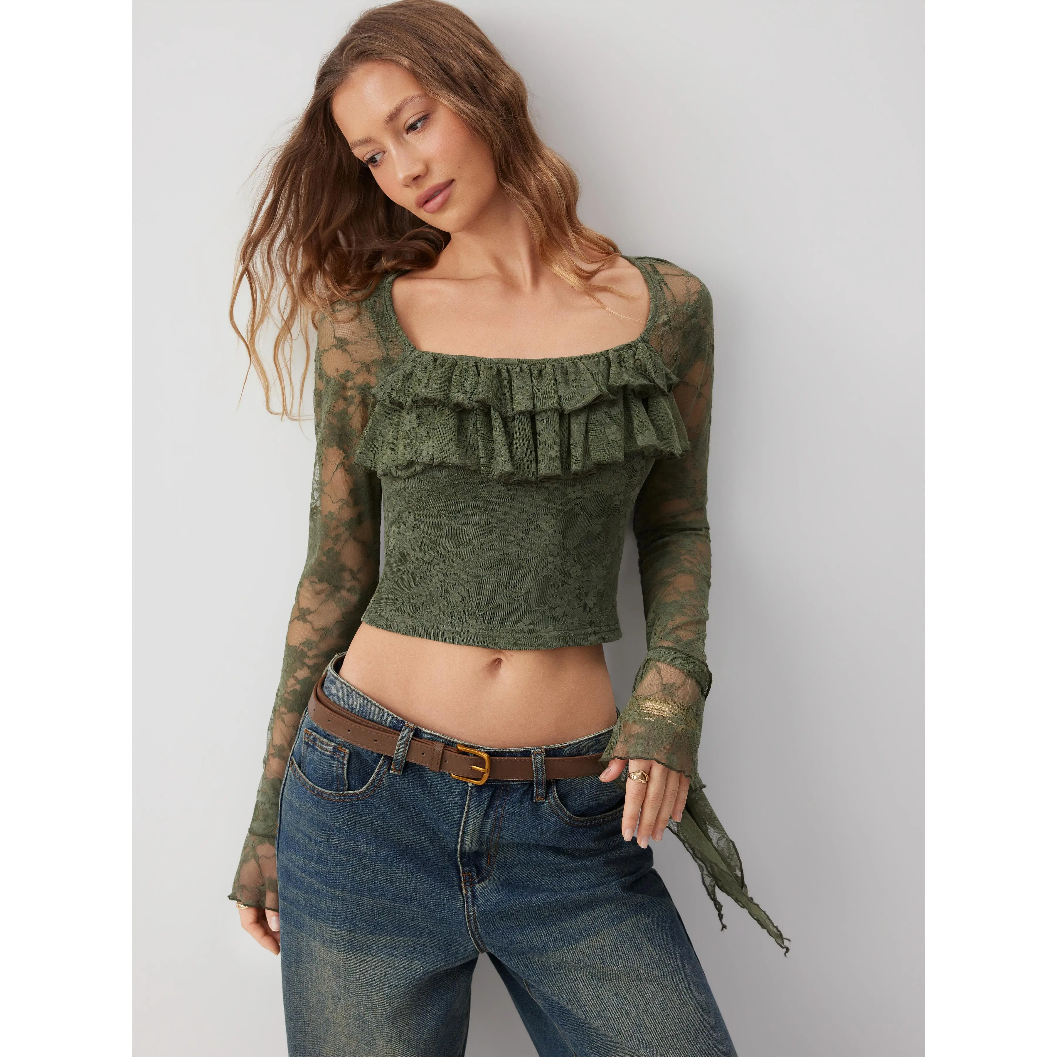 5. Cider Lace Square Neck Ruffle Sleeve Crop Top