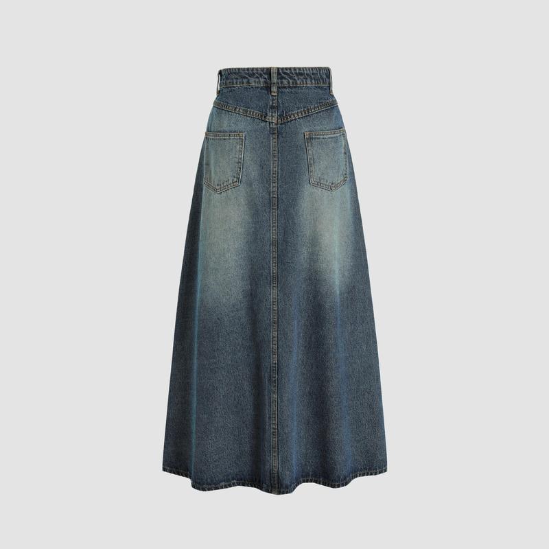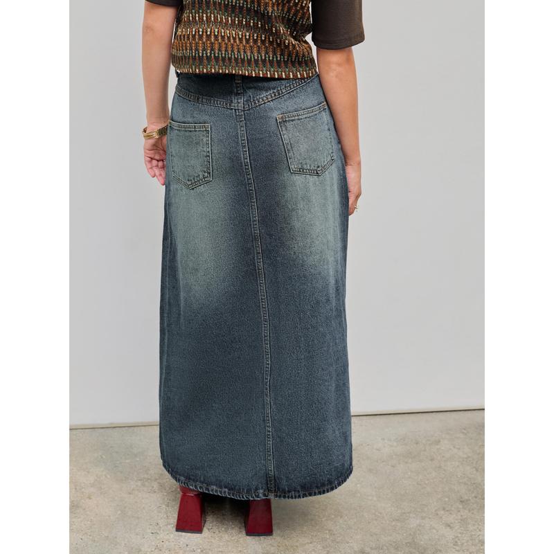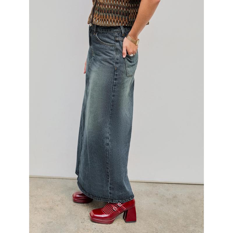 ·Cider Denim Mid Waist Solid Pocket Maxi Skirt