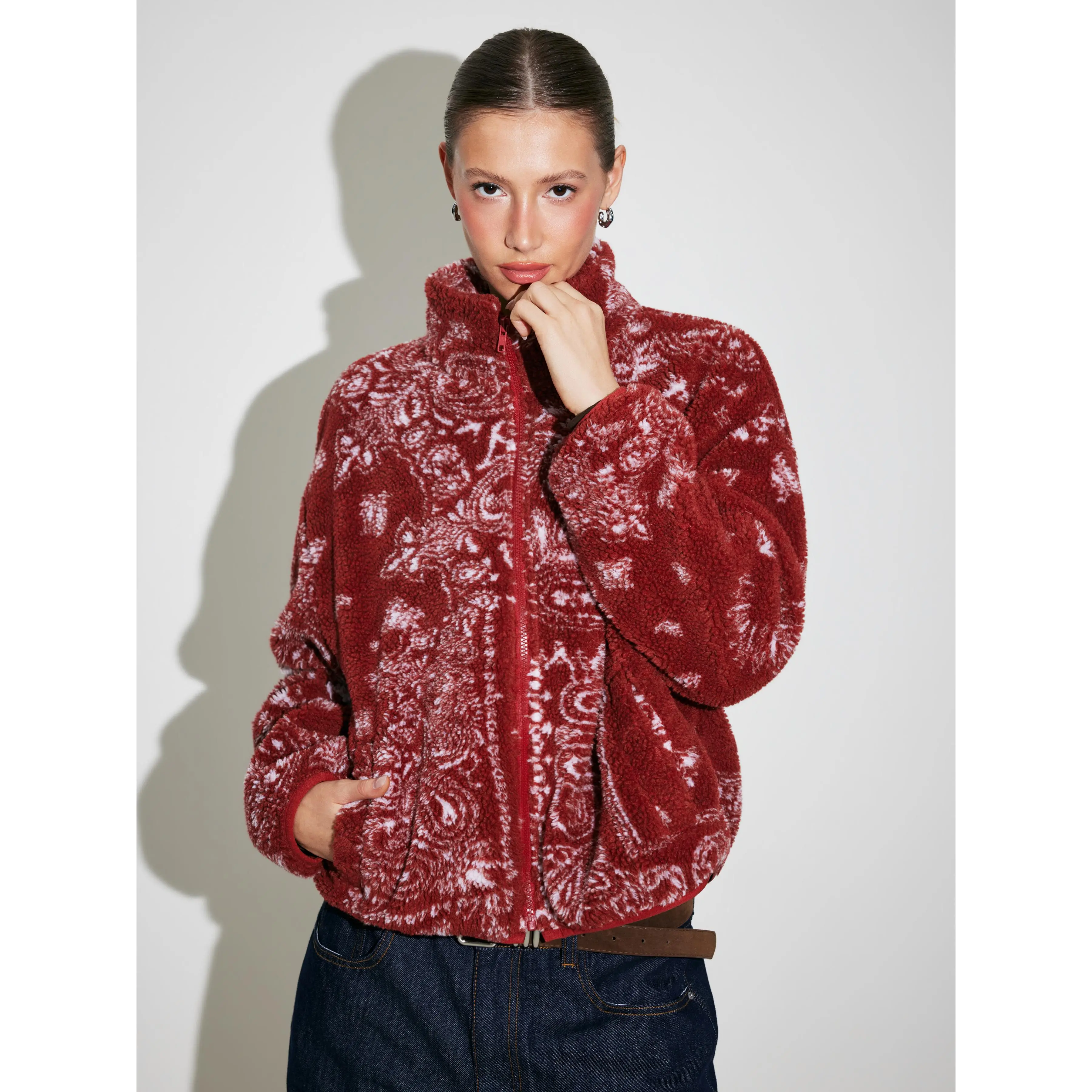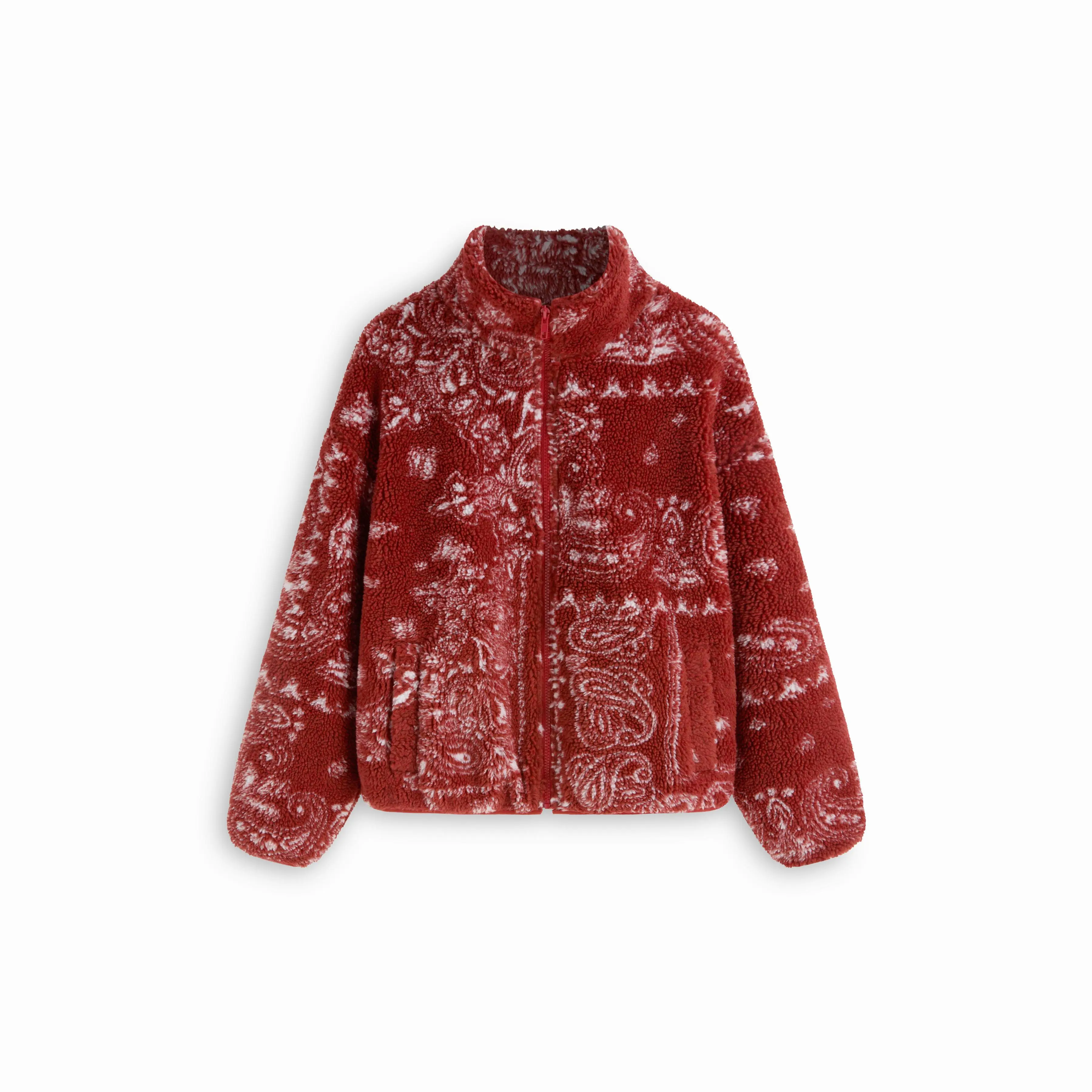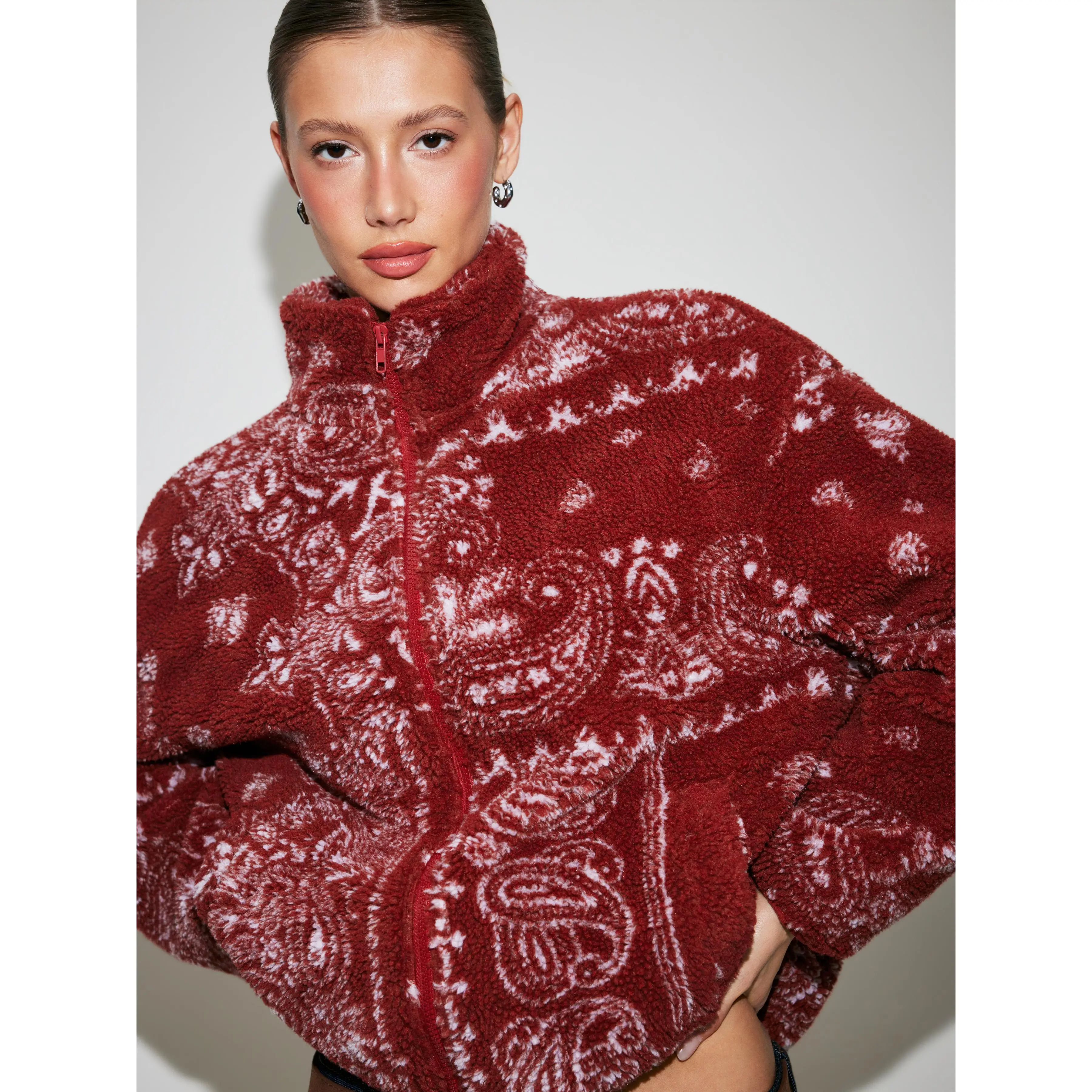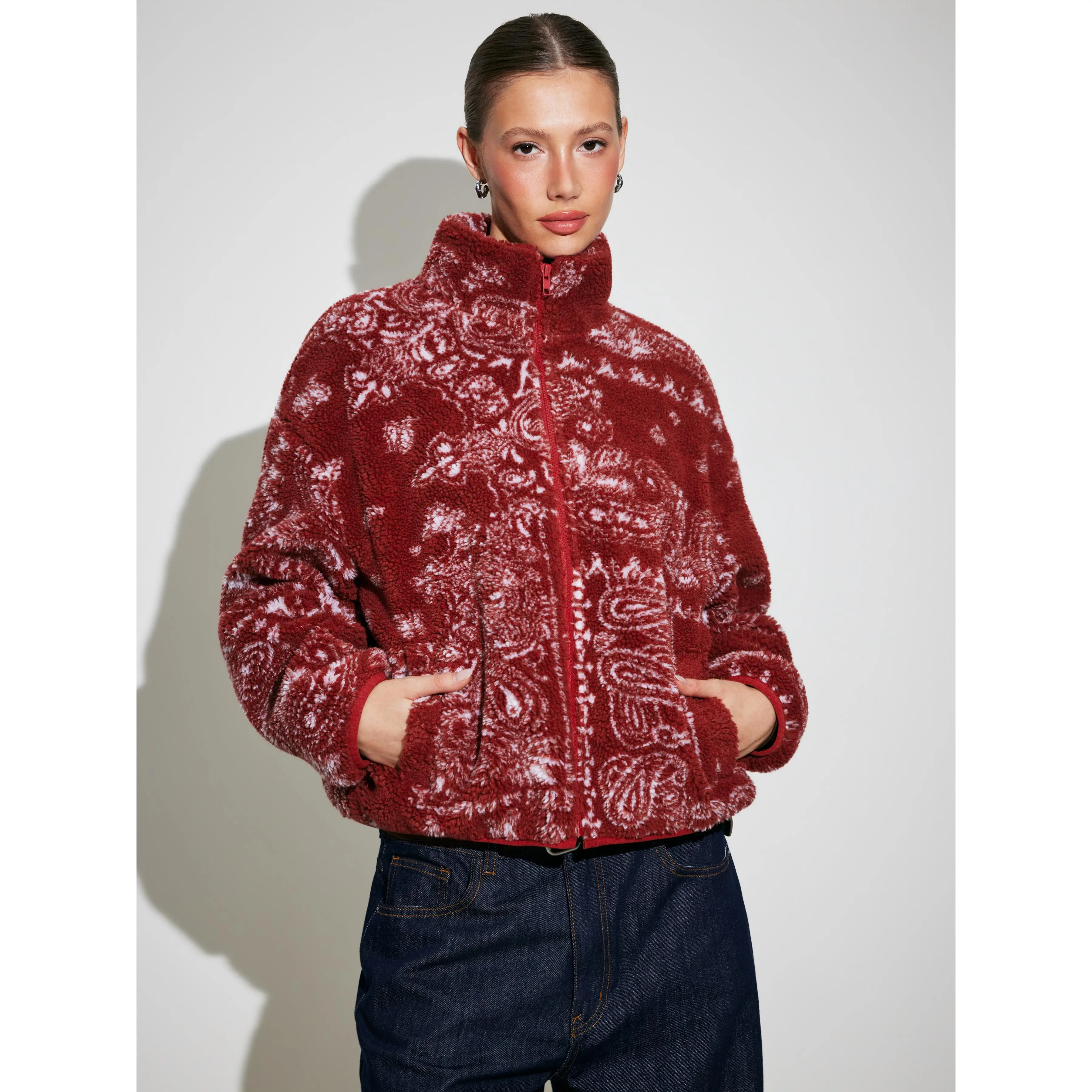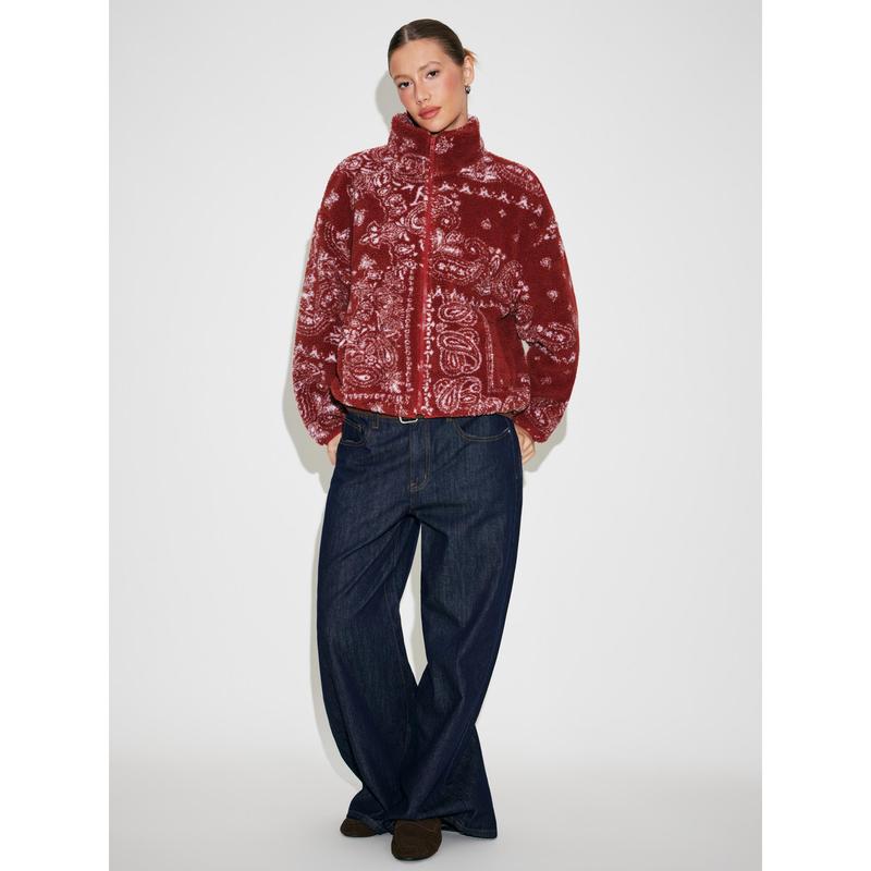 5. Cider Fleece Stand Collar Paisley Print Oversized Jacket