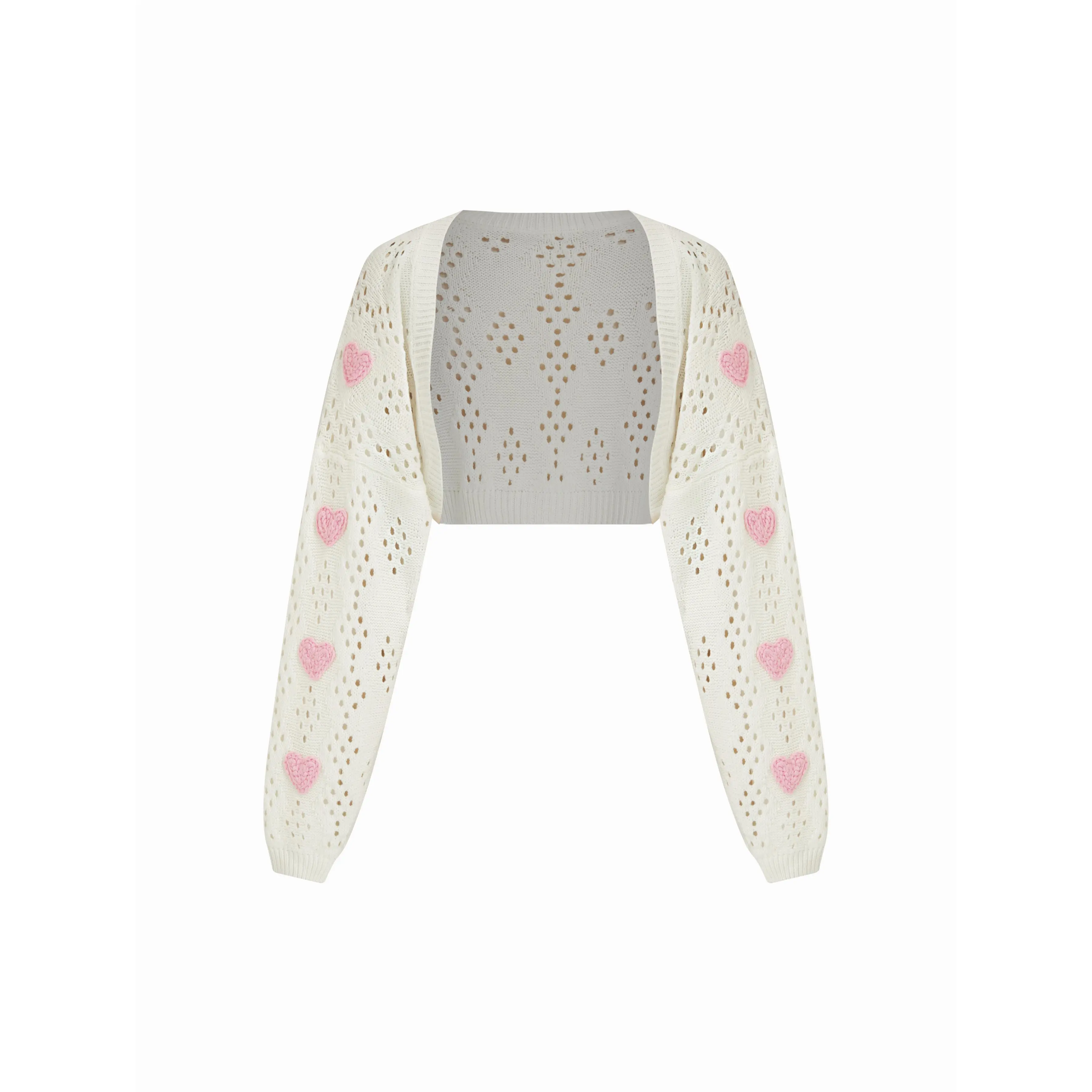 Cider Cream White Open Back Crochet Hollow Out Cardigan with Pink Heart Embellishments - Sweet Short Sleeve Knit Sweater for Women Daily/Dating