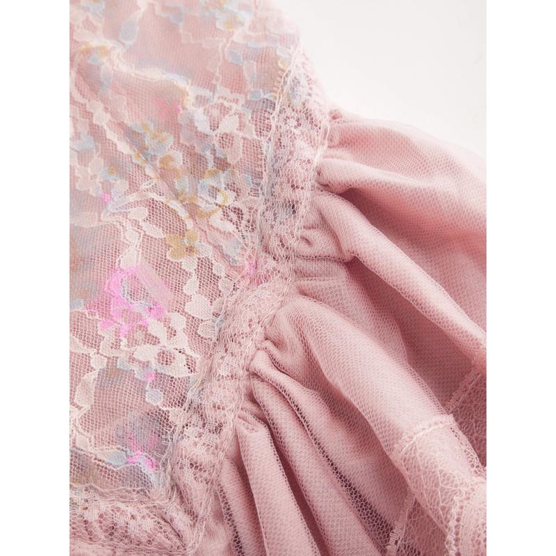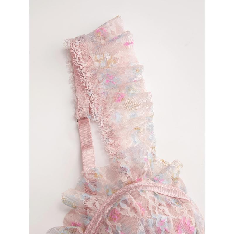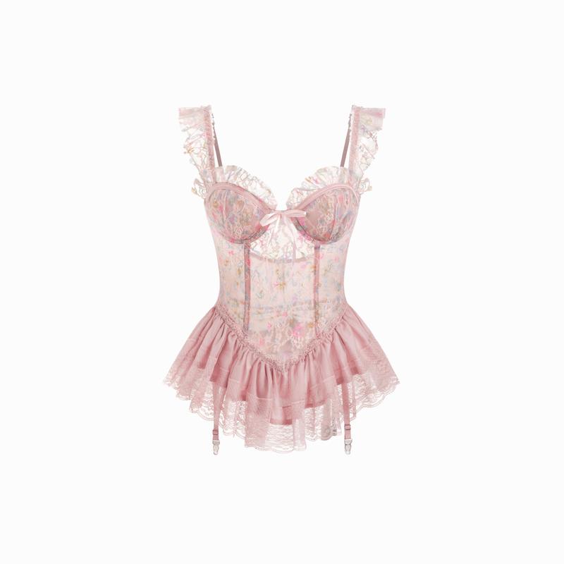 5. Cider Pink Floral Lace Boned Bustier Babydoll Dress - Sweet Ruffled Nightgown with Built-in Bra