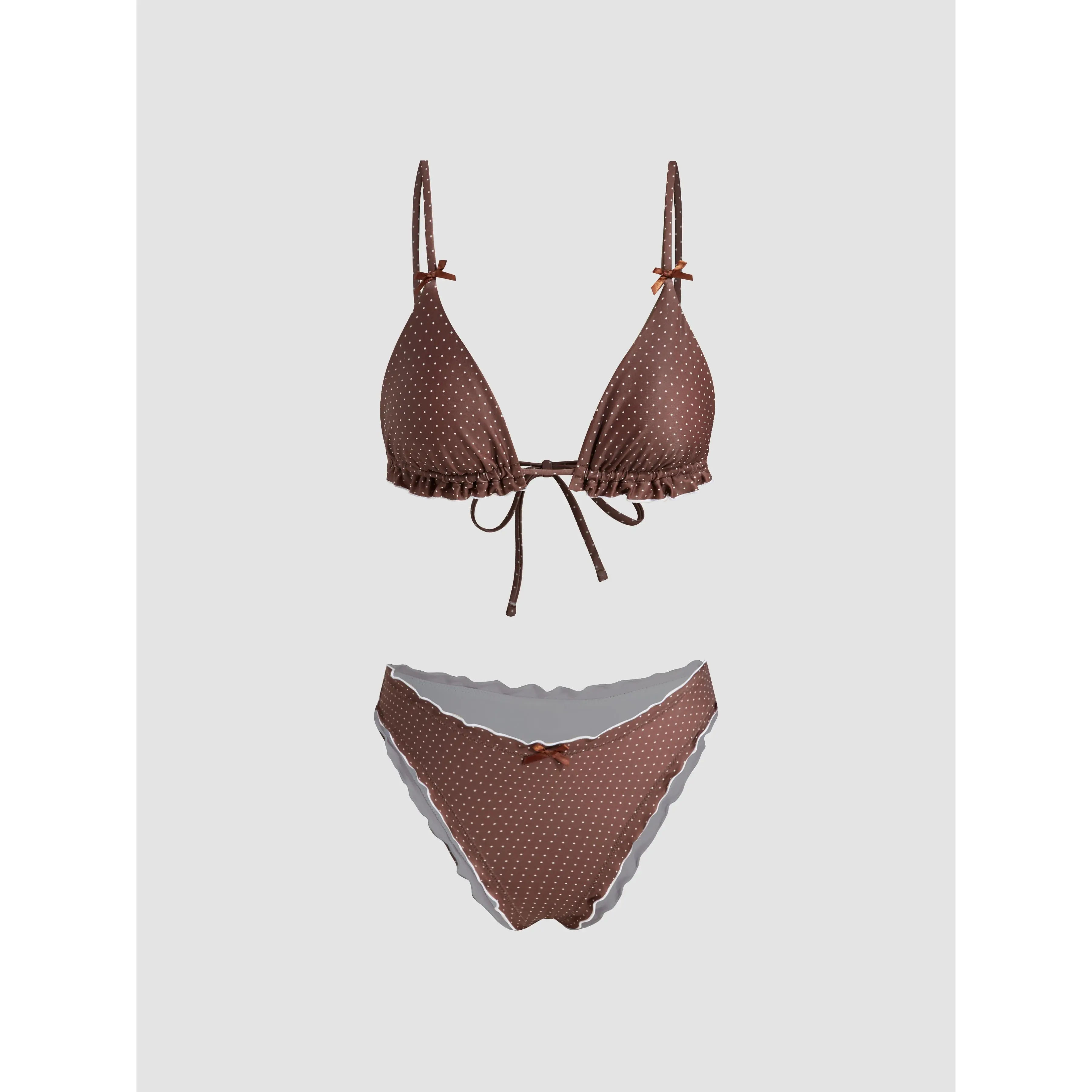 5. Cider V-neck Polka Dot Lettuce Trim Bowknot Halter Bikini Set