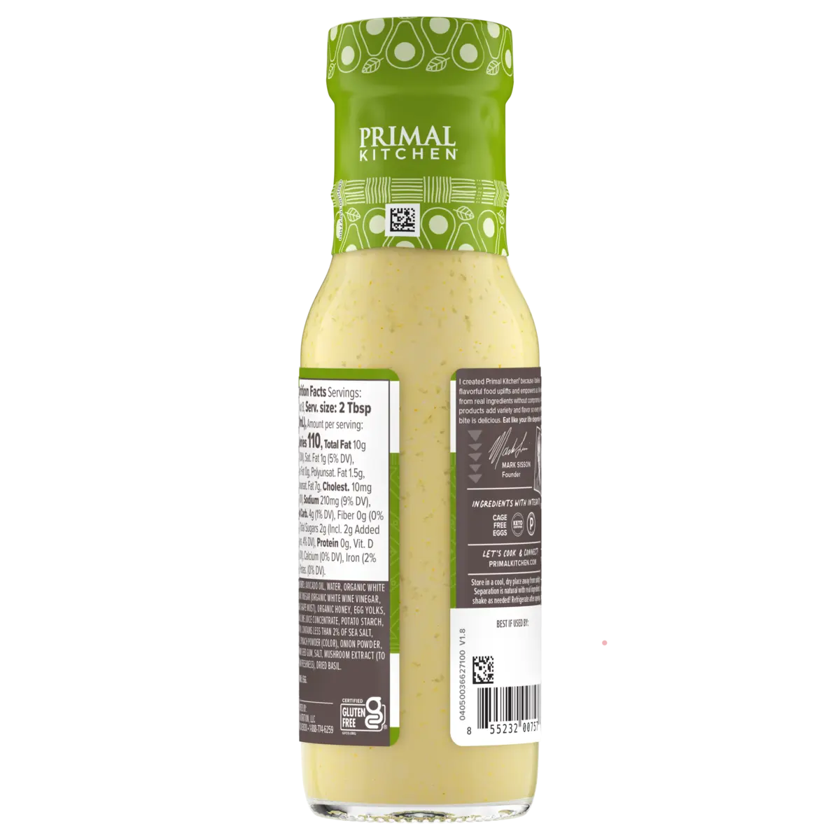 IngredientsAvocado Oil,Water,Organic White Balsamic Vinegar (Organic Wine Vinegar & Organic Grape Must),Organic Honey,Organic Egg Yolks,Organic Potato Starch,Organic Lime Juice Concentrate,Dried Cilantro,Sea Salt,Garlic,Spinach Powder (Color),Onion Powder,Tamarind Seed Gum,Salt,Mushroom Extract (To Maintain Freshness),Dried Basil