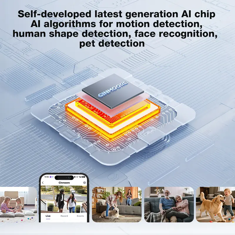 ✅ 360° Horizontal Rotation & 110° Vertical Tilt eliminate blind spots. Use the CINMOORE app to remotely control the camera's view and monitor every corner of your home in real-time. Stay connected and secure from any angle.