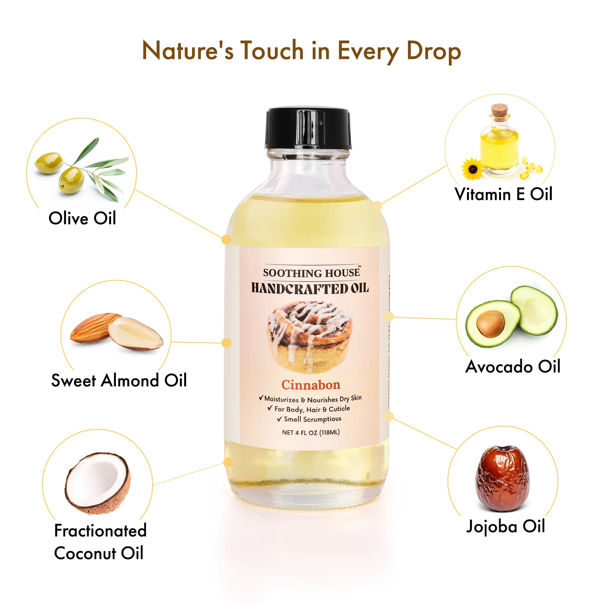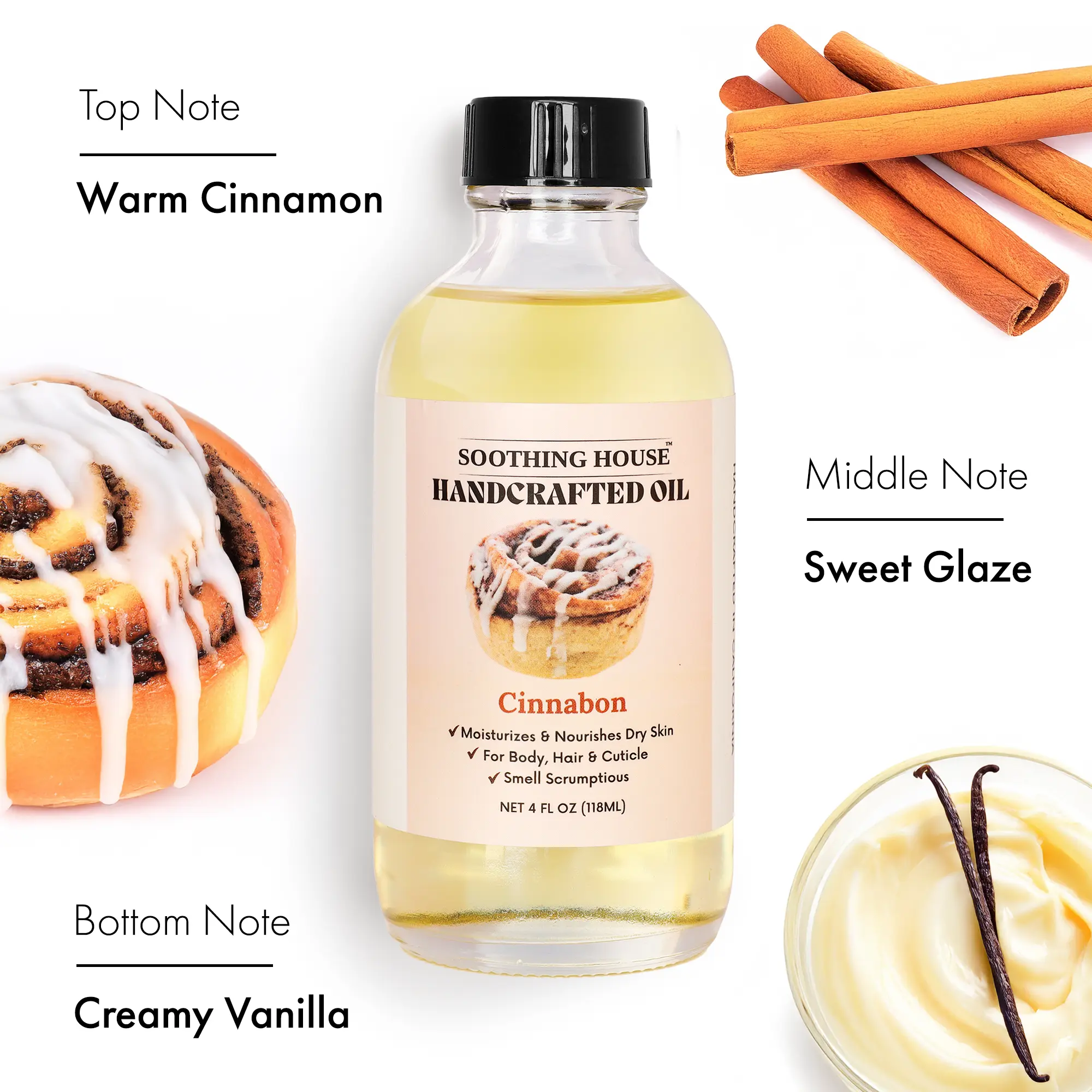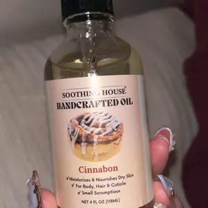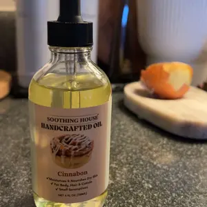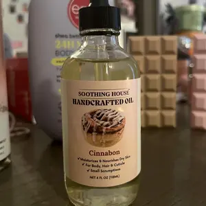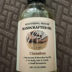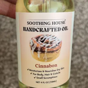 ·Soothing House Handcrafted Oil Cinnabon: Moisturizes & nourishes dry skin. Suitable for body, hair, and cuticle. Includes a small dropper for application. Net content: 4 FL OZ (118ML).