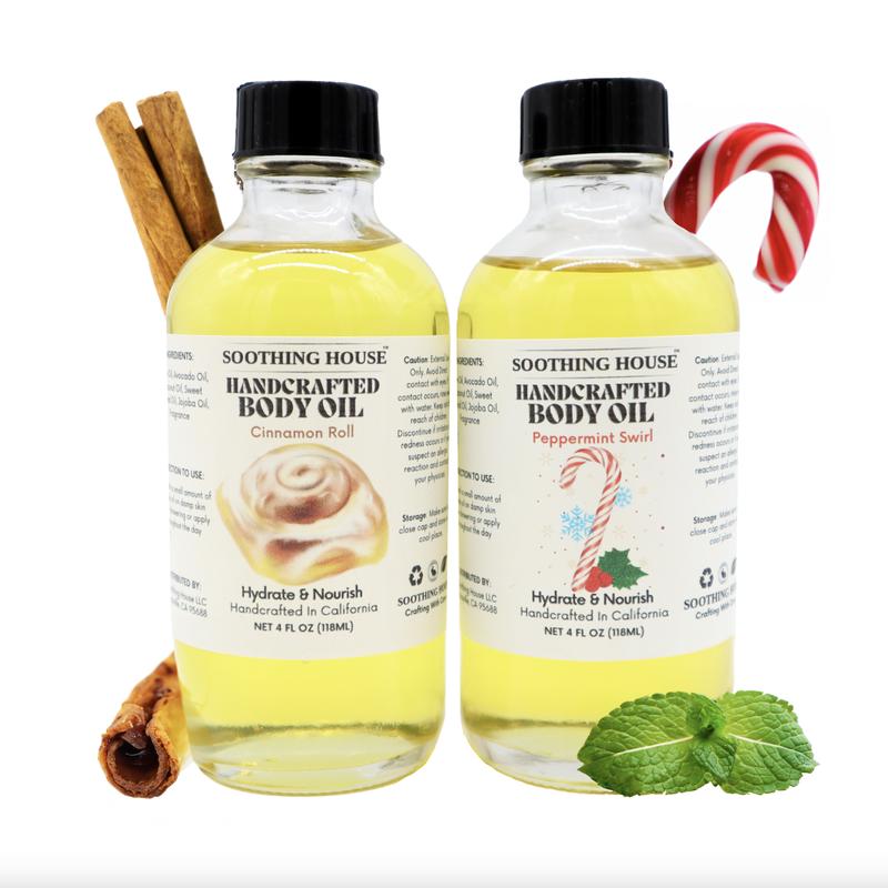 Give your skin the gift of joy and hydration this Christmas with our Peppermint Swirl & Cinnamon Roll Body Oil Bundle!