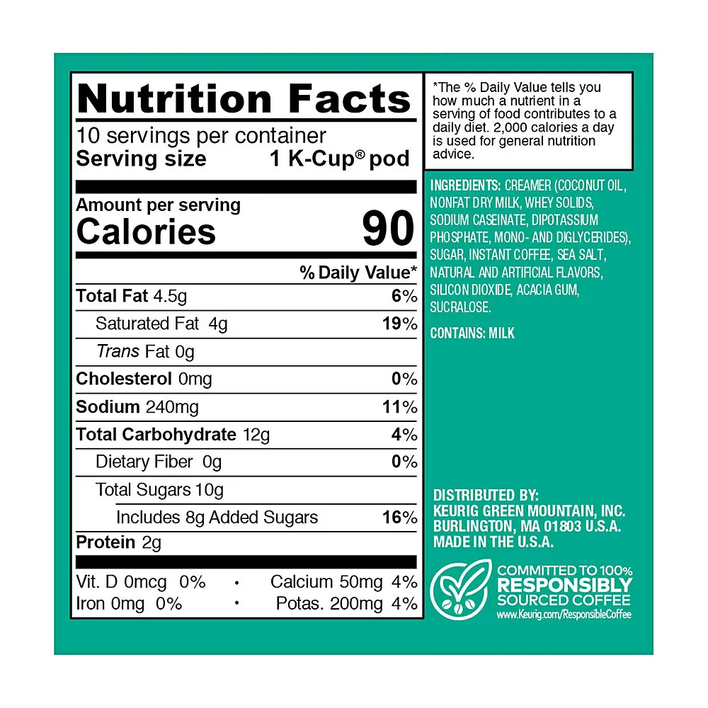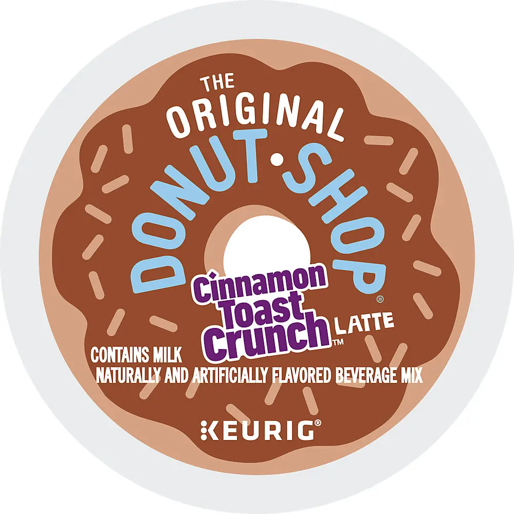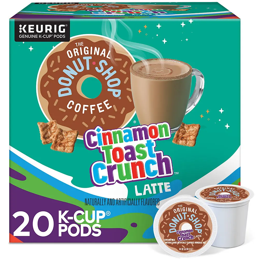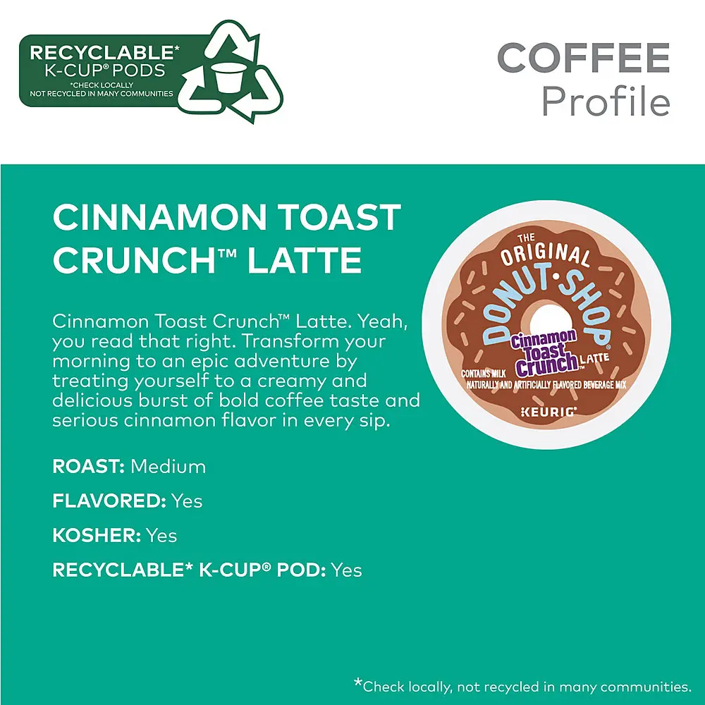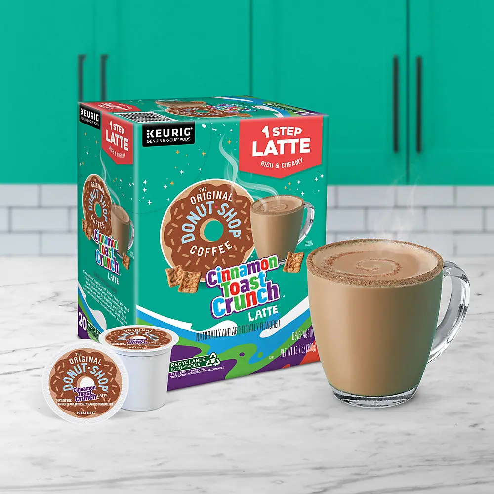 The Original Donut Shop® Coffee Cinnamon Toast Crunch™ One Step Latte. Yeah, you read that right. Transform your morning to an epic adventure by treating yourself to a creamy and delicious burst of bold coffee taste and serious cinnamon flavor in every sip. Your inner child called. They’re SUPER on board. Because it’s the taste you grew up loving, in a latte that you could only dream about — until now, that is. An irresistibly delicious way to pour even more Cinnamon Toast Crunch™ awesomeness into your everyday and turn your coffee break into an epic cinnamon-blasted fantasy come to life. Nothing beats a perfectly made latte. So rich. So creamy. And now — so easy! The Original Donut Shop® Coffee Cinnamon Toast Crunch™ One Step Latte K-Cup® pods are filled with coffee, flavoring, and sweetener — all in one! It’s so easy to make, you’ll be swimming in phenomenal flavor in a cinnamon minute. Each K-Cup® pod is filled with freshly ground coffee beans and brews a perfect, great-tasting cup of coffee, every time. These K-Cup® pods are compatible with all Keurig® single-serve coffee makers and brew up to 10 oz each. Simple. Delicious. And recyclable. * Enjoy the same great-tasting coffee you know and love, and when you’re done, just peel, empty, and recycle. • TASTE: Transform your morning to an epic adventure by treating yourself to a creamy and delicious burst of bold coffee taste and serious cinnamon flavor in every sip. • ROAST: This medium roast blend embodies two of the best things in life — great coffee and the classic taste of Cinnamon Toast Crunch™. • BREW SETTING: Just brew on the 10 oz setting and enjoy! Or for an even richer, more indulgent experience, brew on the 8 oz setting. • COMPATIBILITY: Contains genuine Keurig® K-Cup® pods, engineered for guaranteed quality and compatibility with all Keurig® single serve coffee makers. • RECYCLABLE* K-CUP® PODS: Simple. Delicious. And recyclable. Enjoy the same great-tasting coffee you know and love, and when you’re done, just peel, empty, and recycle. *Check locally, not recycled in many communities. The Original Donut Shop Cinnamon Toast Crunch™ Latte 60 Count K-Cup® Pods Box