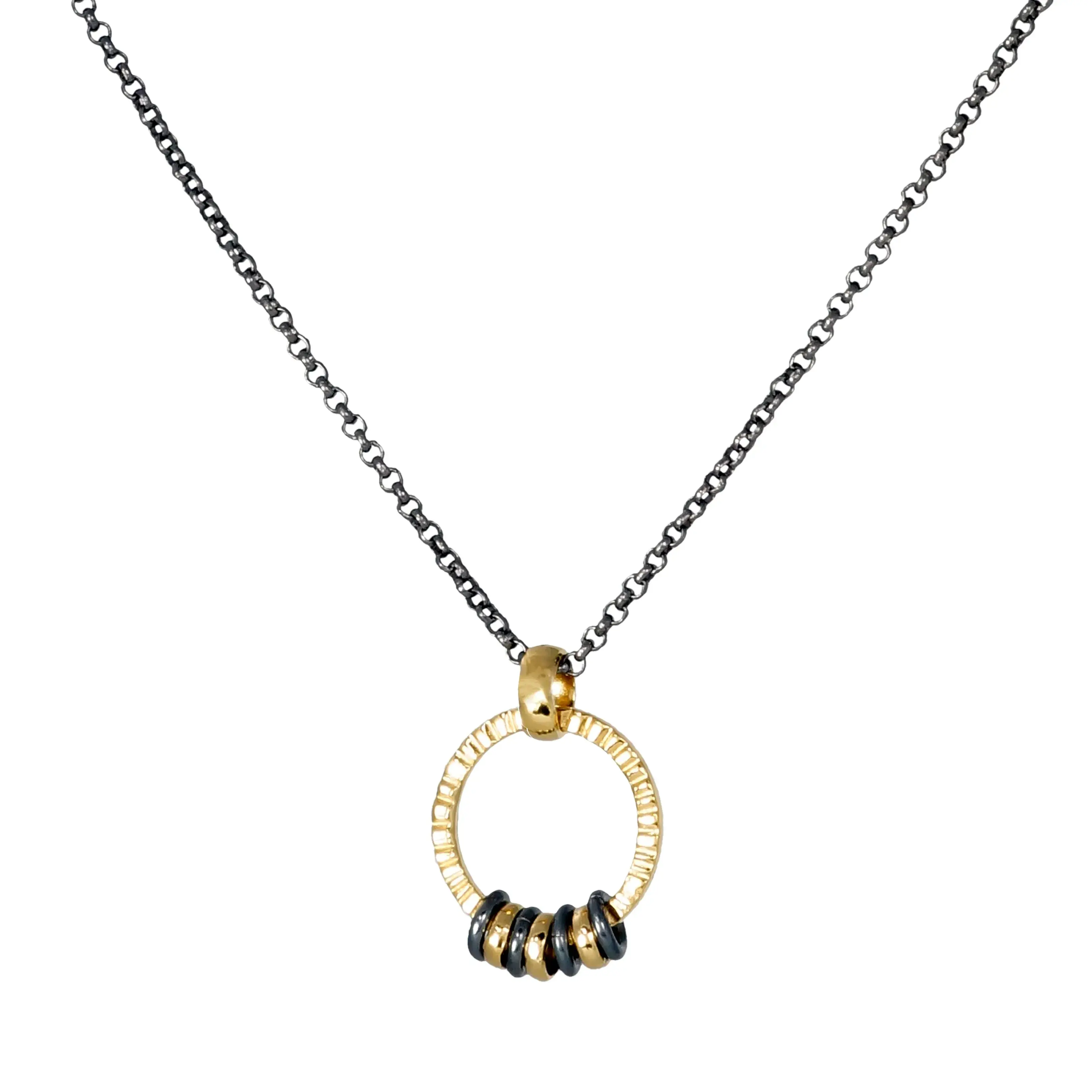 A golden hammered circle embellished with dancing ringlets of black and gold adds the perfect touch of shimmer. The clean, minimalist look of this necklace is classic and versatile.