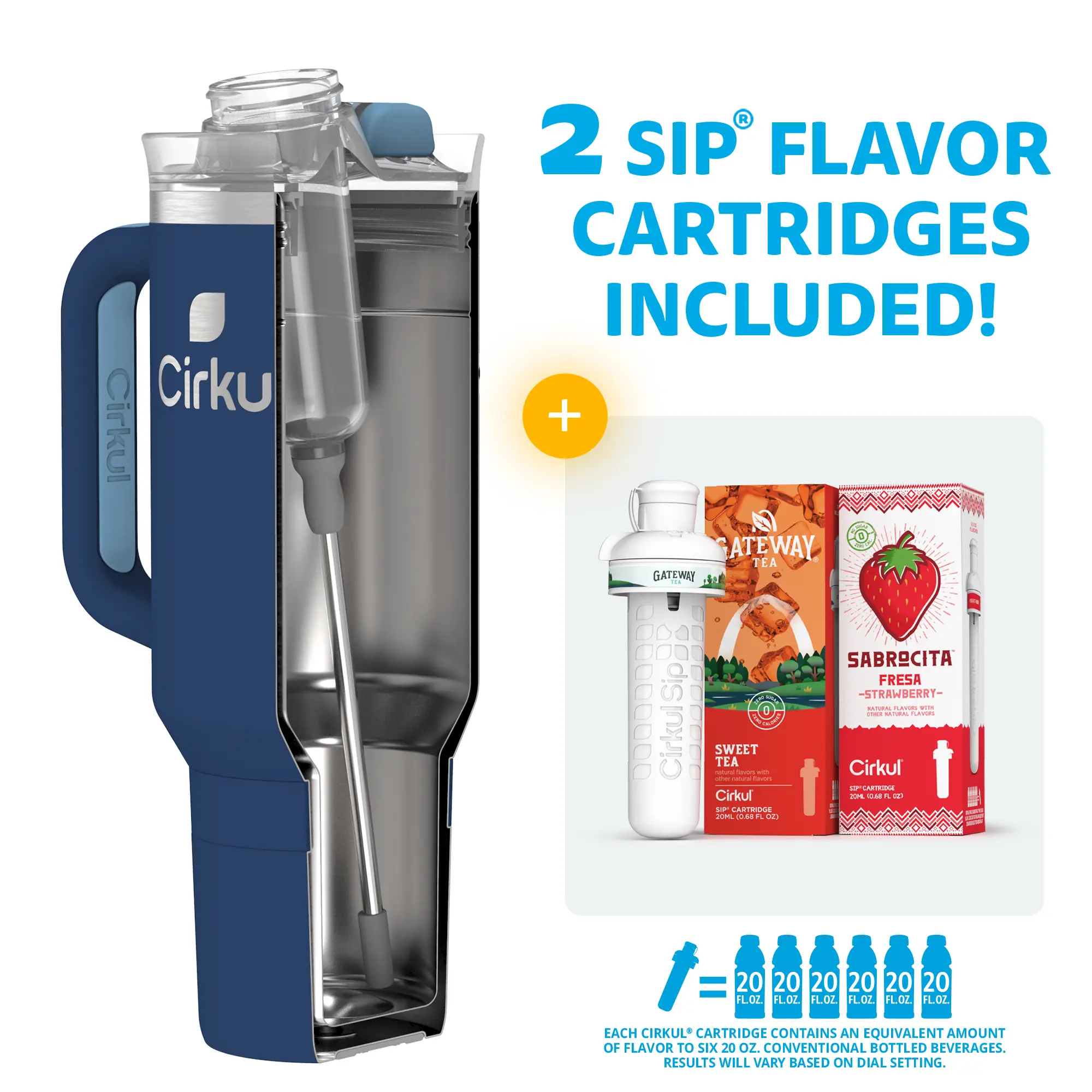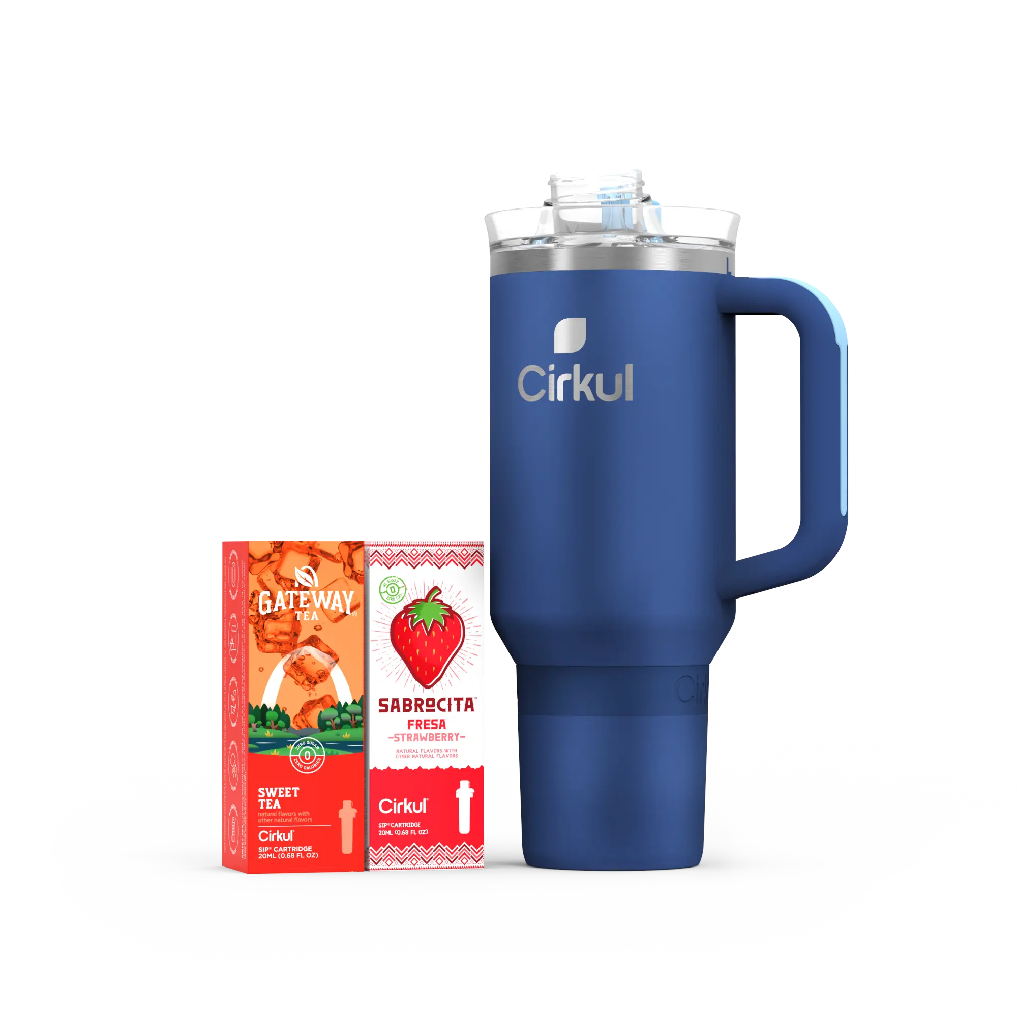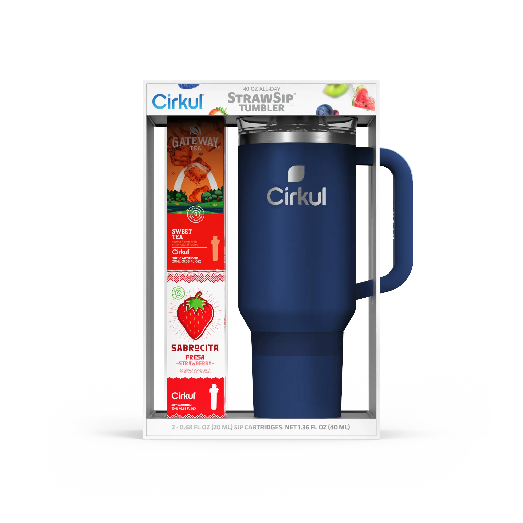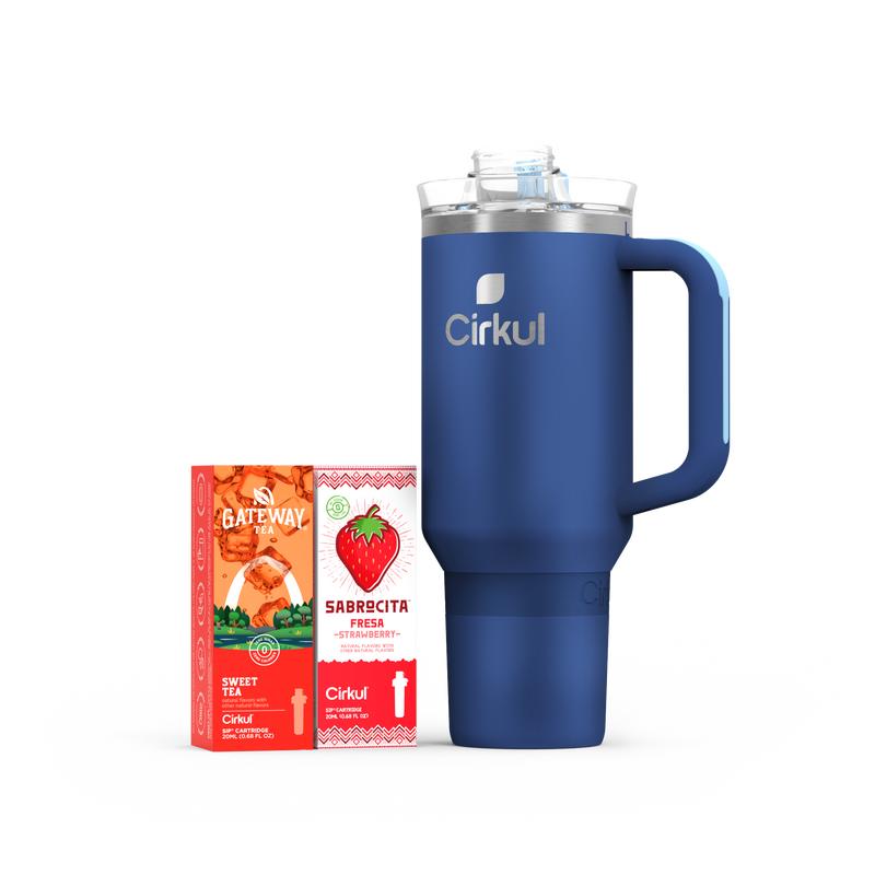 Ready to elevate your water game? This 40oz. Midnight Blue All-Day StrawSip Tumbler Starter Kit is your perfect introduction to Cirkul. It includes an innovative water bottle and 2 flavor cartridges: Gateway Sweet Tea and Sabrocita Strawberry. No sugar, zero calories, and no artificial colors. Enjoy personalized, delicious hydration!