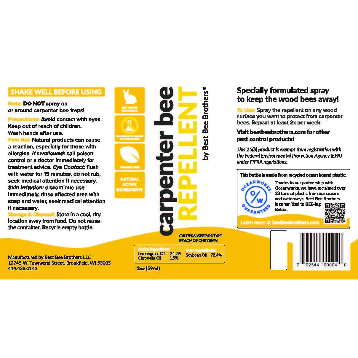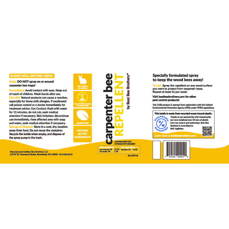 ·Peace of Mind: If you’re battling a carpenter bee infestation this season, we’d say citronella and lemongrass! Best Bee Brothers® Carpenter Bee Repellent Spray is made with natural active ingredients proven to deter even the most persistent carpenter bees.