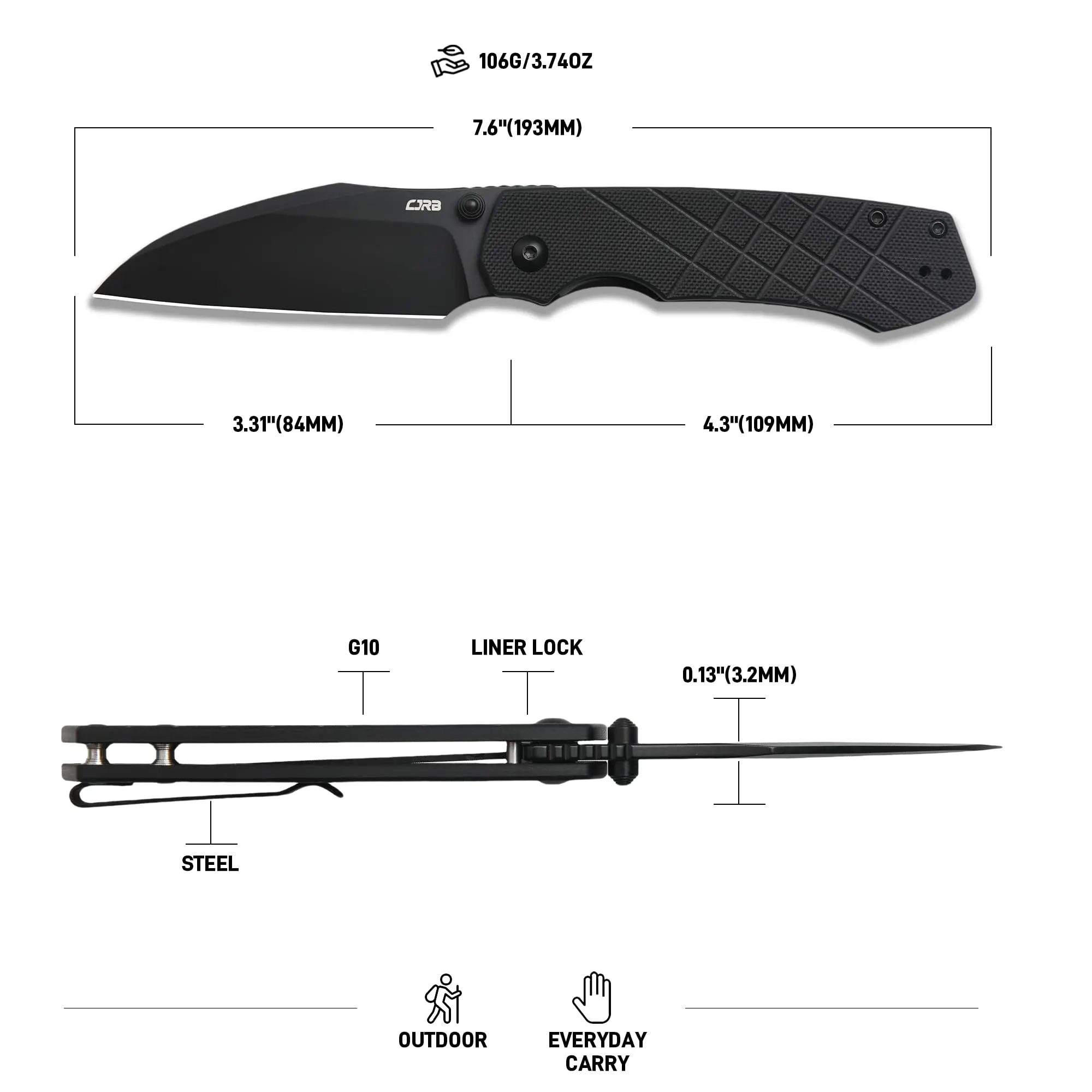 ·G10 Handle: The CJRB Kestrel pocket knife features a G10 handle that is heat resistant, waterproof, durable, and lightweight. With ergonomic design, we milled in some light texture that provides the perfect amount of grip