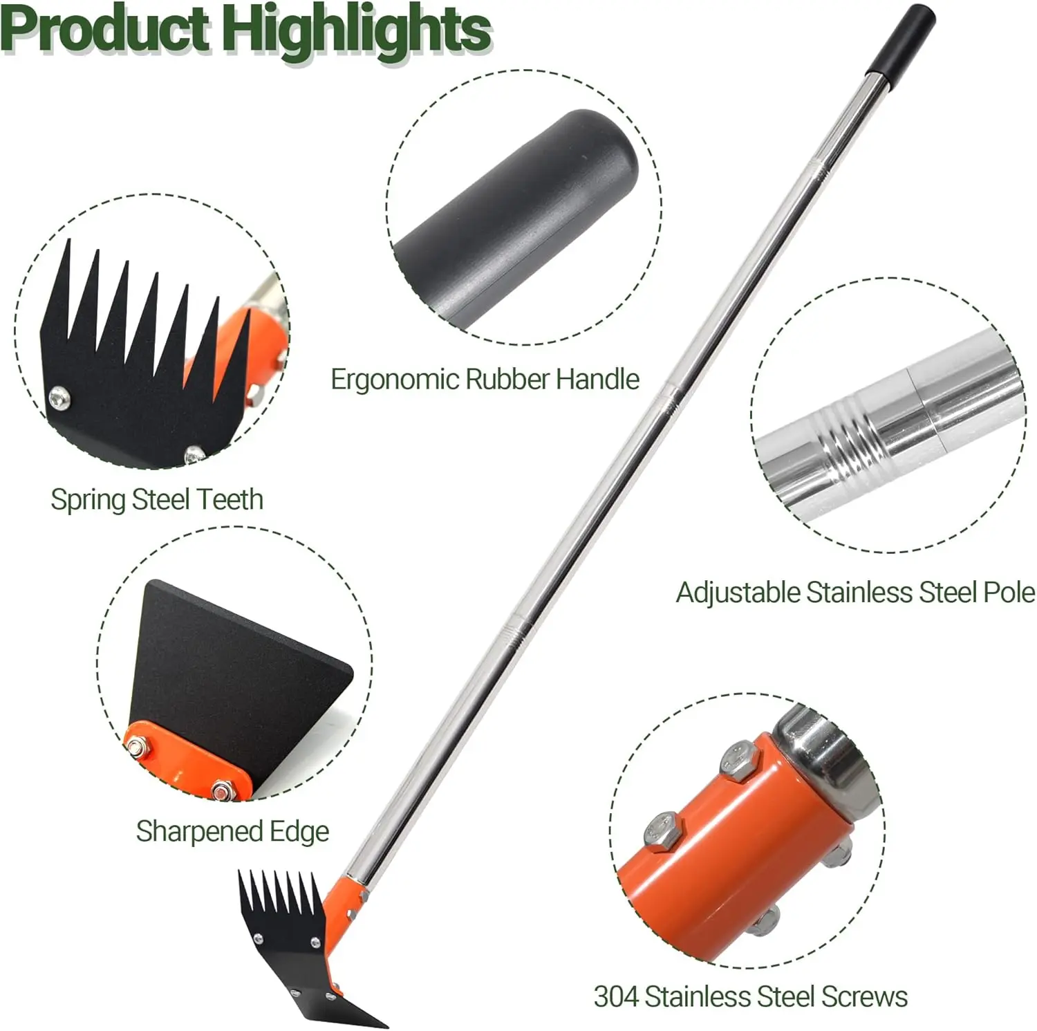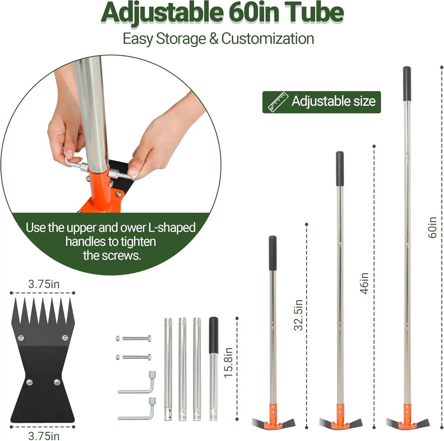 The handle is built from 4 screw-tight stainless steel sectionsAdjustable stainless steel long handle is adjustable to be 32.5 inch , 46inch and 60 inch, which is convenient to use when standing or sitting down.