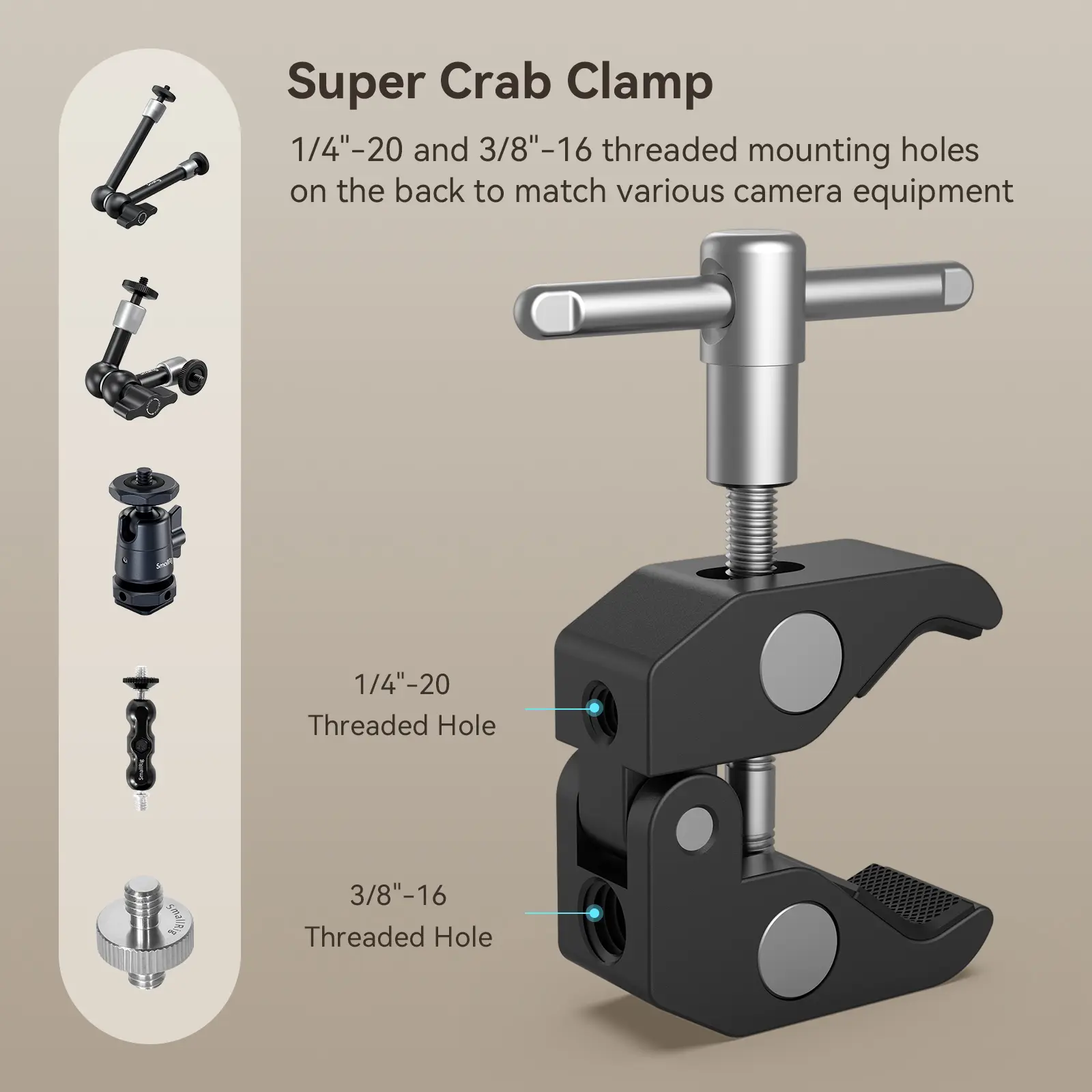 Ever struggled to get your camera gear or lights positioned just right? Meet the SmallRig Clamp with an articulating magic arm, your new best friend for flexible mounting. This setup includes a super clamp that fits surfaces and rods from 15mm to 54mm wide, plus a 9.8-inch arm with dual 360° rotation ball heads. Made from lightweight aluminum alloy, itās tough yet easy to handle. Rubber cushions on both the clamp and arm protect your precious monitors and accessories from scratches while keeping everything locked in place. Whether youāre attaching LCD monitors, LED lights, microphones, or flash units, this versatile combo has you covered. The clamp supports both 1/4" and 3/8" threads, making it compatible with a wide range of photography and videography gear. In the box, you get a sturdy super clamp and the articulating magic arm ready to boost your creative setup. Upgrade your rig and free your creativity with this durable, protective, and flexible mounting solution. Grab yours now and start shooting like a pro!
