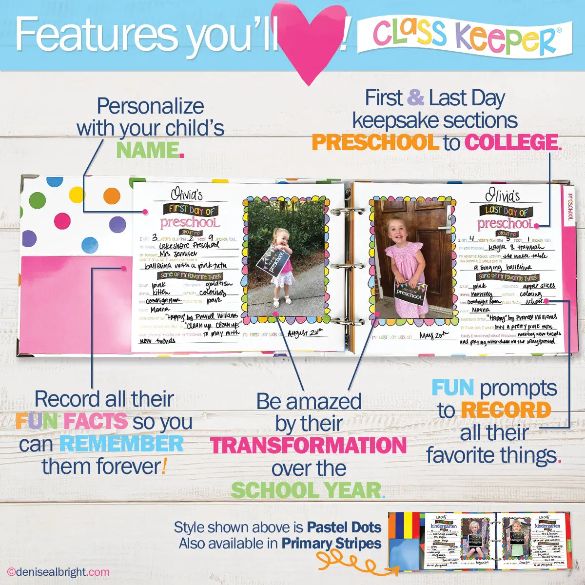 The Class Keeper® is more than a scrapbook; it’s an easy-to-use, creatively compact memory book that helps you and your child preserve the best moments of their school journey. With its simple templates and thoughtful design, you’ll create a treasured keepsake to enjoy for years to come.