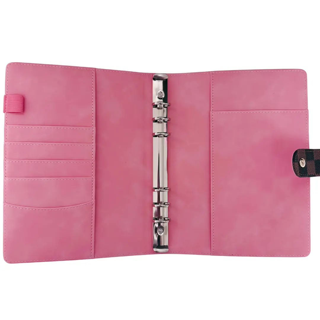 The Classic Checkerboard Leather Binder A5 6-Ring offers a timeless look. Its checkerboard pattern adds a touch of sophistication. The A5 size ensures it fits neatly in your bag. The 6-ring binding provides secure closure. Perfect for organizing notes or small documents.