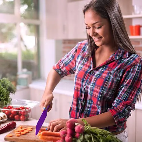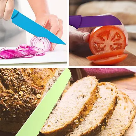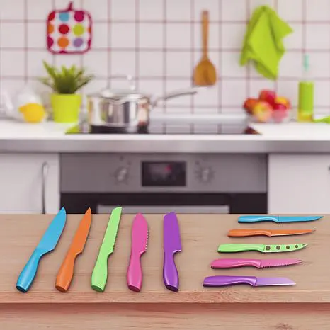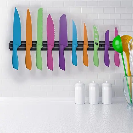 Classic Cuisine 10-piece Multi-Colored Knife Set with Magnetic Bar How many times have you cut food and not recalled which knife you used? This durable stainless steel cutlery set solves the dilemma with colored nonstick coatings. They brighten your kitchen and also help you remember which knife was used on meats and vegetables, helping prevent cross contamination. The handy magnetic knife bar keeps knives safely organized so you can easily and quickly select the appropriate knife. Now you're set to prepare your next great meal. What You Get 8" Chef's knife 8" Slicing and carving knife 7-1/2" Bread knife 6-1/2" Santoku knife 6-1/2 Serrated utility knife 5-1/2 Half serrated cutlet knife 5" Straight edge utility knife 4-1/2" Cheese knife 4" Tomato knife 3-1/2" Vegetable knife 21-1/2 Magnetic knife bar 2 Anchors and 2 screws for mounting magnetic knife bar