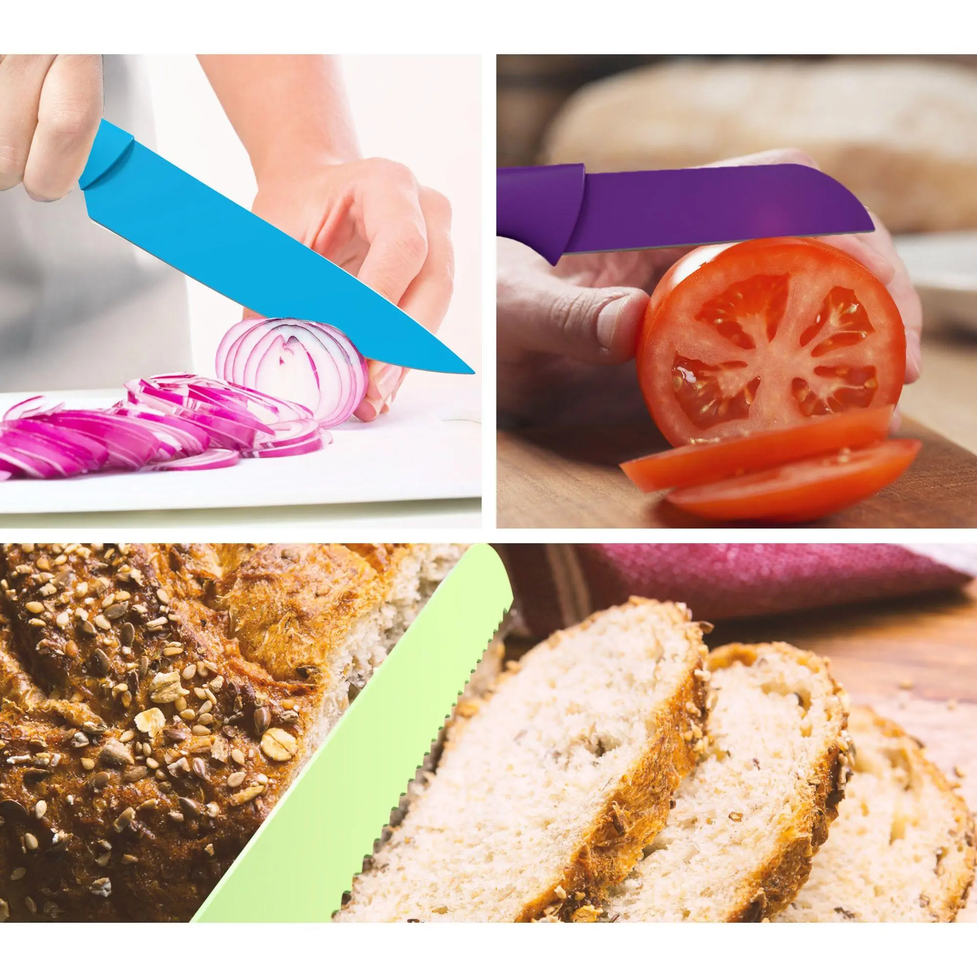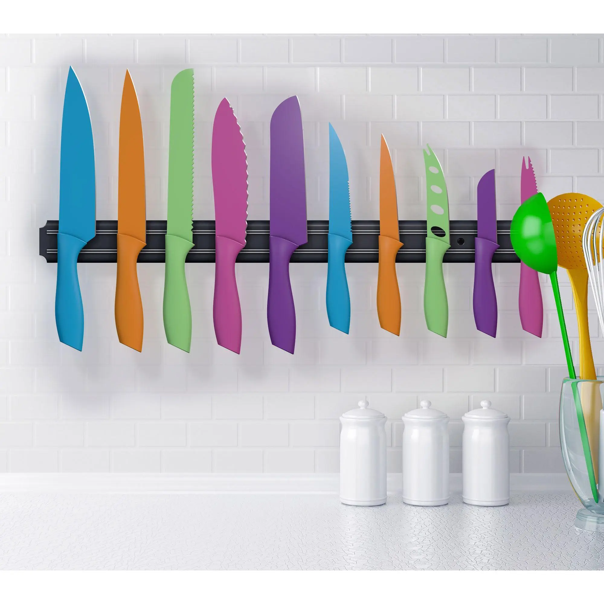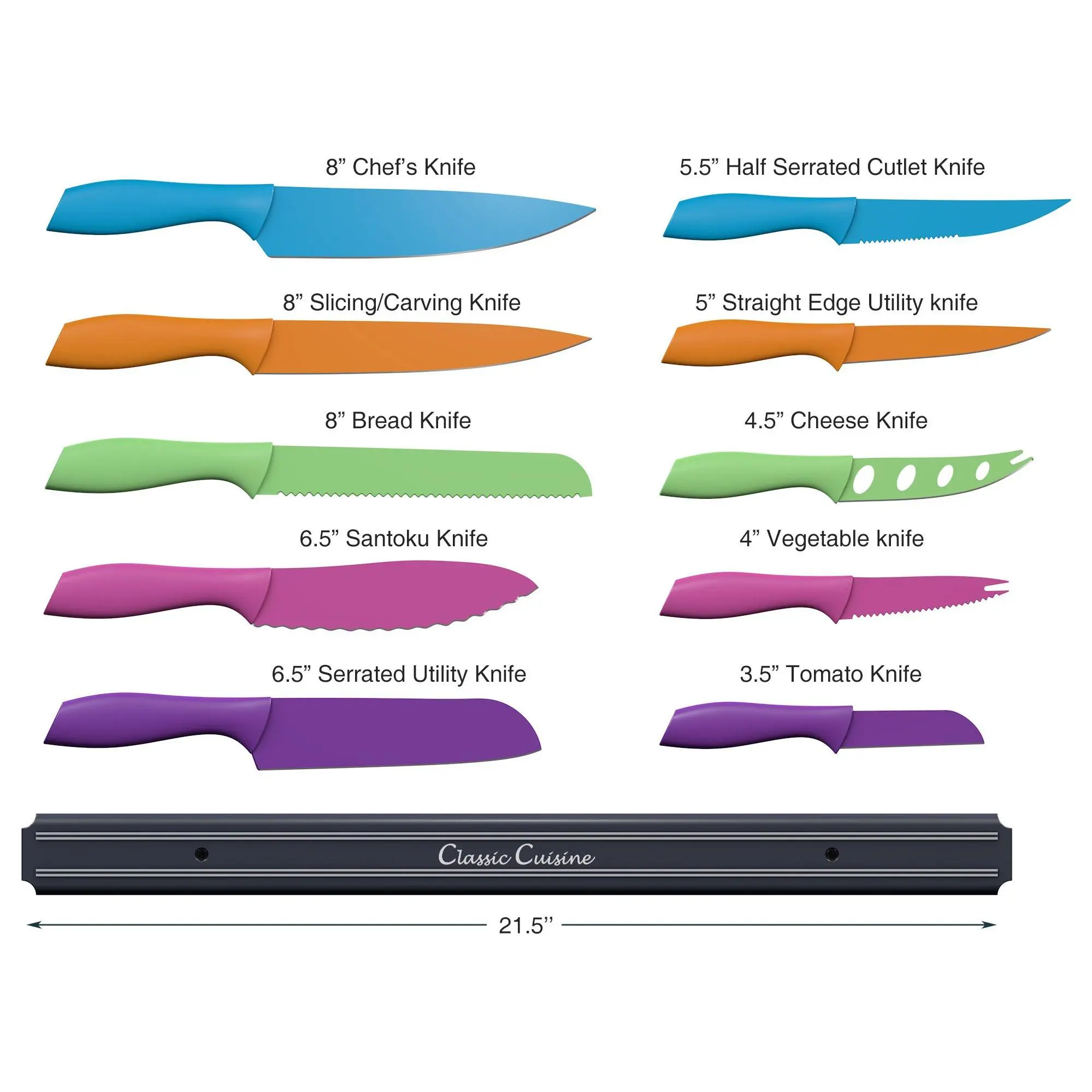·Set includes 8"L chef's knife, 8"L carving knife, 8"L bread knife, 6.5"L Santoku knife, 6.5"L serrated utility knife, 5.5"L half-serrated cutlet knife, 5"L straight edge utility knife, 4.5"L cheese knife, 3.5"L tomato knife, 4"L vegetable knife, 21.5"L magnetic knife bar, two anchors and two screws for mounting knife bar