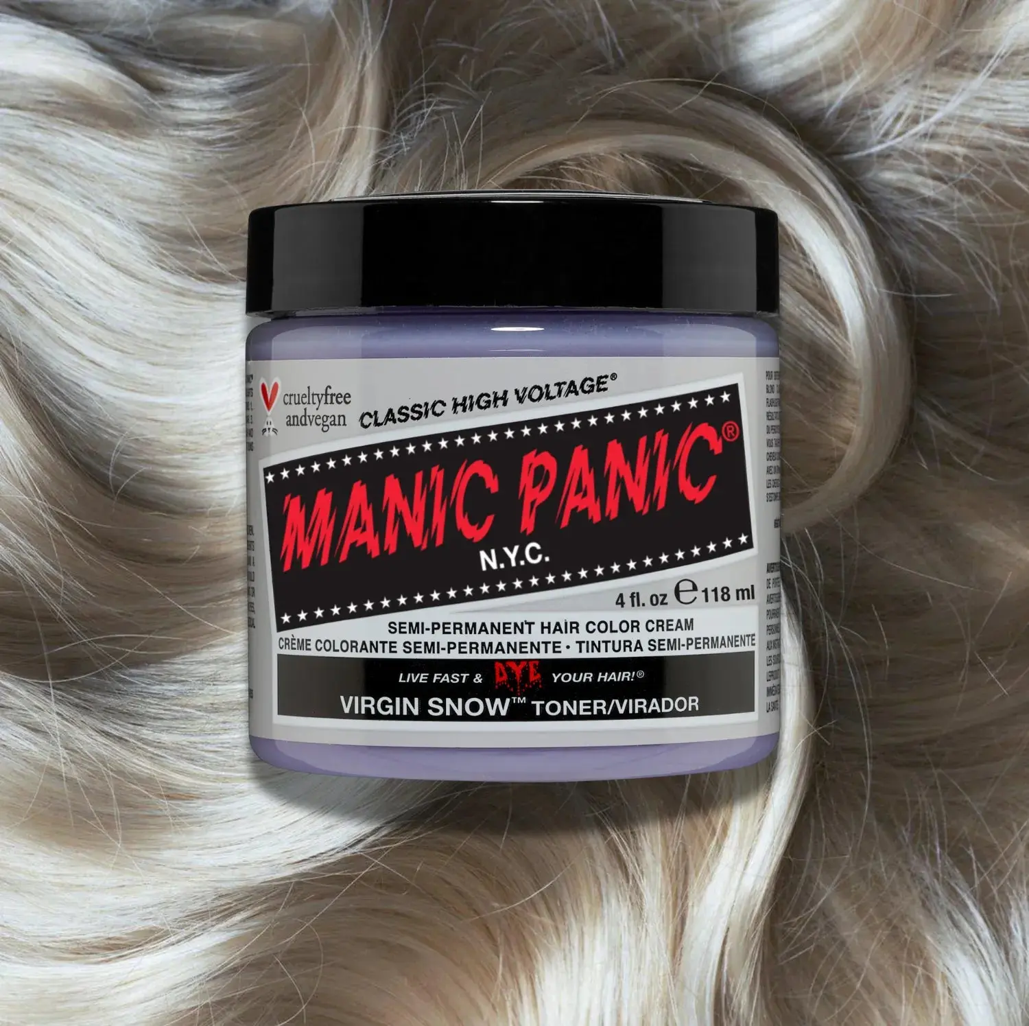 Virgin Snow is a blue-tinted toner designed to help eliminate brassy tones on the lightest level 10 blonde. Virgin Snow, like all our shades, doubles as a deep conditioning mask while dyeing your hair. Pastels/Greys/Toners contain less pigment than our vivid shades and will fade from your hair faster.