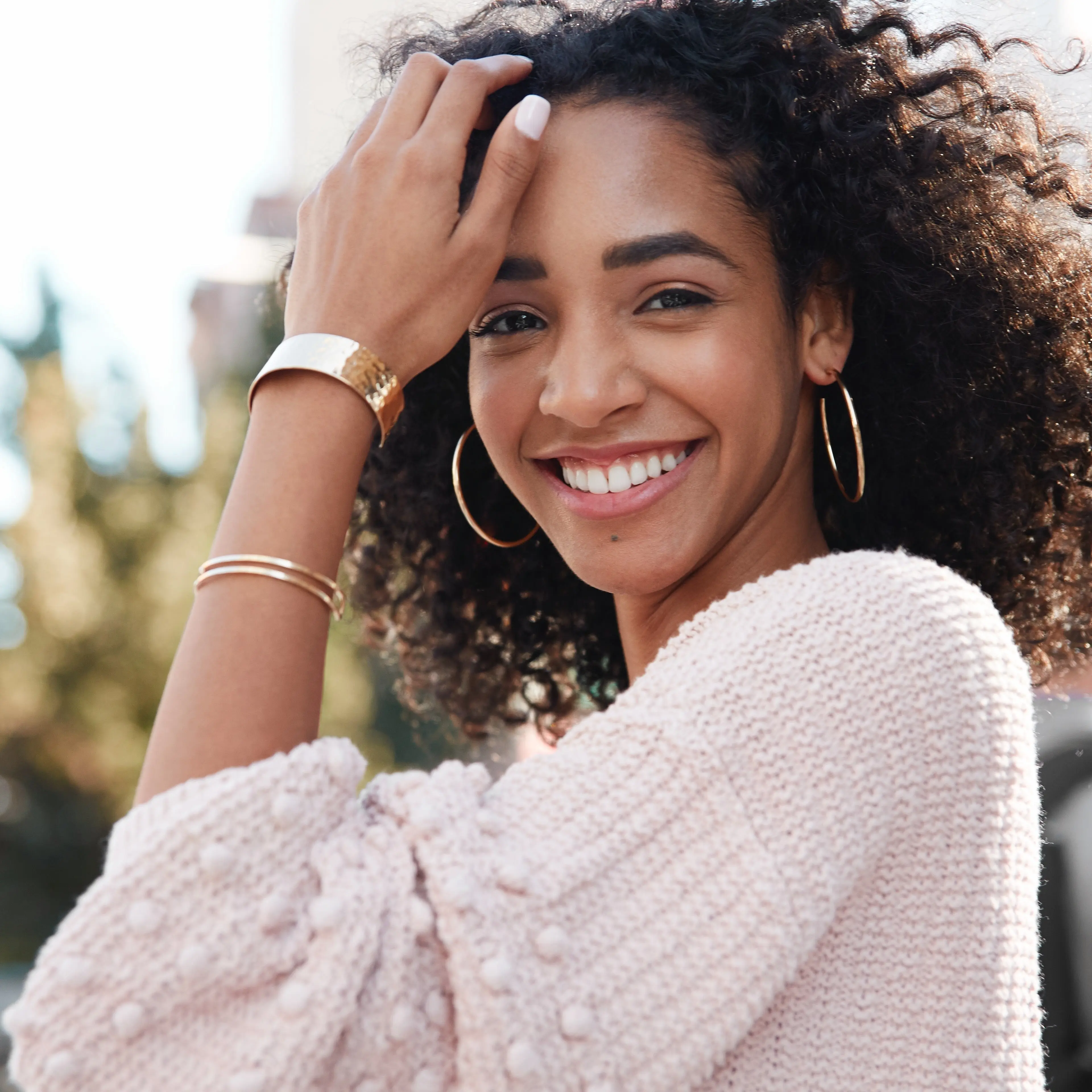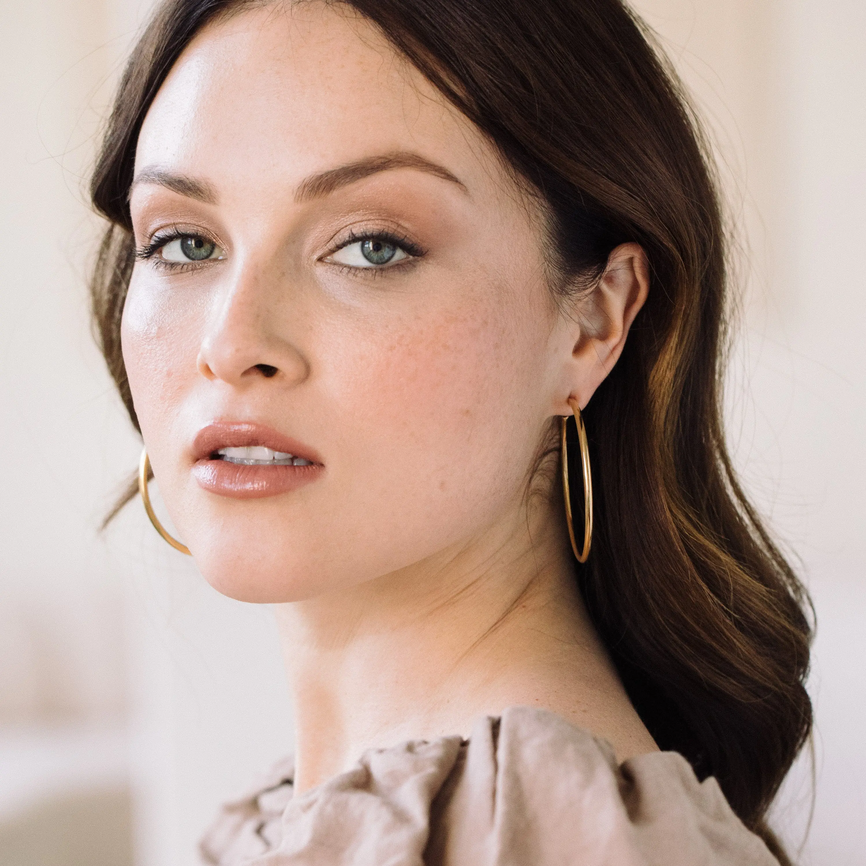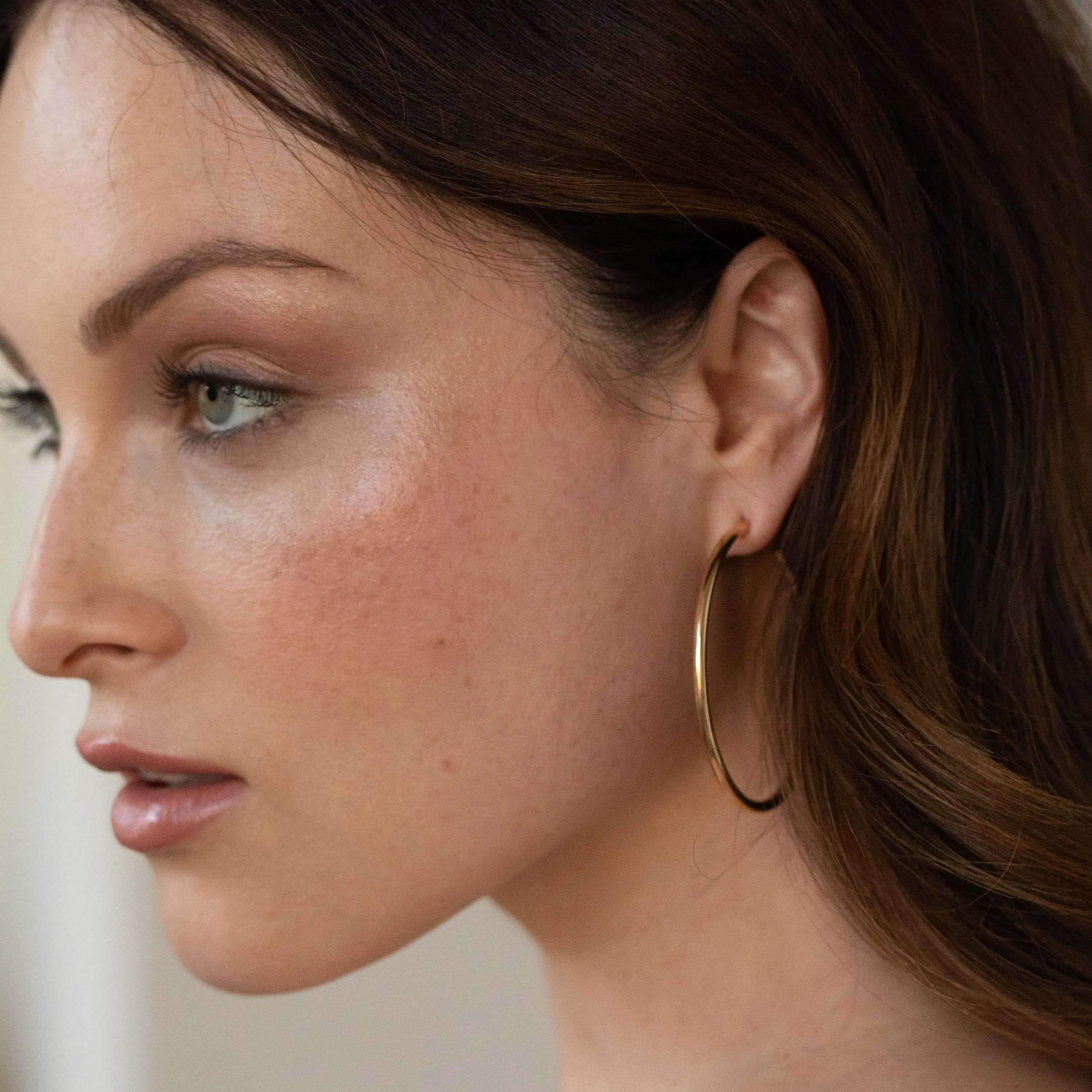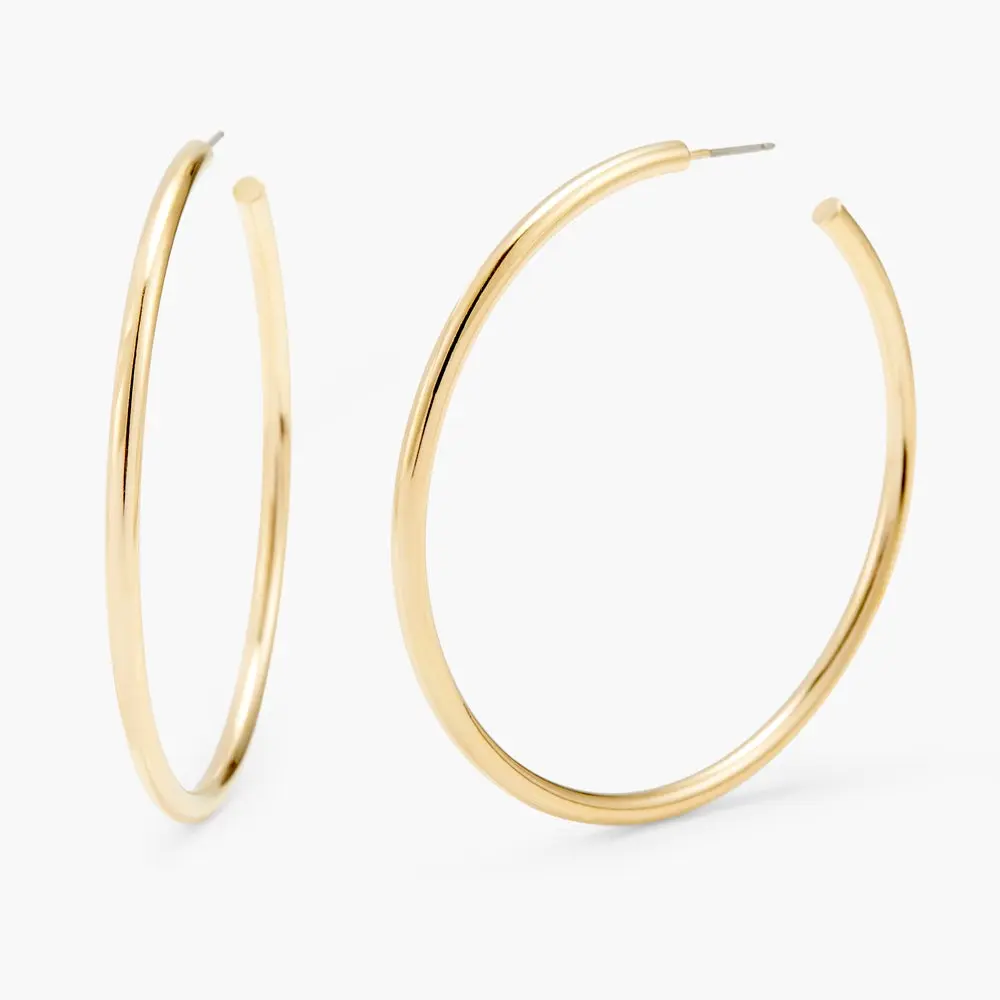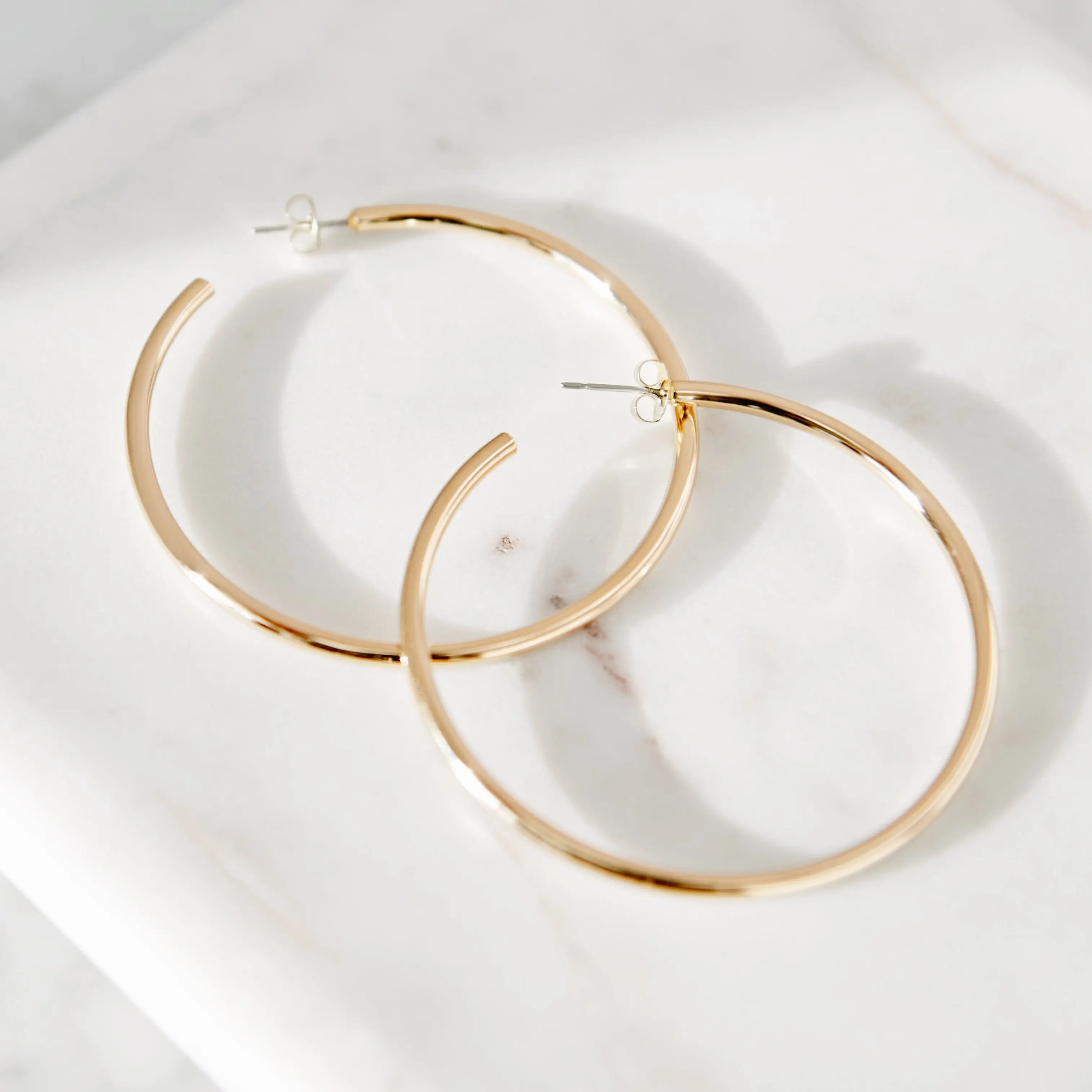 No woman’s wardrobe is complete without a quintessential pair of hoops. The Hayley Classic Hoops, crafted from 14k gold-plated brass, are a timeless addition that effortlessly brightens up any outfit. With a versatile 2-inch diameter, these medium-sized hoops are perfect for both day and night, offering a chic and polished look. The stainless steel post with a friction back ensures a secure fit and lasting comfort.