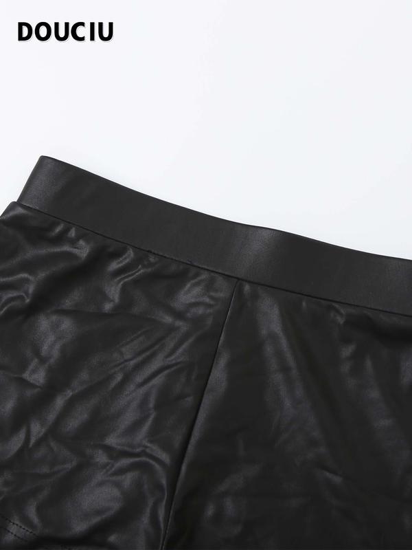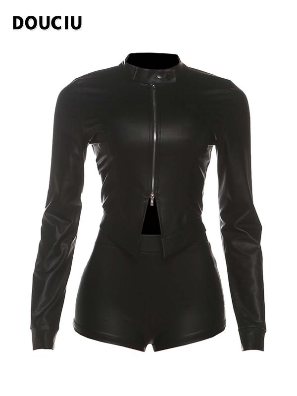 DOUCIU Classic Retro Matte Tight Sexy Hot Street Personality Cool Versatile Bar Party Women'S Thin Solid Color Zipper Long-Sleeved Top Shorts Two-Piece Set