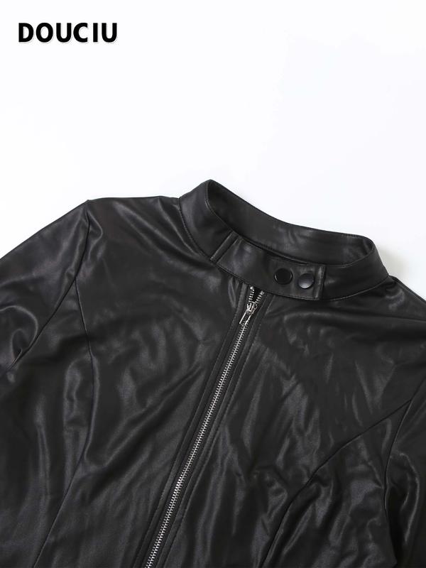 5. DOUCIU Classic Retro Matte Tight Sexy Hot Street Personality Cool Versatile Bar Party Women'S Thin Solid Color Zipper Long-Sleeved Top Shorts Two-Piece Set