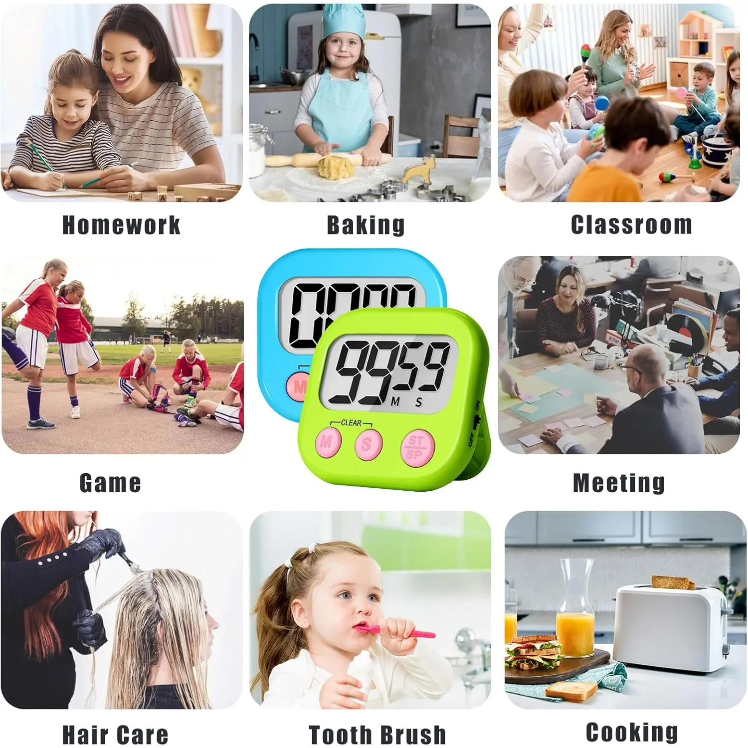 Multiple occasions: timers can be in classrooms, homework, reading, , brushing , kitchen, exercise, and .