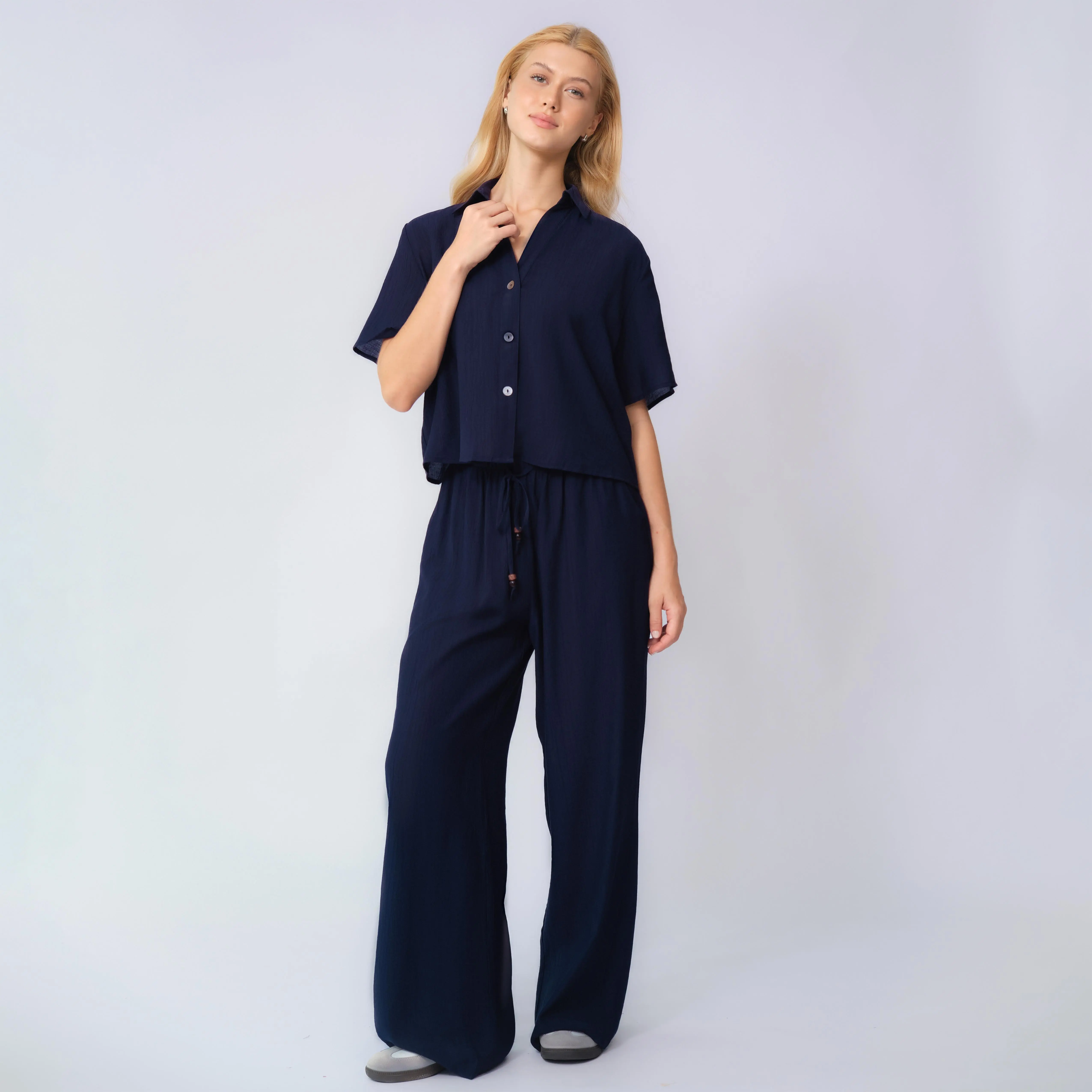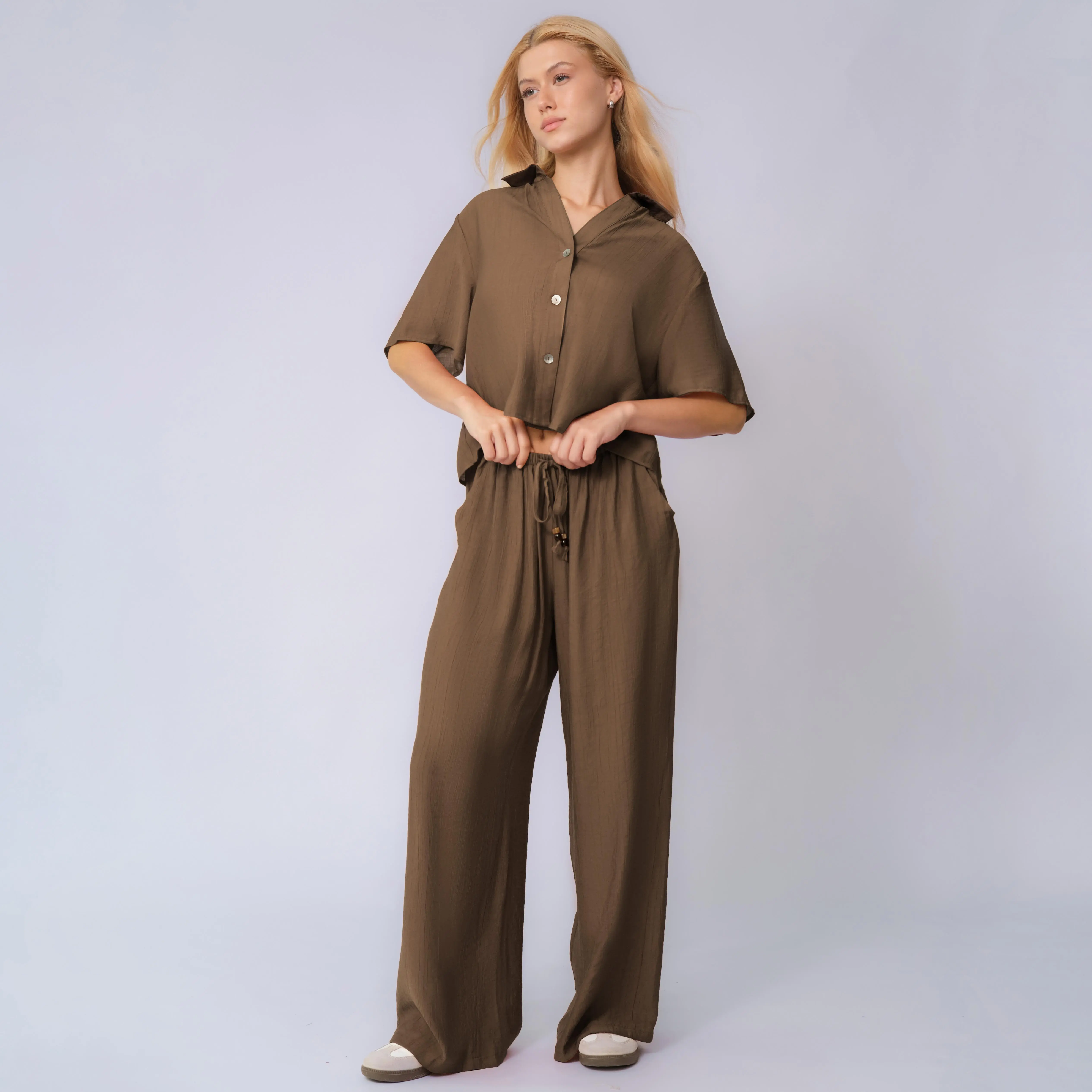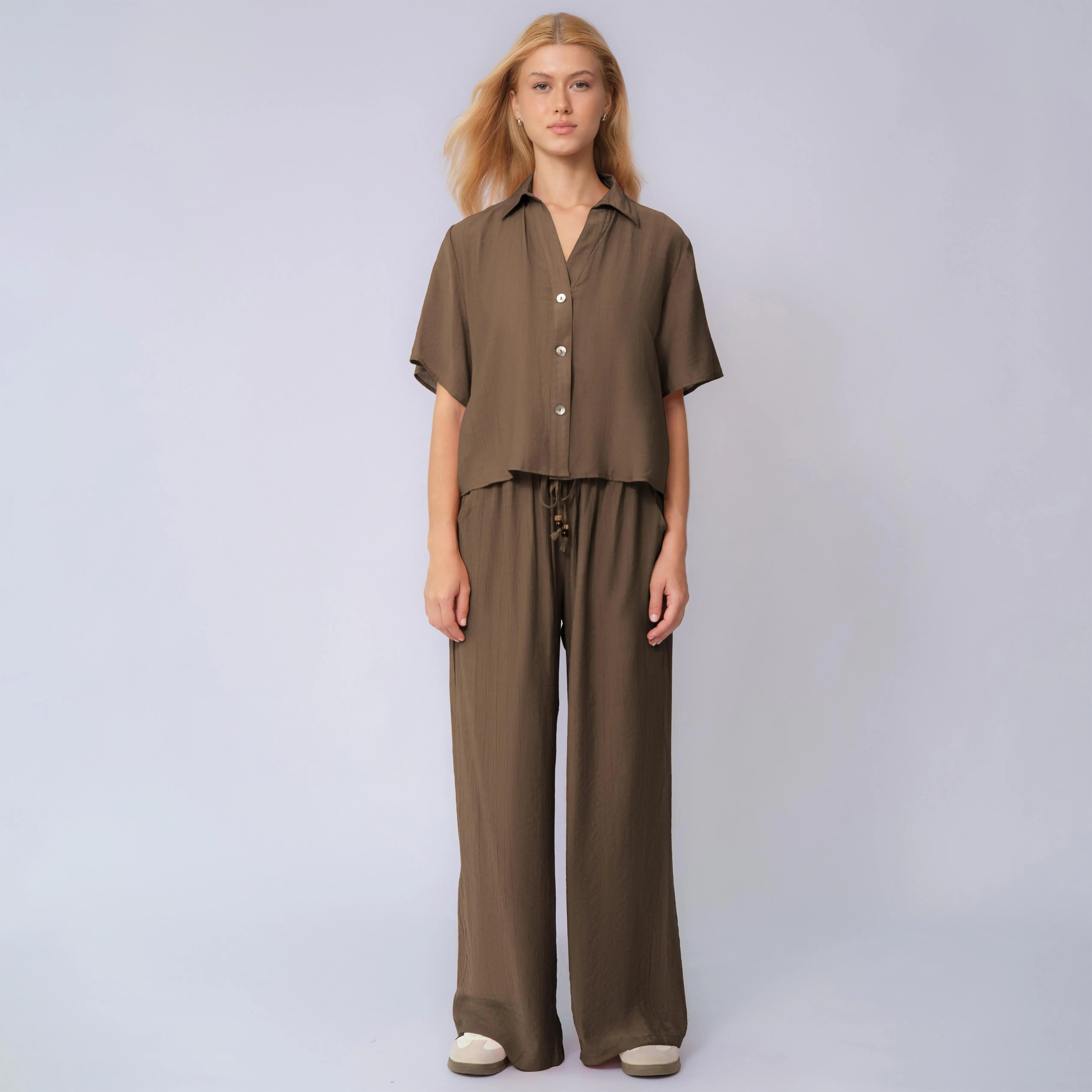 KatchMe Women's Classy Solid Color Collared Shell Button Loose Top & Drawstring Wide Leg Trousers Co-ord