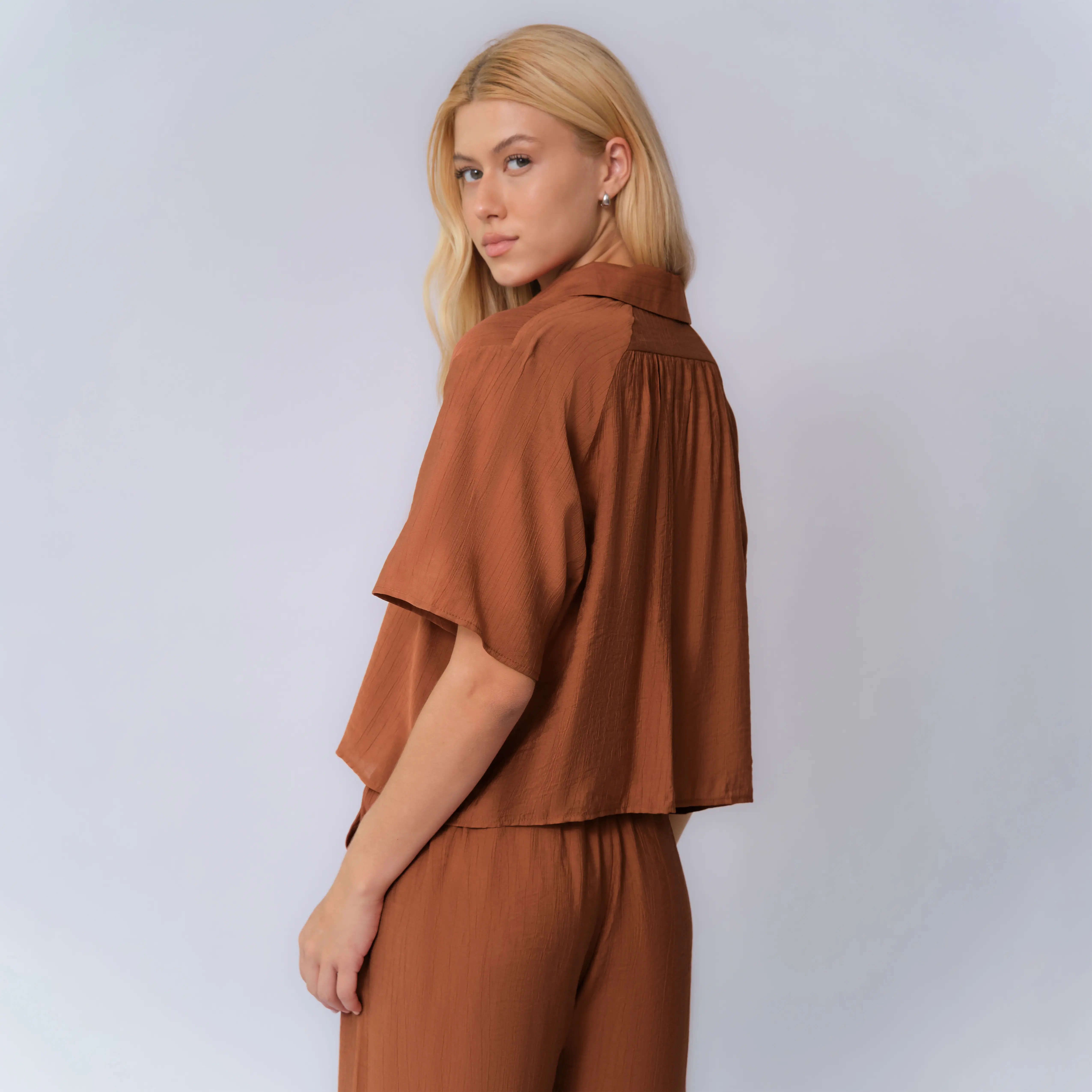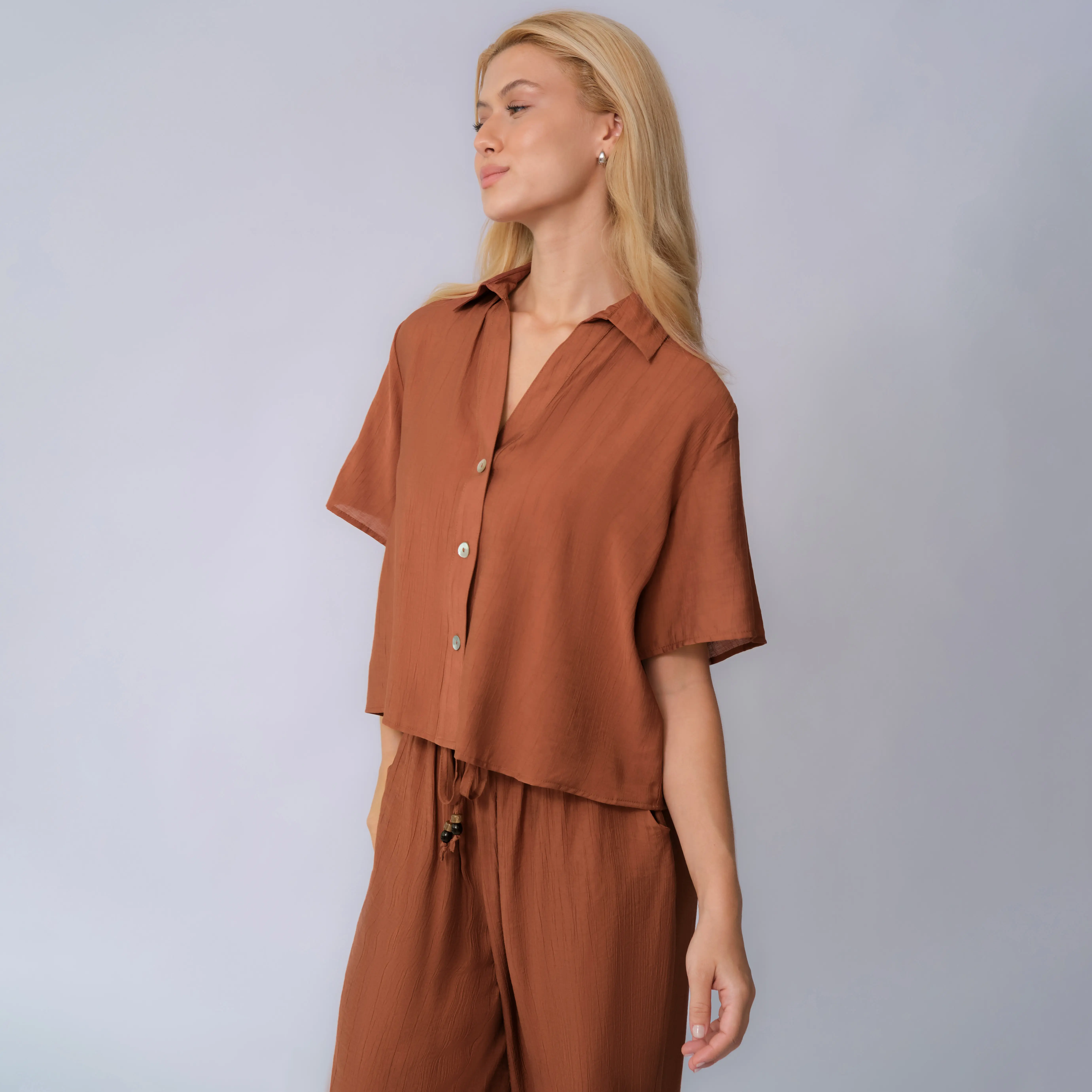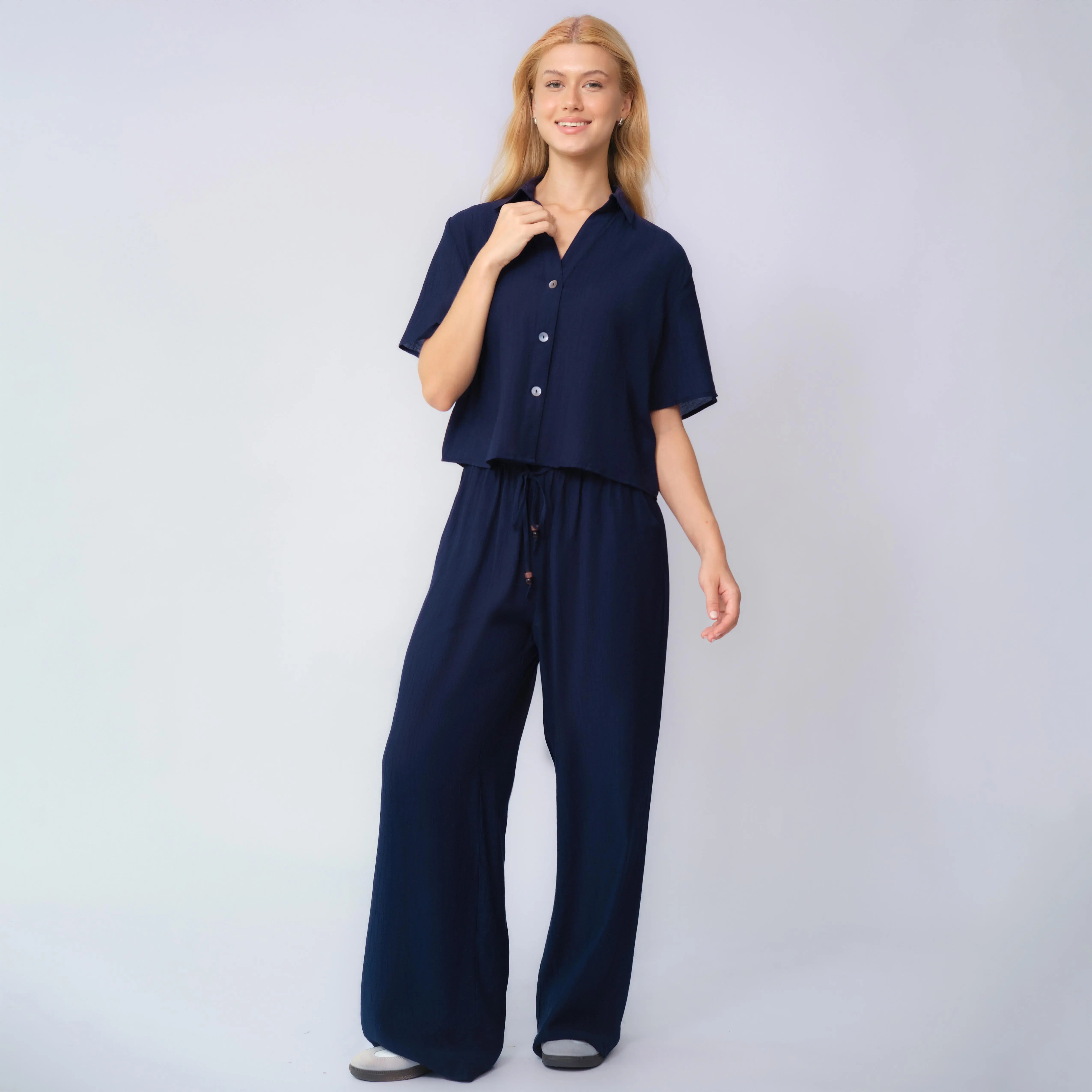KatchMe Women's Classy Solid Color Collared Shell Button Loose Top & Drawstring Wide Leg Trousers Co-ord