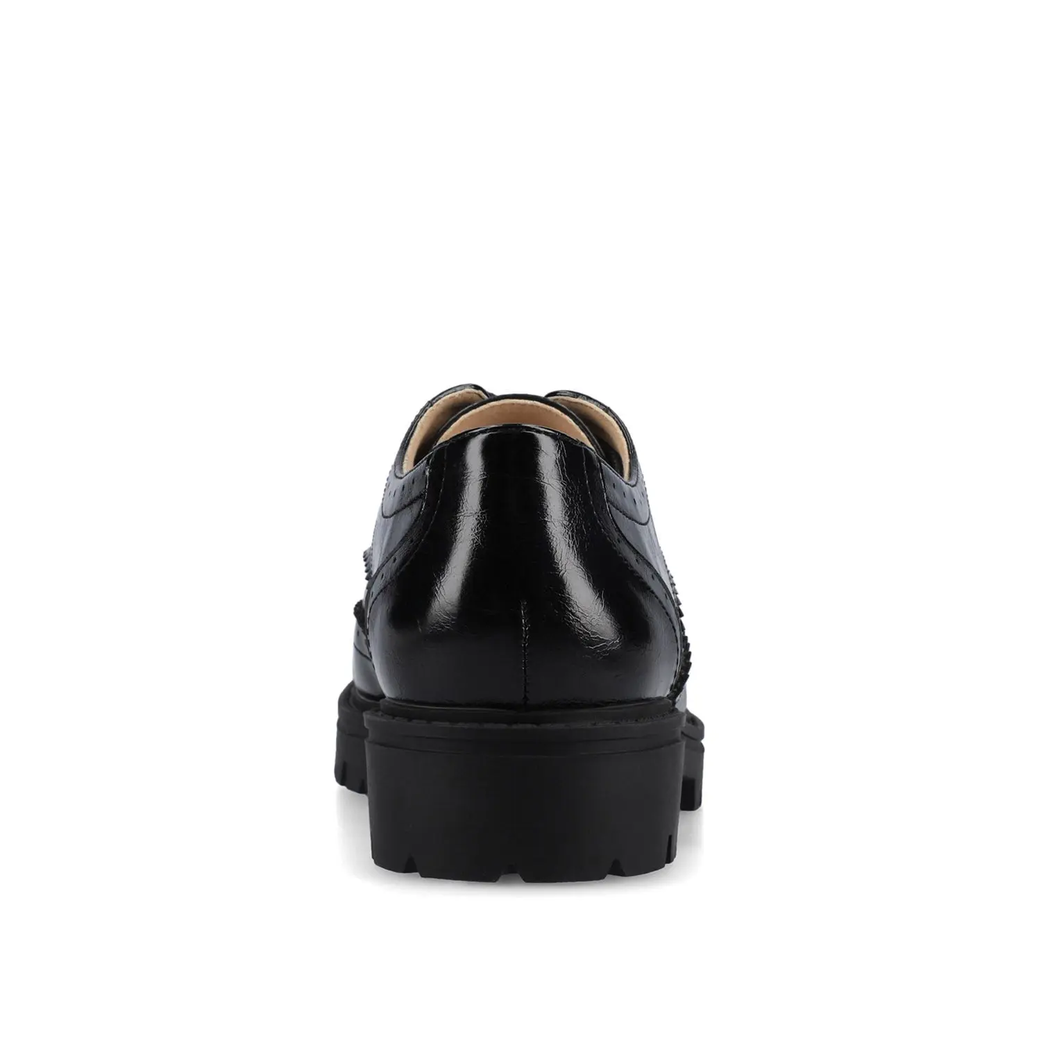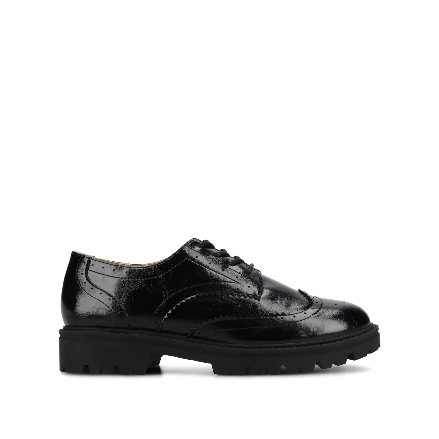 • Wingtip Oxford Flat • Almond Toe • Lace-Up • 4 mm Journee Comfort Systems • 1 1/2 in Block Heel and Lug Sole • Vegan leather