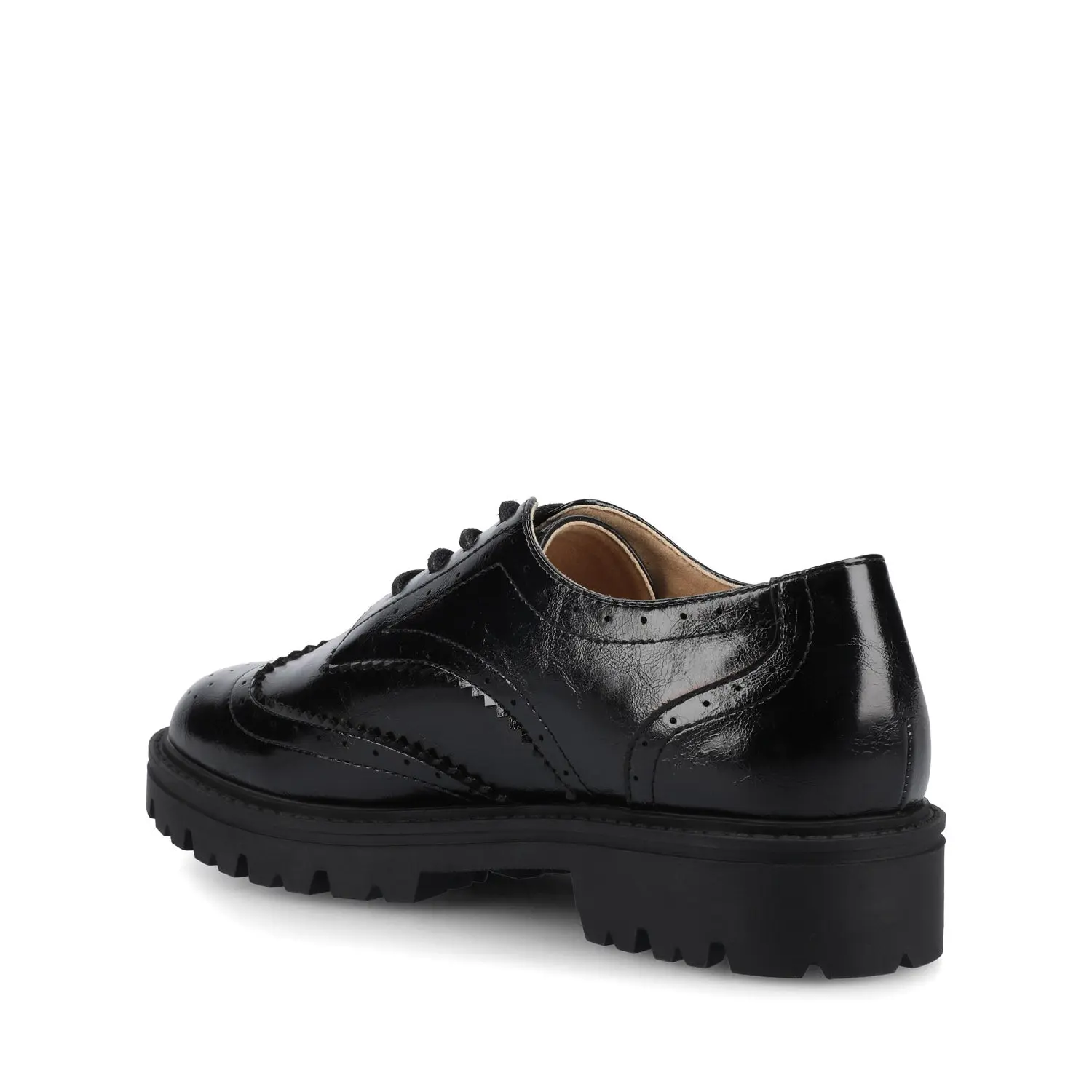 Experience the perfect blend of vintage style and modern comfort with Claudiya by Journe, the wingtip oxford flat that's both preppy and practical. Made from vegan leather and featuring an almond-toe design with a chunky lug sole, Claudiya showcases a classic charm that's sure to turn heads. With a lace-up style and 4 mm Journee Comfort Systems insole, Claudiya ensures a comfortable fit all day long, making it the perfect addition to your shoe collection for any occasion.