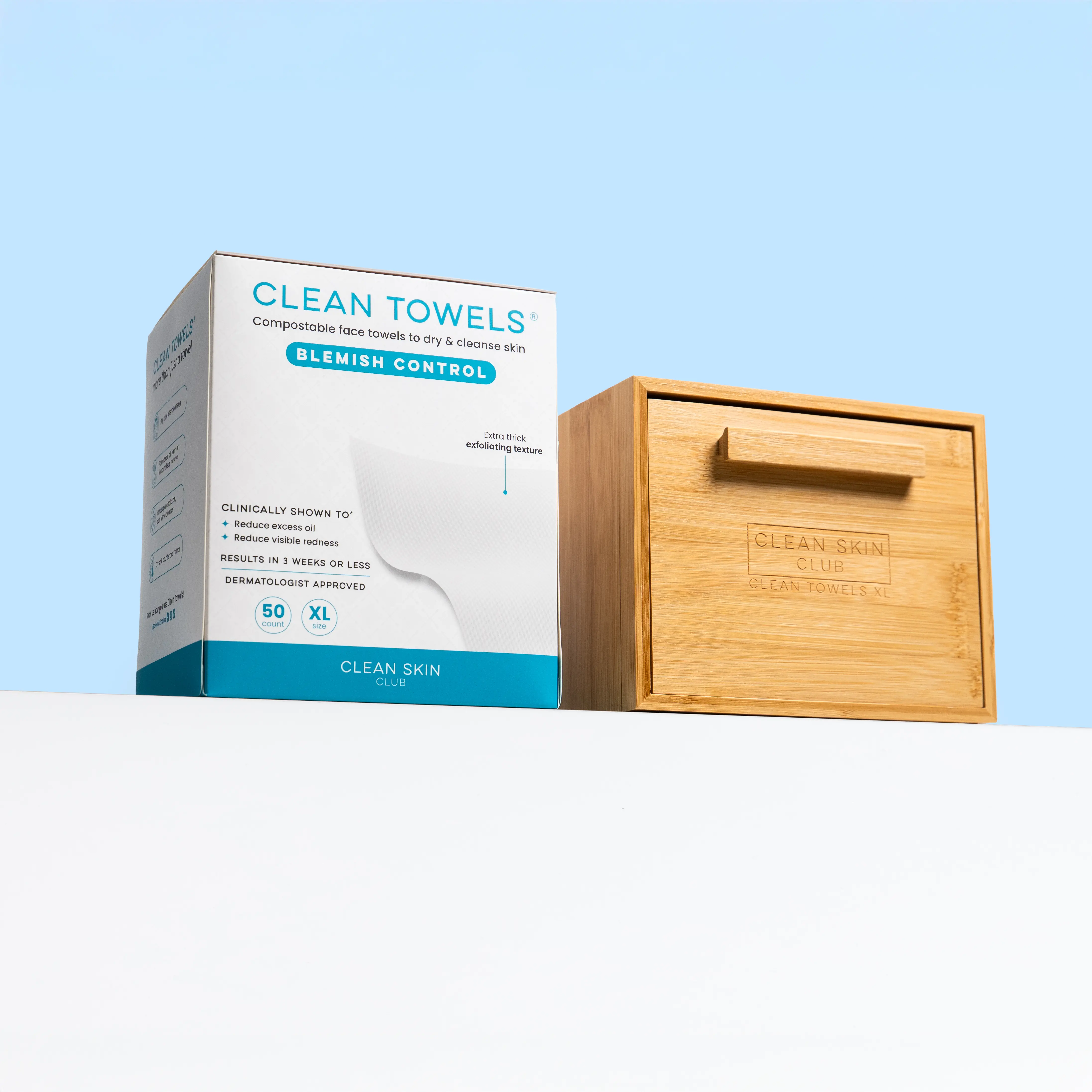 What kind of towel are you using on your breakout-prone skin? A rough washcloth or reused body towel that traps oil, potentially impacting blemishes? Clean Towels Blemish Control are designed differently—with extra thickness, a textured one-raised dot pattern, and dermatologist backing to support your skin goals. These ultra-durable, single-use face towels are created specifically for oily and blemish-prone skin. They offer exfoliating benefits without being harsh, making them a clean option for skin that's working hard. Whether your skin concerns are hormonal, stress-related, or environmental, these towels provide a fresh start every time. How to use: Dampen with water or your cleanser for gentle exfoliation that removes excess oil and residue. Pat your face dry after cleansing, or use them to wipe away makeup and skincare buildup. Dispose after each use to maintain hygiene—no more laundering cloths. Clinically shown to help with excess oil and visible redness in 3 weeks or less when used twice daily.* In the study, 100% saw an improvement in the skin’s barrier and overall skin health, while 87% had an improved appearance of redness, based on clinical grading and dermatologist assessment. Accepted by the National Eczema Association and dermatologist-approved, these towels are suitable for those with sensitive skin needs. They're 100% USDA Biobased and hold the OEKO-TEX seal for safety. *These statements have not been evaluated by the Food and Drug Administration. This product is not intended to diagnose, treat, cure, or prevent any disease. Results based on a clinical study using the towels twice daily. Individual results may vary.