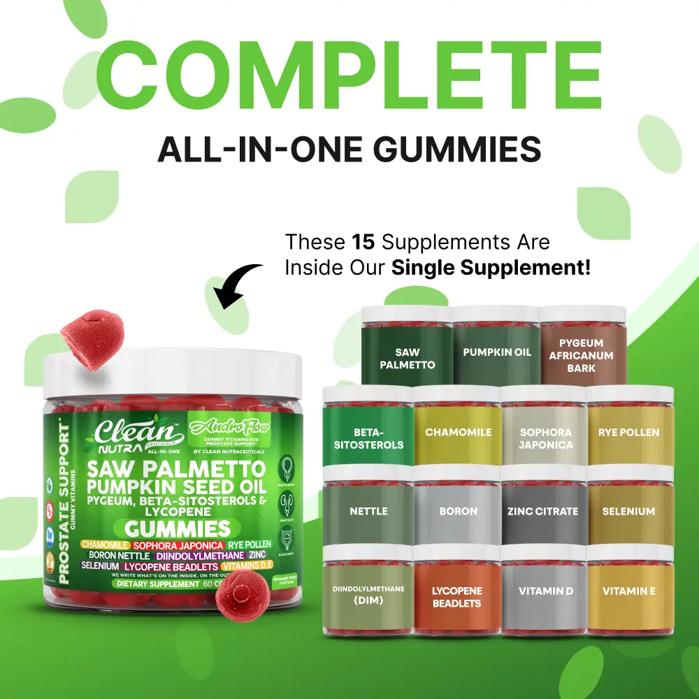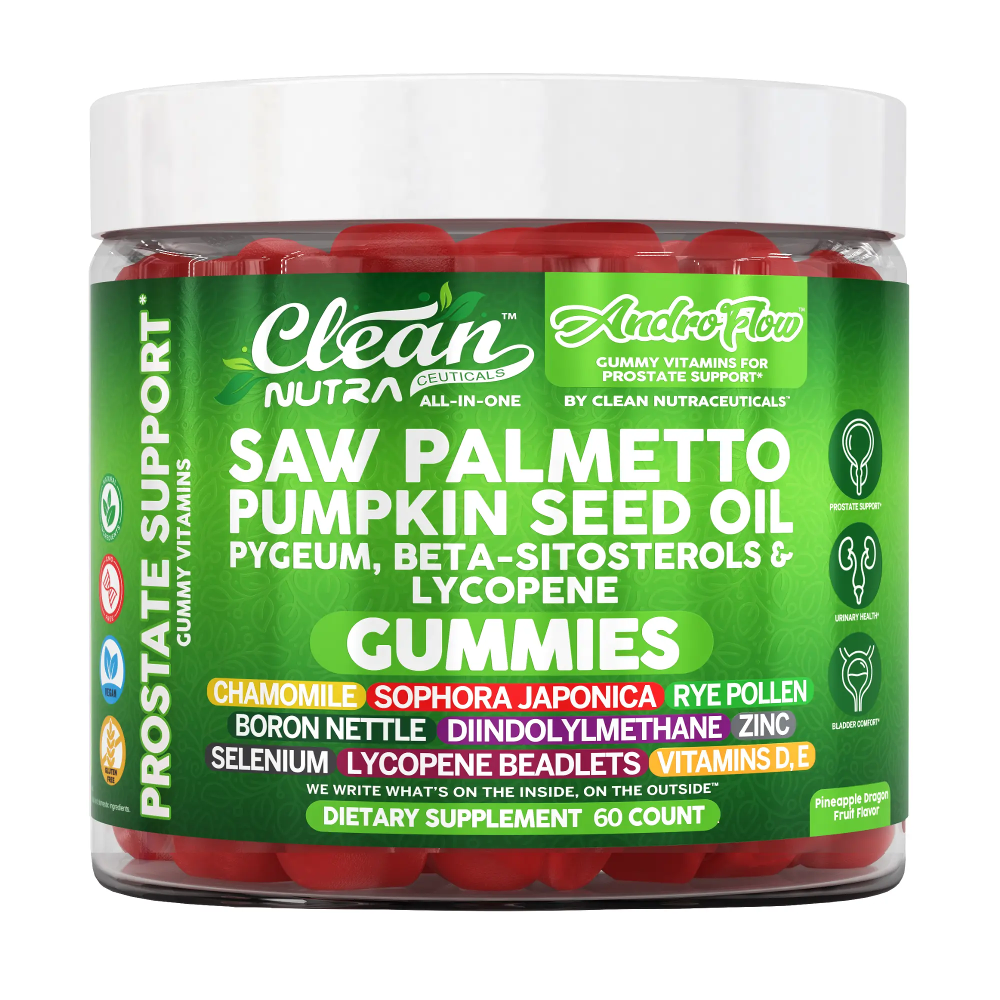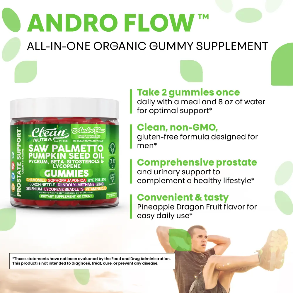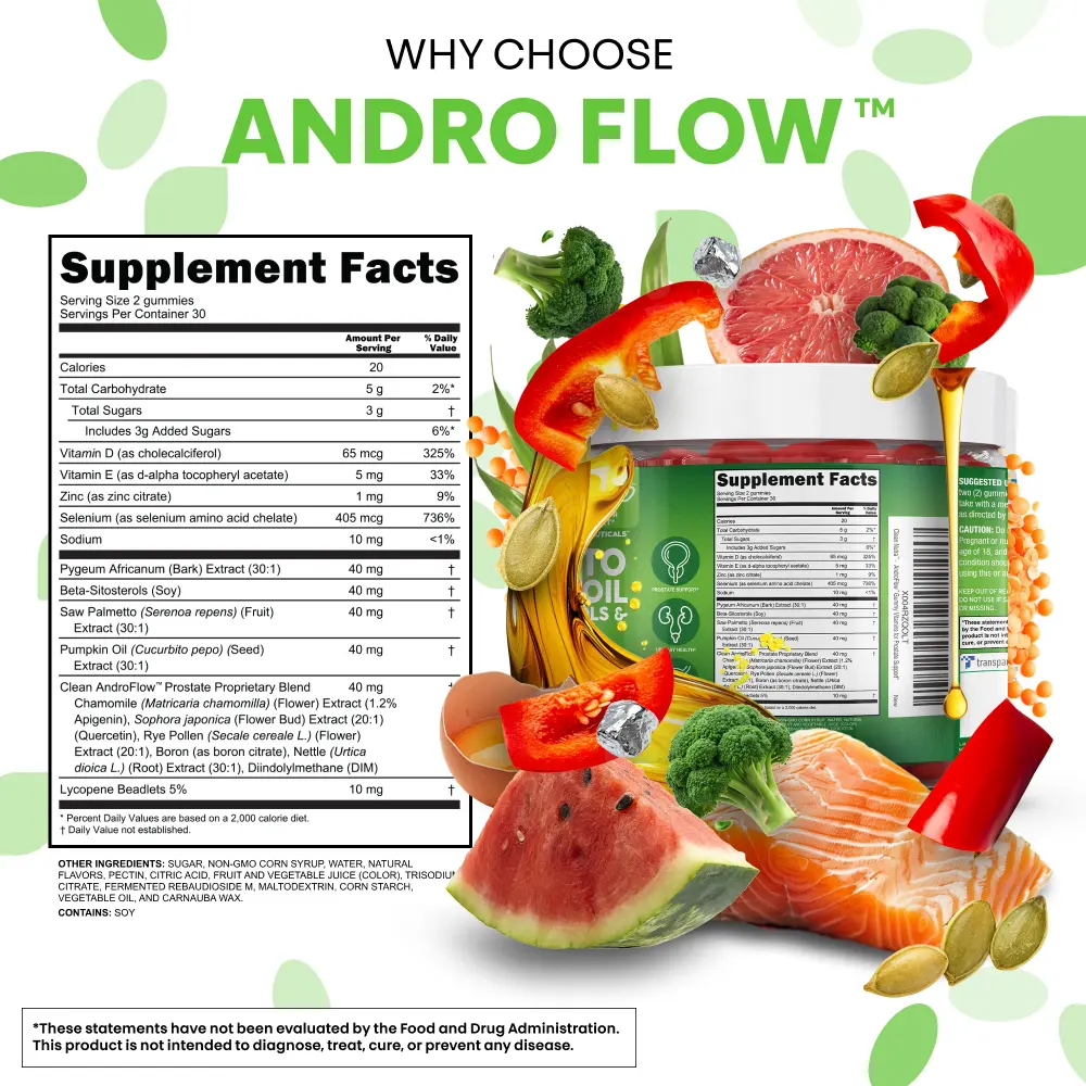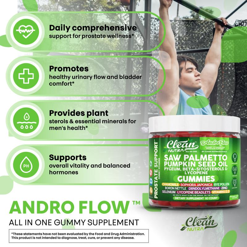 Andro Flow is a potent 15-in-1 blend designed to support healthy prostate function, promote hormonal balance, and improve urinary comfort for men. This daily supplement combines powerful plant extracts and essential nutrients like Saw Palmetto, Pumpkin Seed Oil, Beta-Sitosterols, Pygeum Bark, DIM, Zinc, and Lycopene—offering complete wellness support in just 2 tasty gummies a day.*