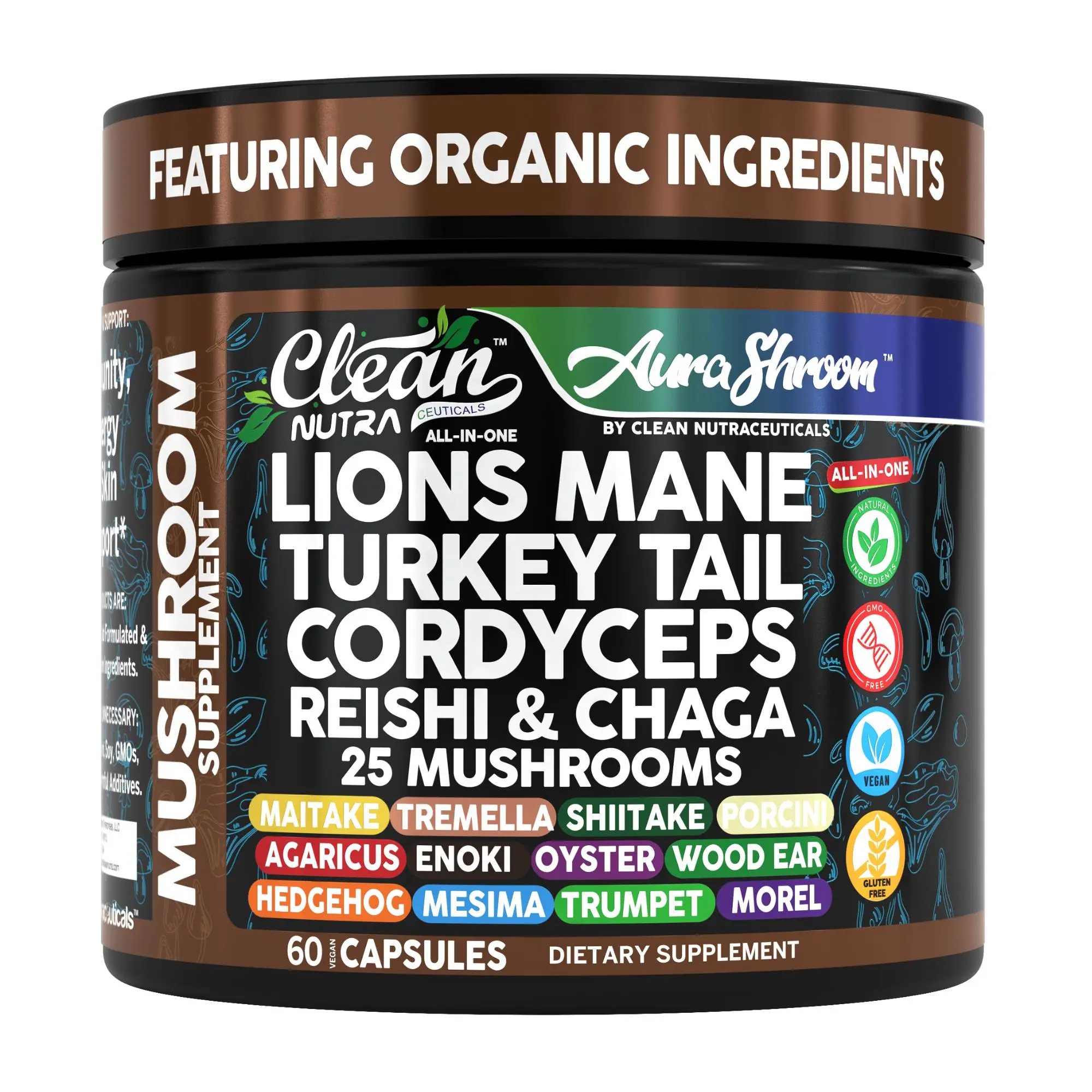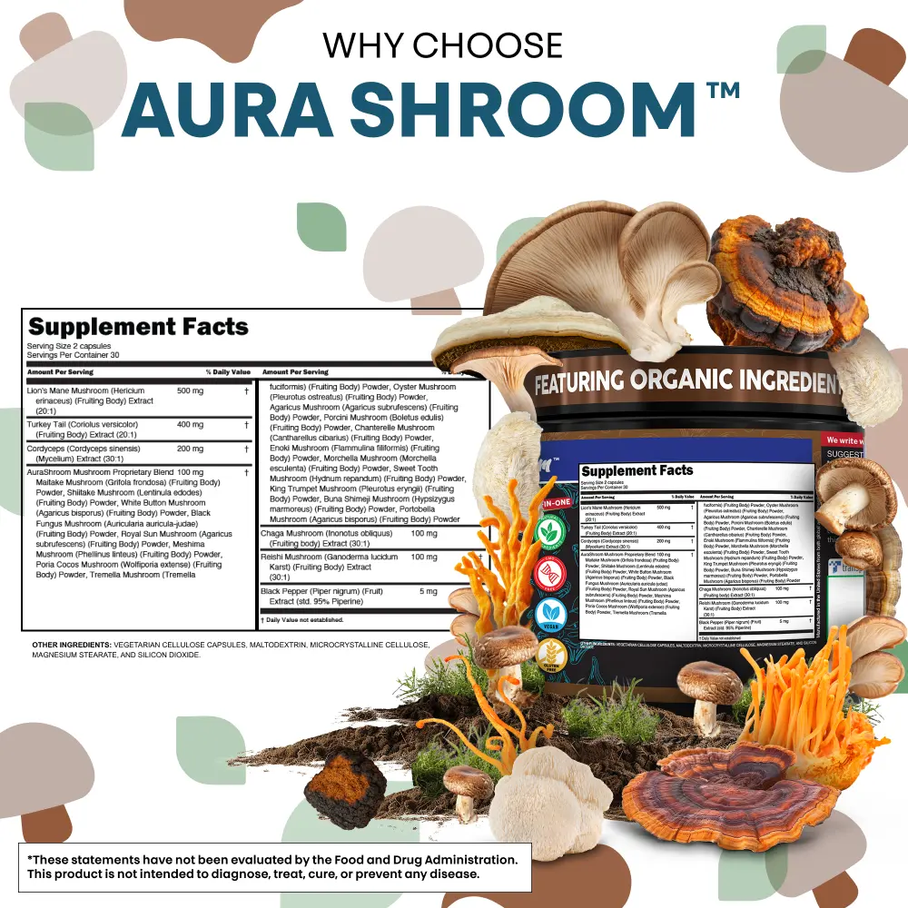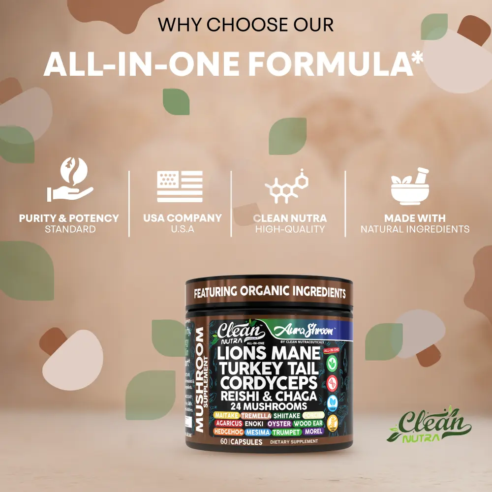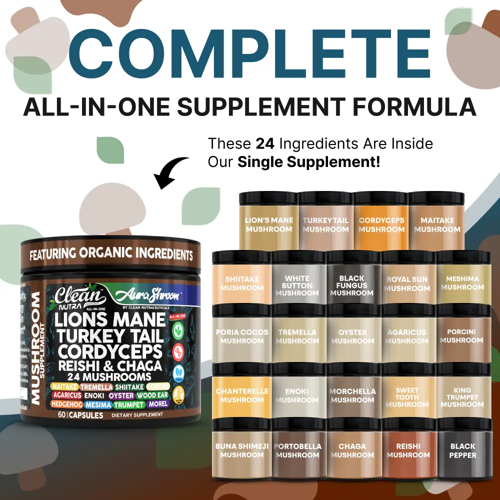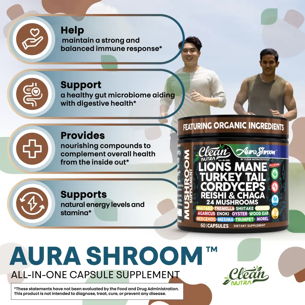 Clean Nutra Aura Shroom is a powerful 24-mushroom formula combining the most sought-after organic fungi including Lion’s Mane, Reishi, Turkey Tail, Chaga, Shiitake, Maitake, and more—all in one daily capsule. Designed to nourish the immune system, gut microbiome, and overall vitality, this comprehensive blend supports energy, digestion, and long-term resilience.
