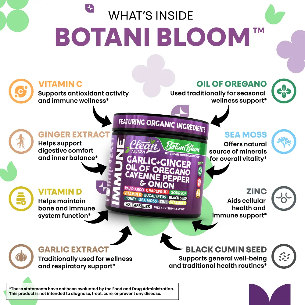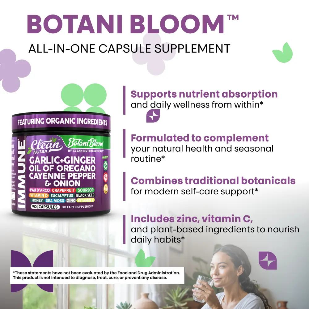 Botani Bloom is a powerful plant-based capsule blend designed to help your body stay ready, balanced, and supported through changing seasons. Built with traditional botanicals like garlic, ginger, oil of oregano, and cayenne, this formula offers daily wellness support without compromise.