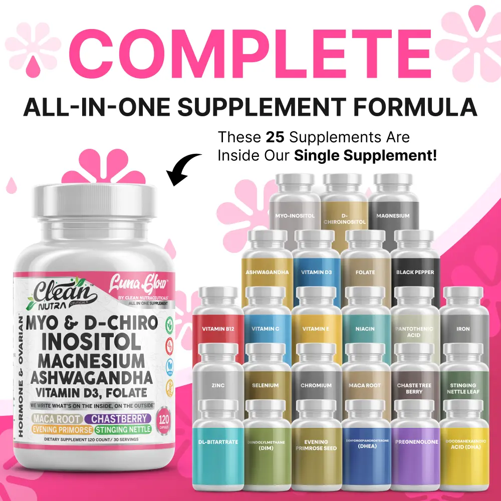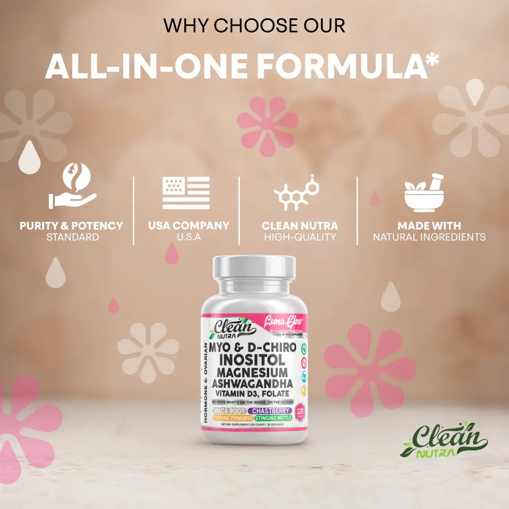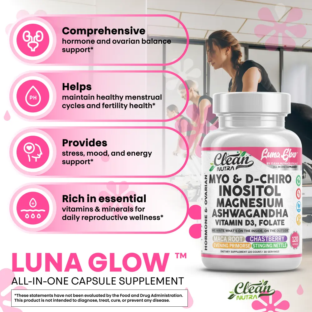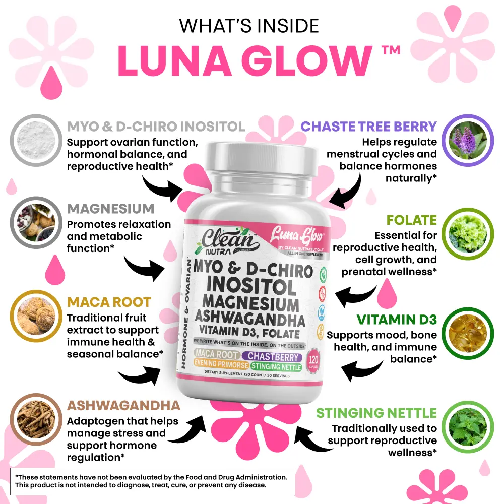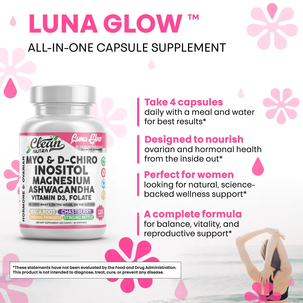 Clean Nutra Luna Glow is a 16-in-1 capsule formula designed to support women’s wellness, hormonal balance, stress relief, and restful sleep. This comprehensive blend features ashwagandha, inositol, myo-inositol, choline, and magnesium to help you feel more balanced—day and night.