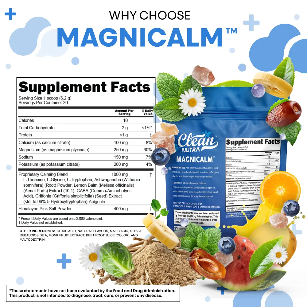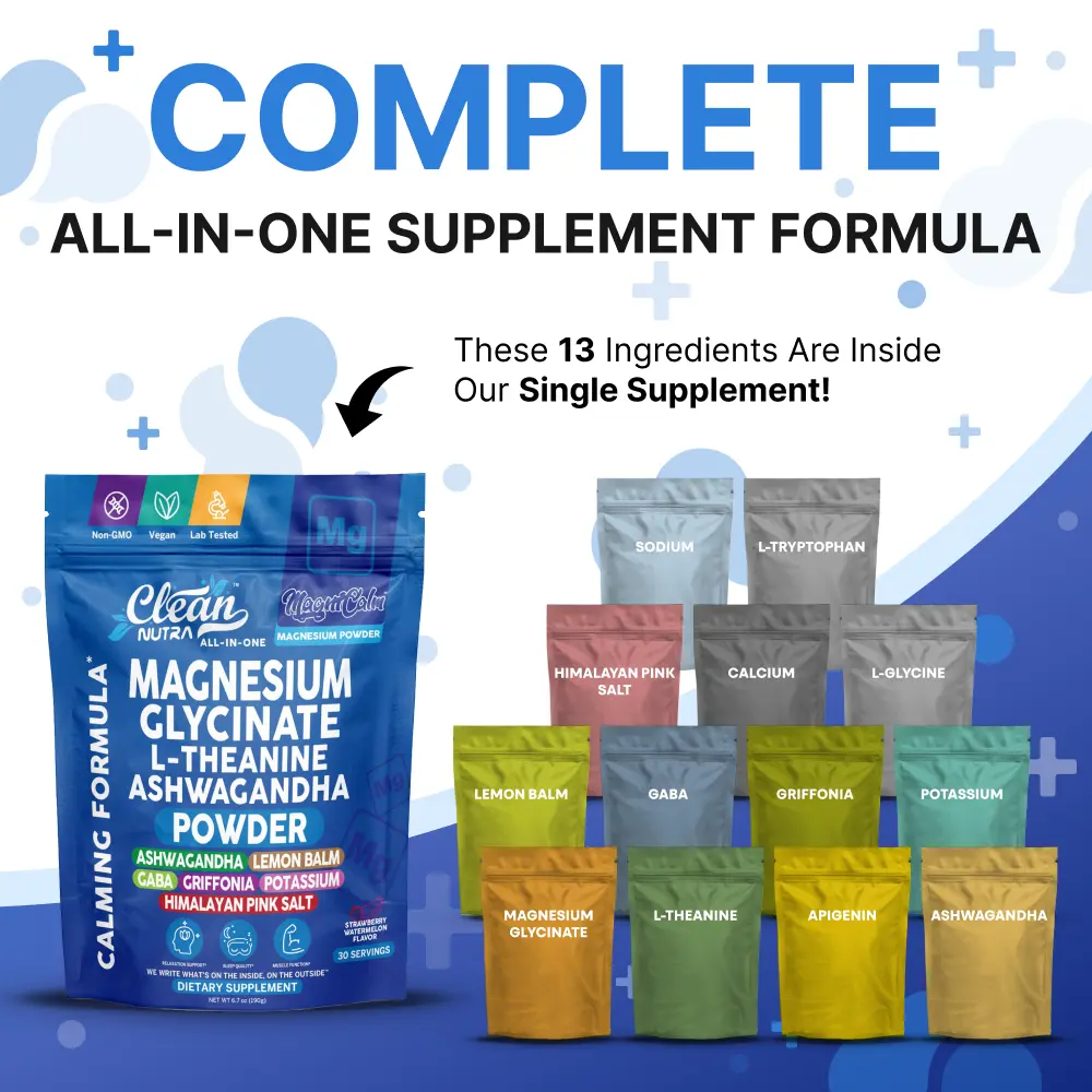 Clean Nutra MagniZen is an all-in-one calming magnesium powder expertly crafted with 13 soothing ingredients including Magnesium Glycinate, L-Theanine, Apigenin, GABA, Ashwagandha, Lemon Balm, and more. This botanical + mineral formula supports your daily stress response, calm focus, mood balance, and relaxation—all in one delicious scoop.