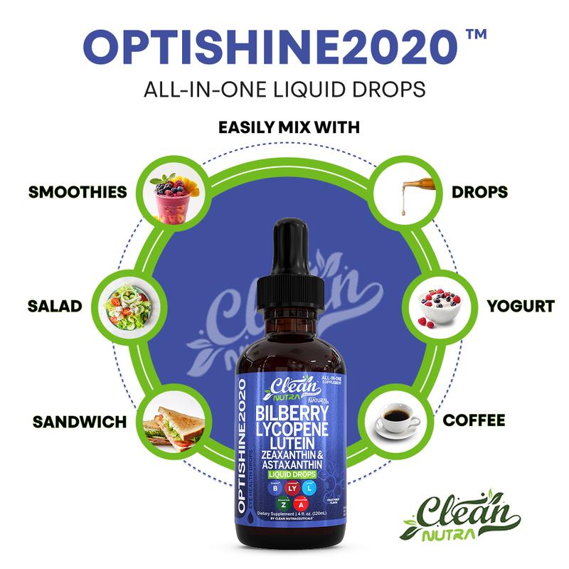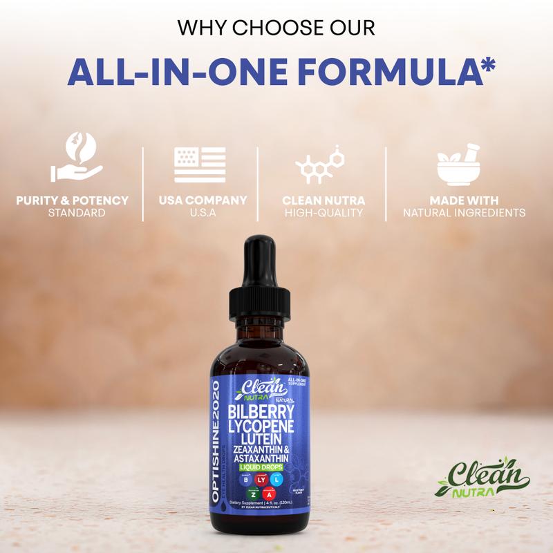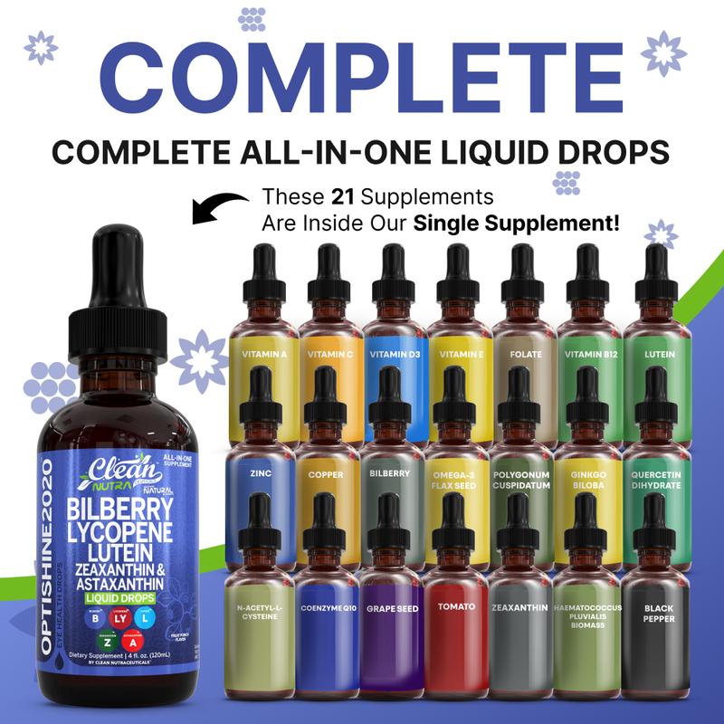 Clean Nutra OptiShine2020 is a complete 21-in-1 liquid formula designed to support healthy vision, eye endurance, and cellular protection. This all-in-one supplement features powerful antioxidants and nutrients including Bilberry, Lutein, Zeaxanthin, Lycopene, and Astaxanthin to help promote macular health, retinal function, and visual clarity. With a synergistic blend of vitamins, minerals, and botanicals, OptiShine2020 helps nourish your eyes and support overall ocular wellness in one convenient daily drop.