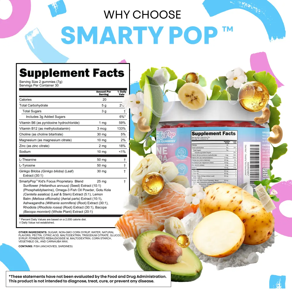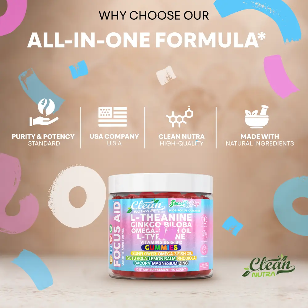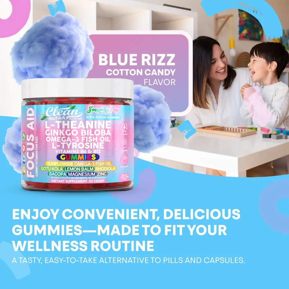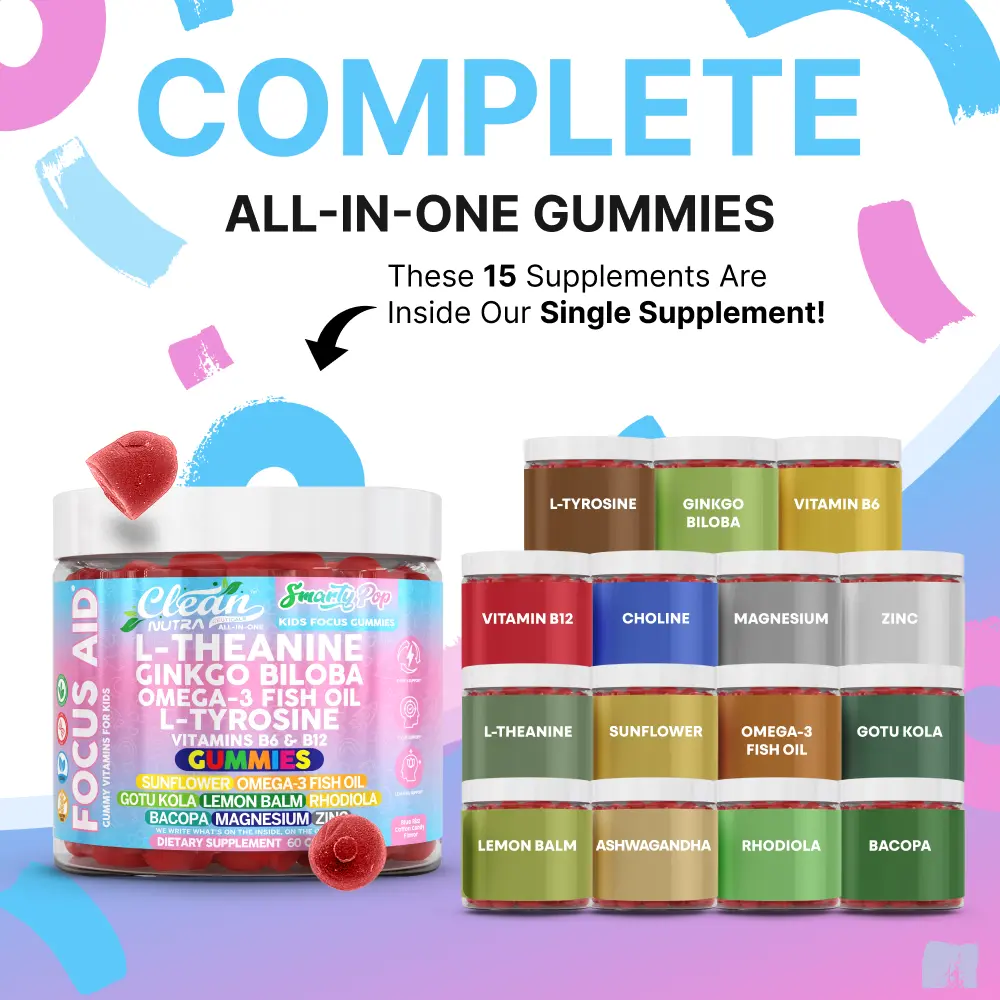 Clean Nutra Smarty Pop is a 15-in-1 daily gummy designed to support kids’ focus, memory, and calm energy levels. This all-in-one formula combines L-theanine, omega-3s, B vitamins, magnesium, and botanicals for a balanced brain support gummy kids actually enjoy.