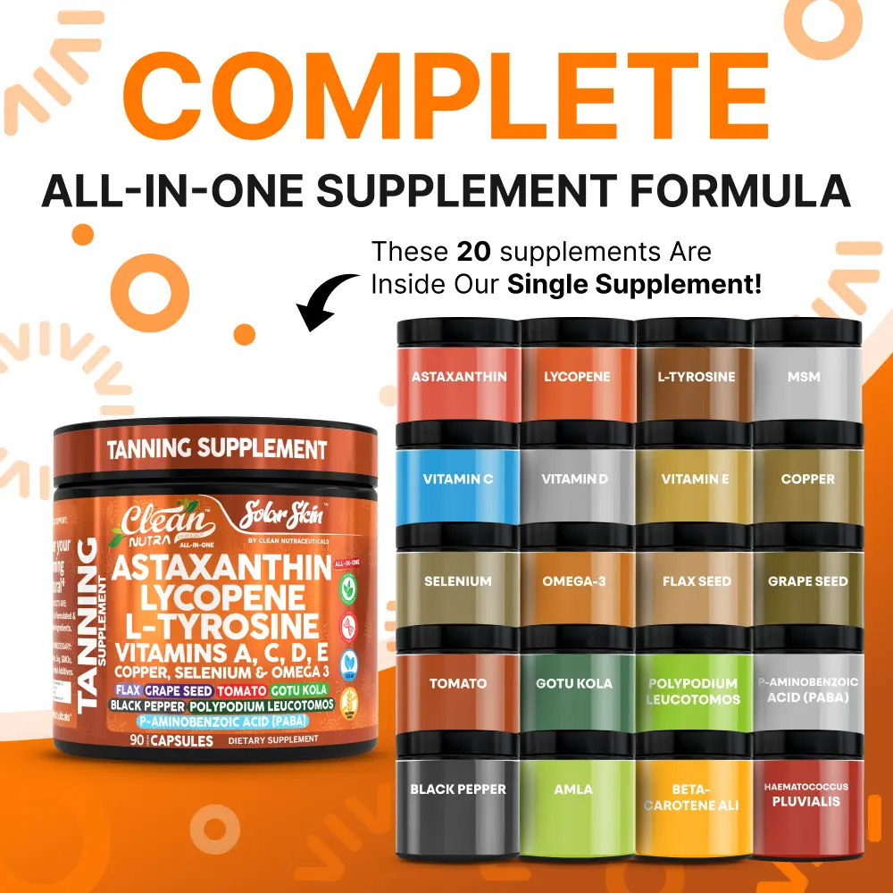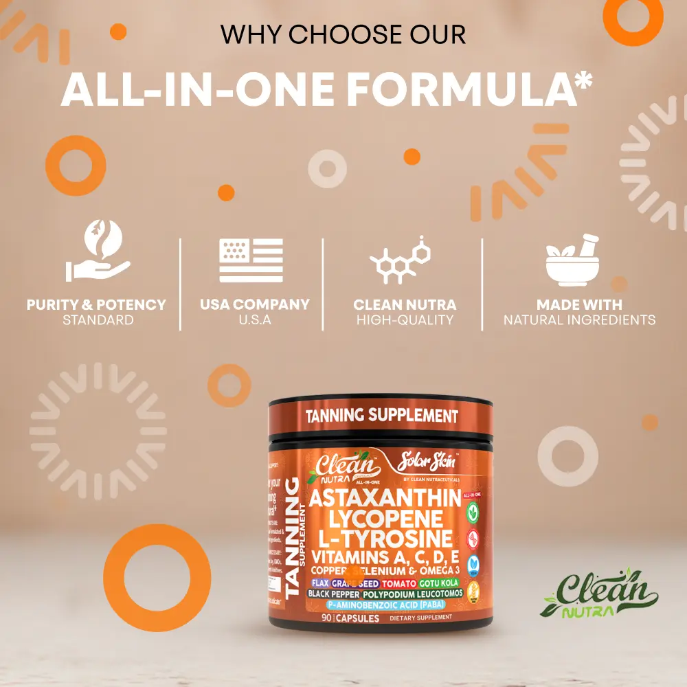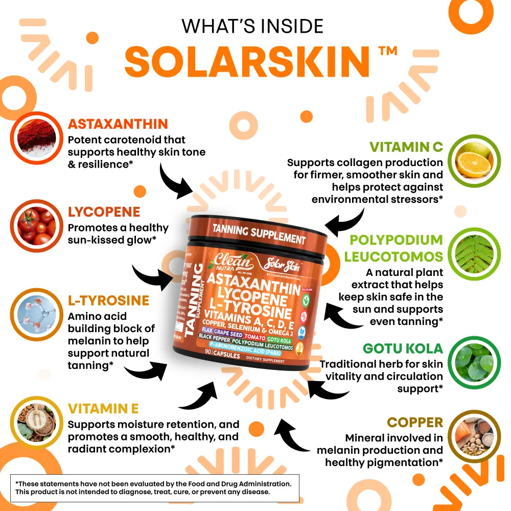 Clean Nutra SolarSkin is a 20-in-1 all-in-one tanning and skin-support formula crafted to promote a healthy glow, even skin tone, and long-lasting radiance. This daily supplement combines astaxanthin, lycopene, L-tyrosine, vitamins A, C, D & E, copper, Gotu Kola, Polypodium Leucotomos, flaxseed, omega-3s, and other glow-enhancing botanicals to support skin hydration, pigmentation balance, and antioxidant protection from within.*