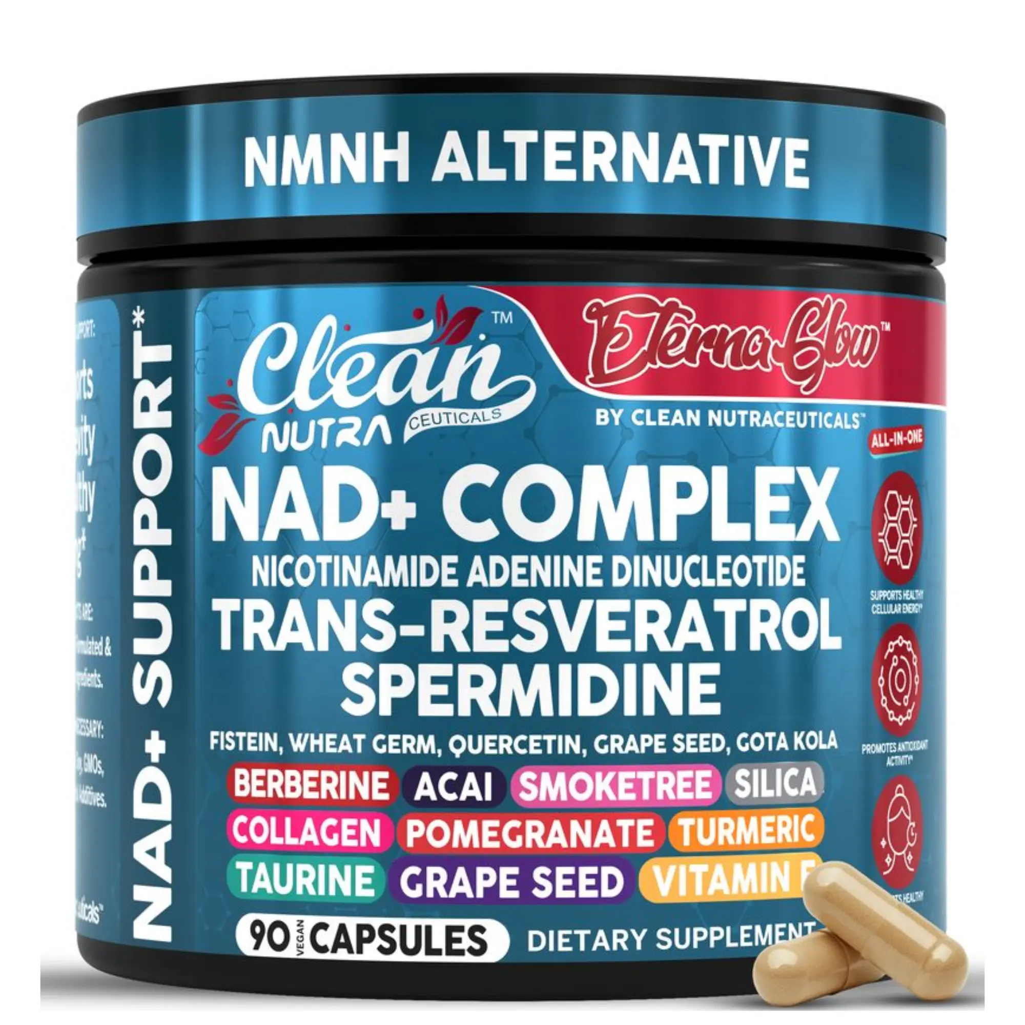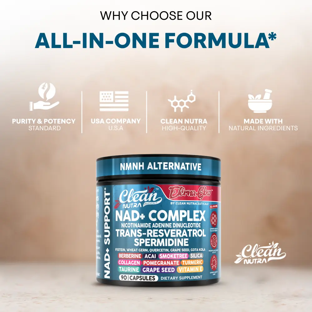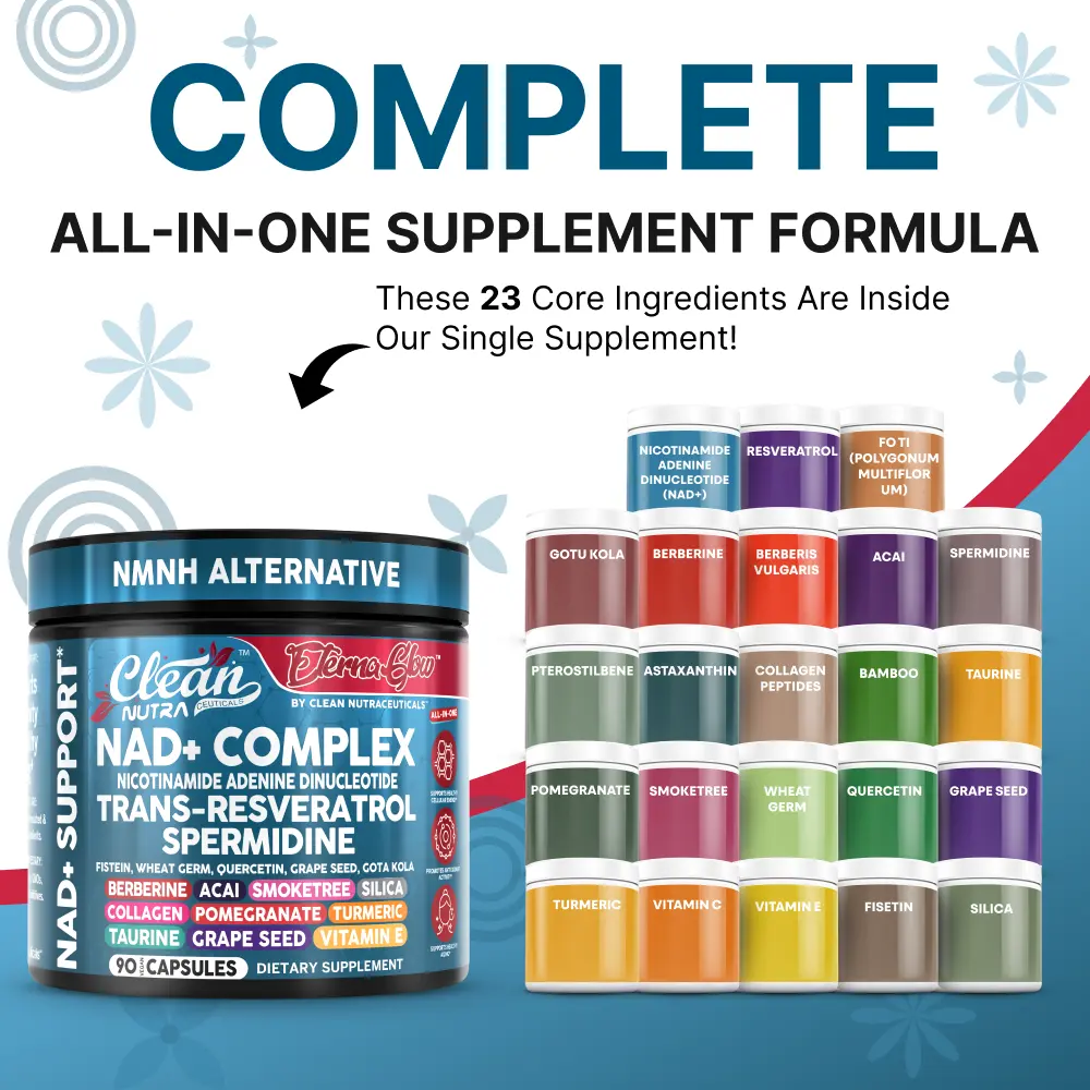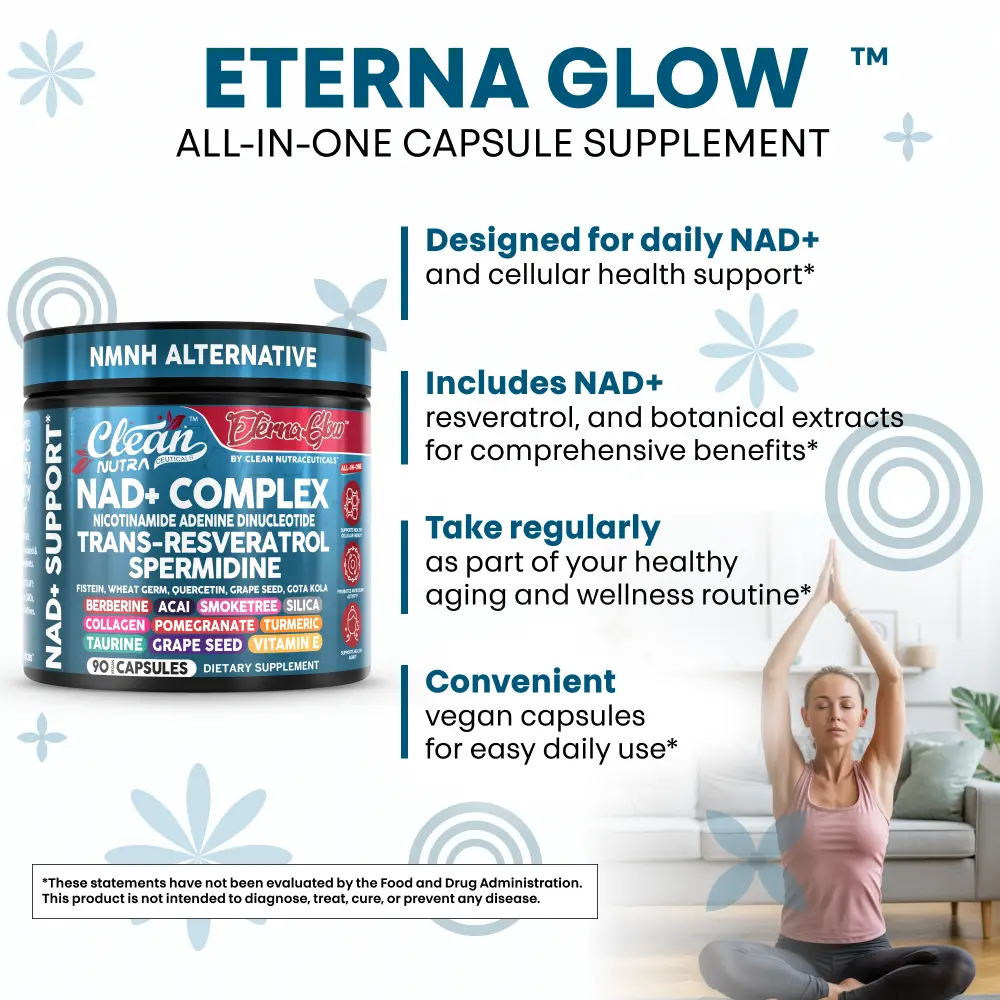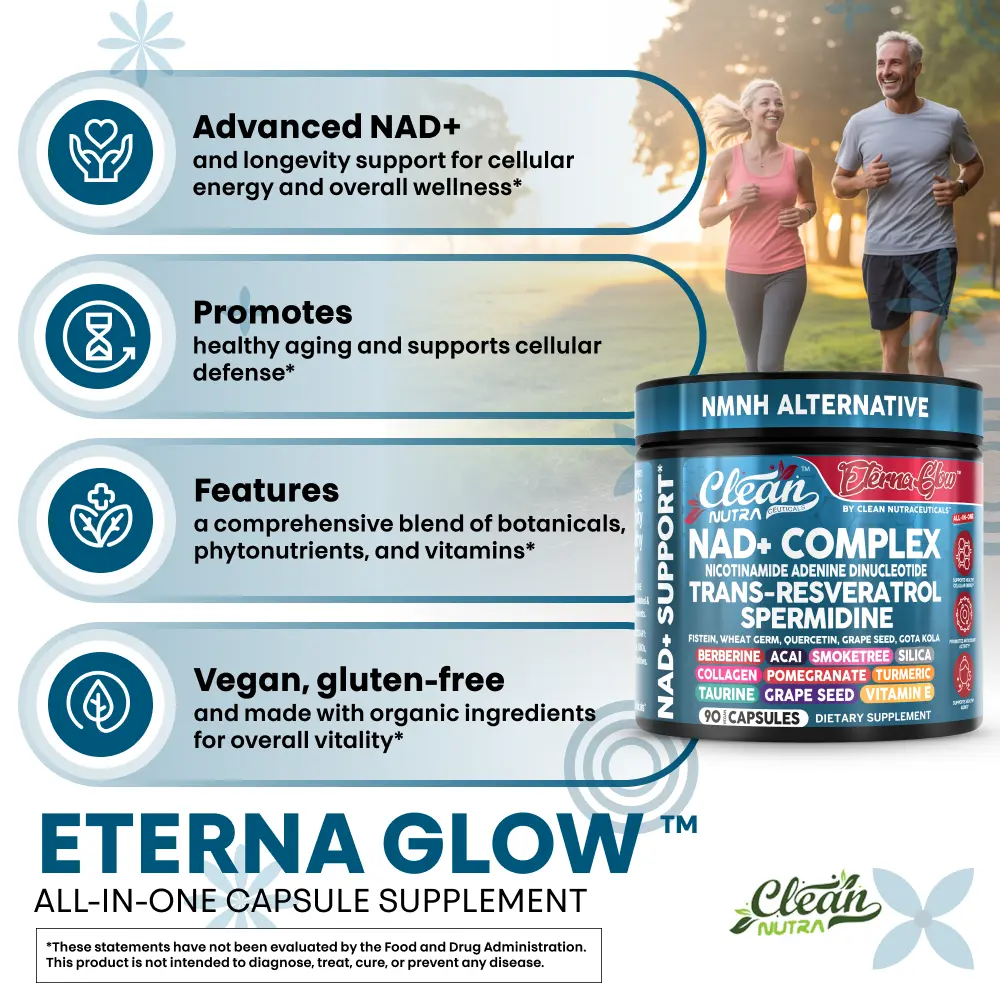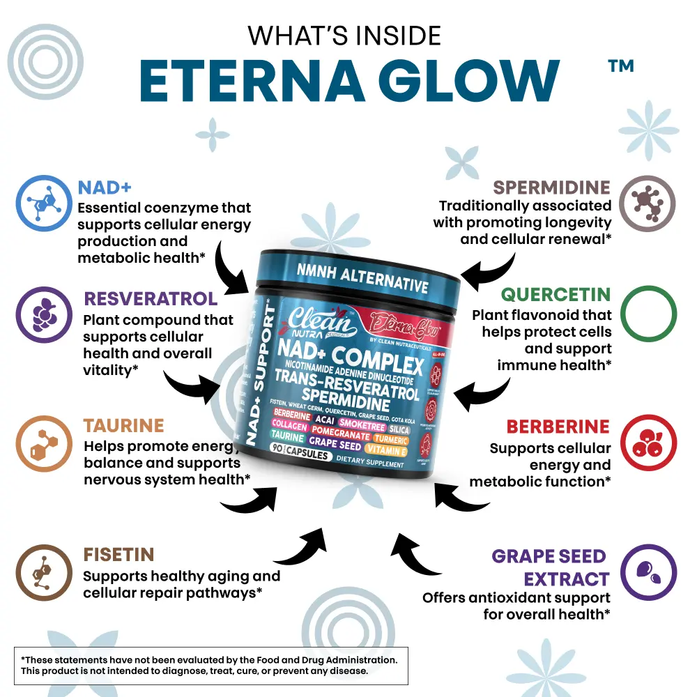 Clean Nutra Eterna Glow is a powerful 23-in-1 NAD+ support formula designed to promote cellular energy, healthy aging, and overall vitality. This all-in-one supplement features NAD+ precursors, trans-resveratrol, spermidine, quercetin, berberine, taurine, grape seed extract, and collagen peptides—along with a blend of antioxidant-rich botanicals—to help support metabolic wellness, cellular repair pathways, and daily energy balance.*