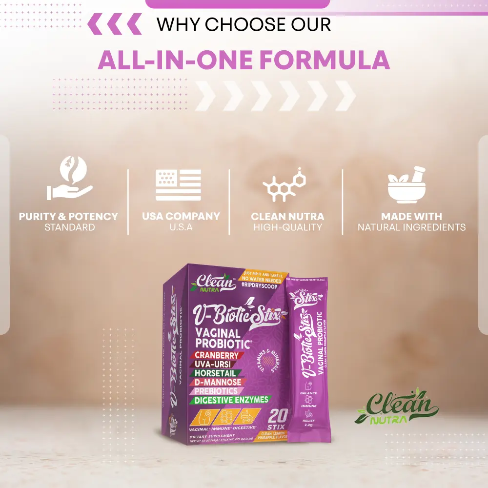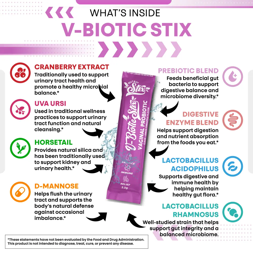 V-Biotic Stix is a convenient, no-water-needed probiotic powder stick designed to support vaginal, urinary, and digestive health—just rip and pour, no water required.