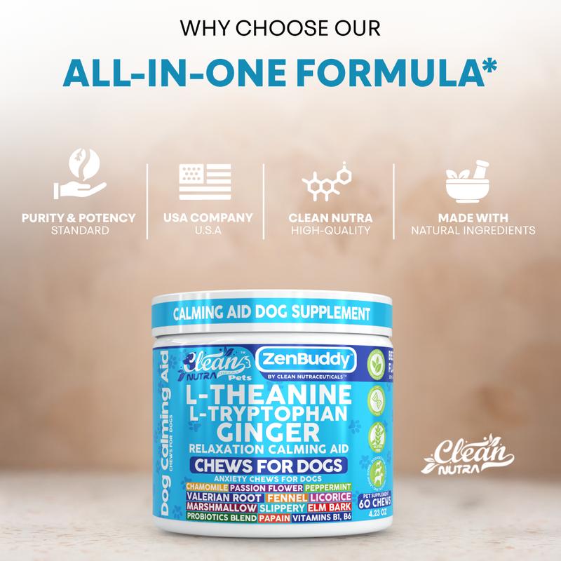 Clean Nutra Zen Buddy is a comprehensive calming aid formulated to support your dog’s emotional balance and overall well-being. With a blend of 16 soothing ingredients including L-Theanine, L-Tryptophan, Ginger Extract, and calming botanicals like Chamomile, Valerian Root, and Passion Flower, these chews help ease nervous tension, support balanced mood, and reduce stress-related discomfort—without causing drowsiness.
