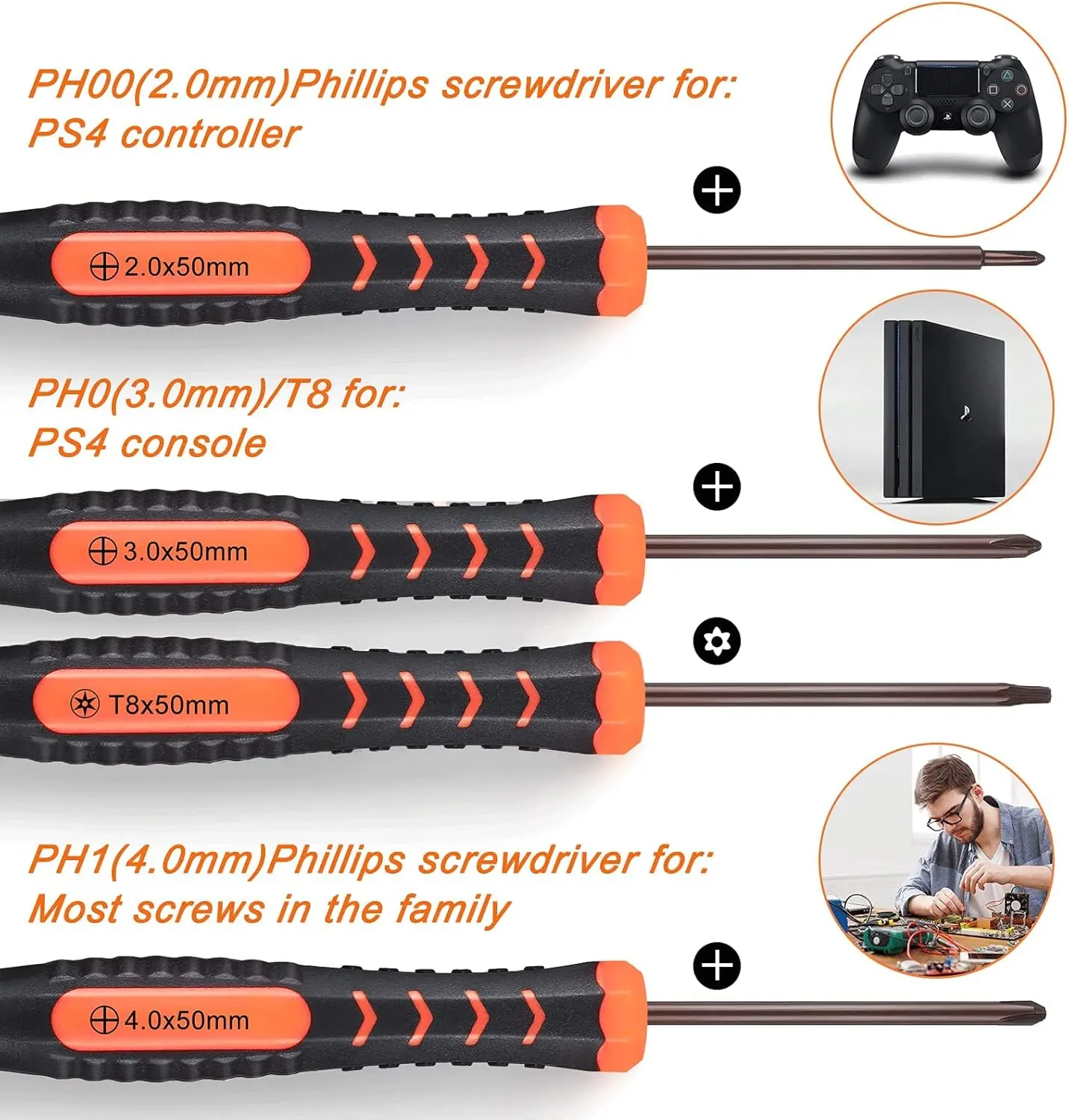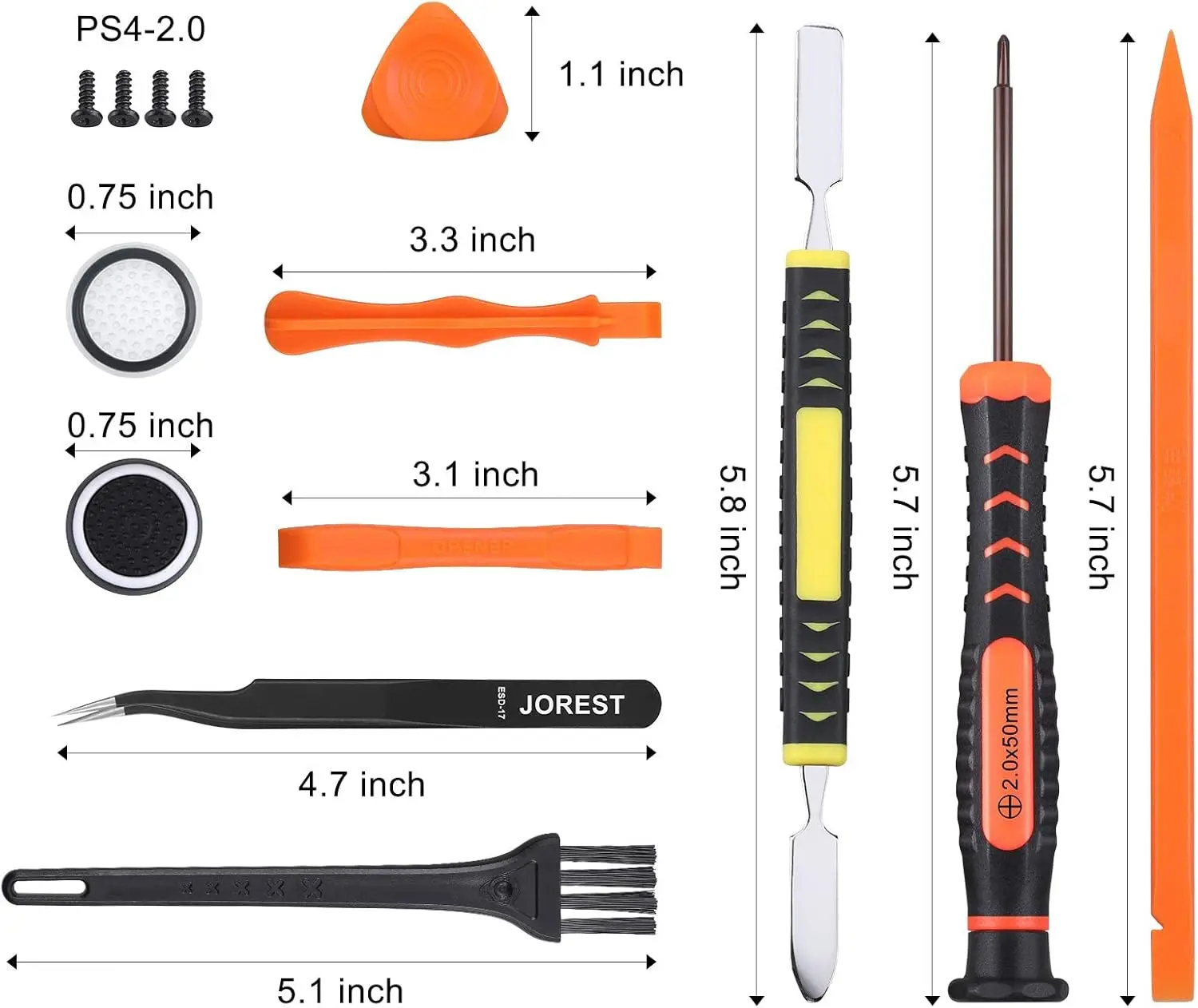 ·PS4 Full Set of Screwdriver Set: Includes PH00, PH0, PH1 Phillips screwdriver, T8 Torx safety screwdriver, tweezers, brushes, and PS4 handle 2.0 screws and handle rocker cap for replacement.