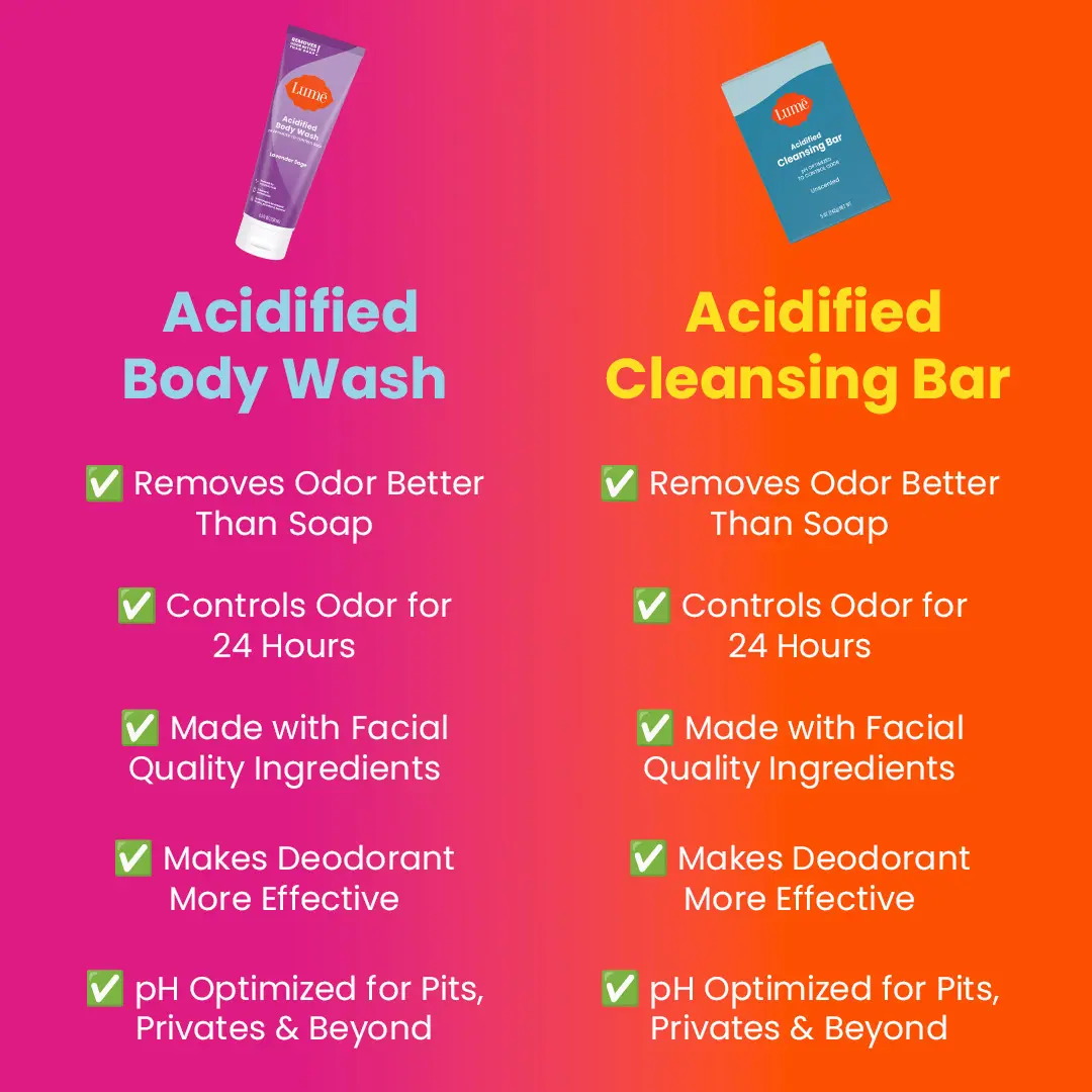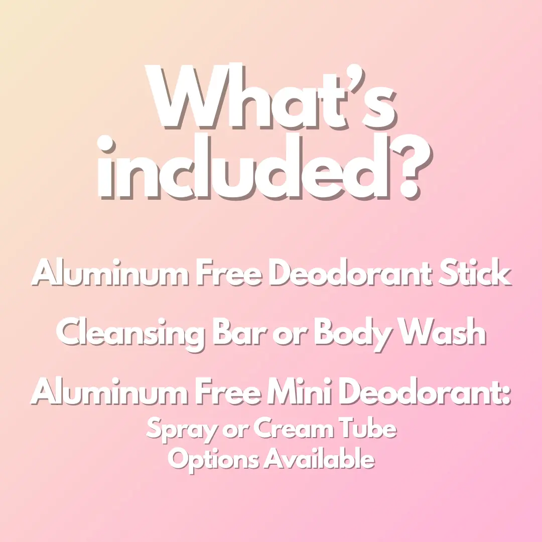 In each bundle, you'll receive an Aluminum Free Solid Stick and Mini Cream Tube Deodorant and either an Acidified Cleansing Bar or Acidified Body Wash.