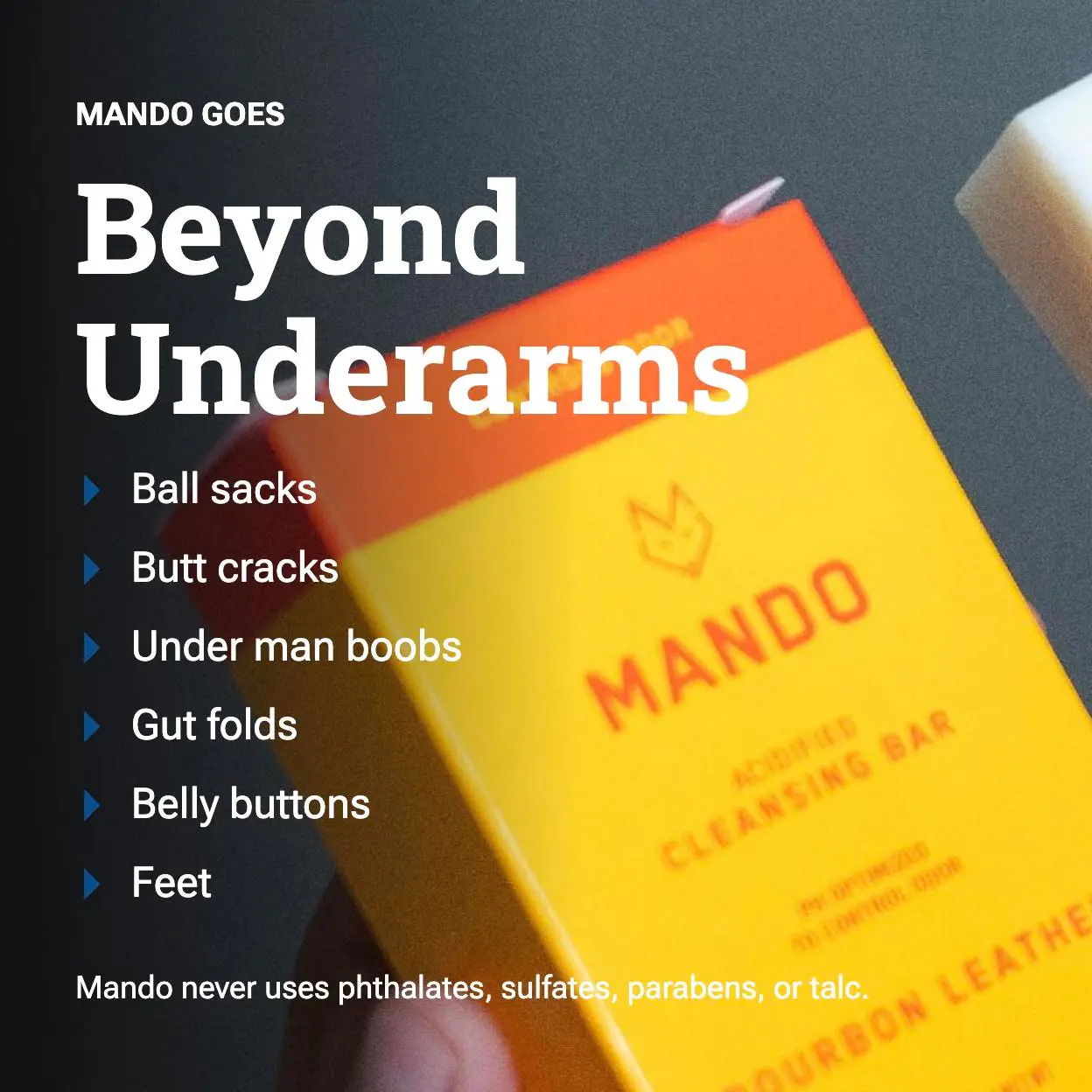 ·SERIOUSLY SAFE FOR ALL YOUR PARTS - Developed by a doctor, Mando Acidified Cleansing Bar was formulated without SLS and SLES, phthalates, and parabens to safely cleanse all your odor-prone areas. For up to 72-hour odor control, follow with any Mando Whole Body Deodorant.