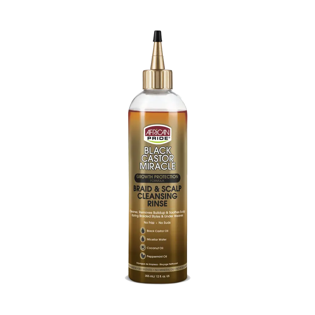 Black Castor Miracle Braid & Scalp Cleansing Rinse gently detoxes & conditions hair, edges & scalp during braided styles & under weaves. This rinse also calms itching and reduces frizz leaving hair refreshed & styles lasting. Nourishes scalp & helps to promote hair growth.