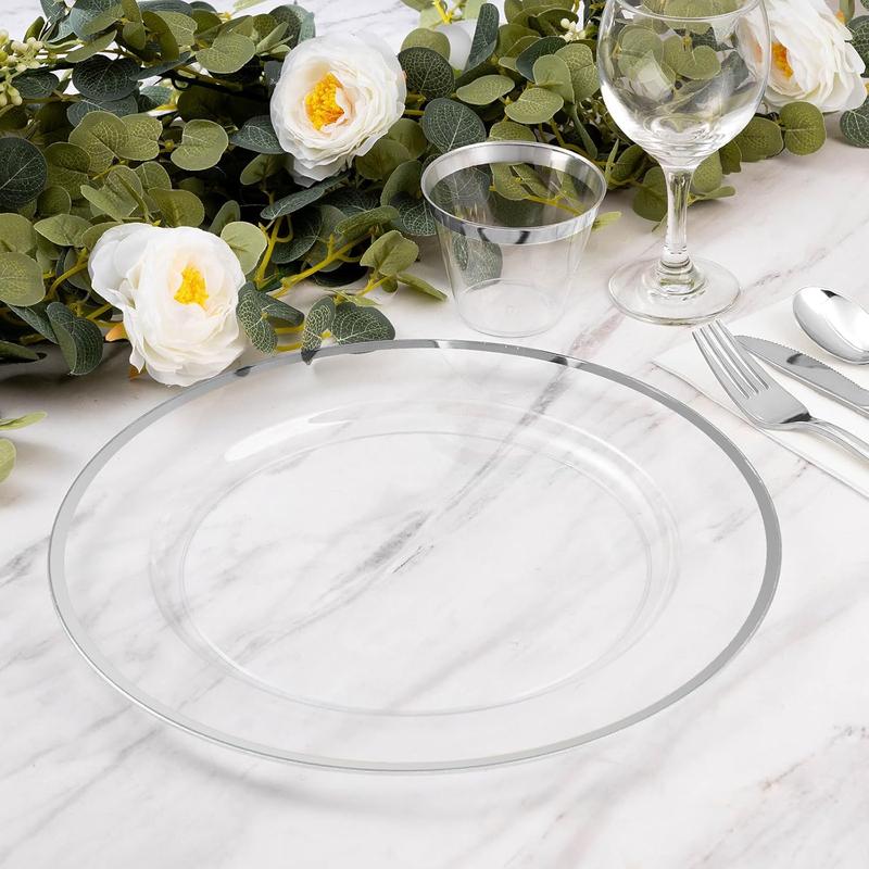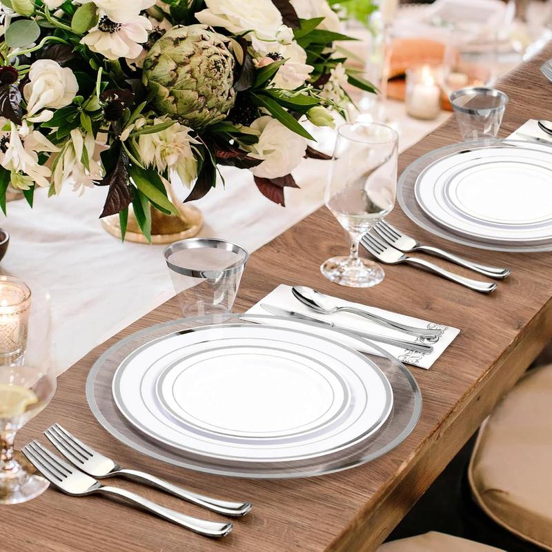 Host your dinner or party with elegance and ease. This 25pcs silver charger plate set includes clear plates with a silver trim, perfect for dinners, weddings, or parties. The 12-inch plates create a cohesive, stylish, and photo-ready table setup.