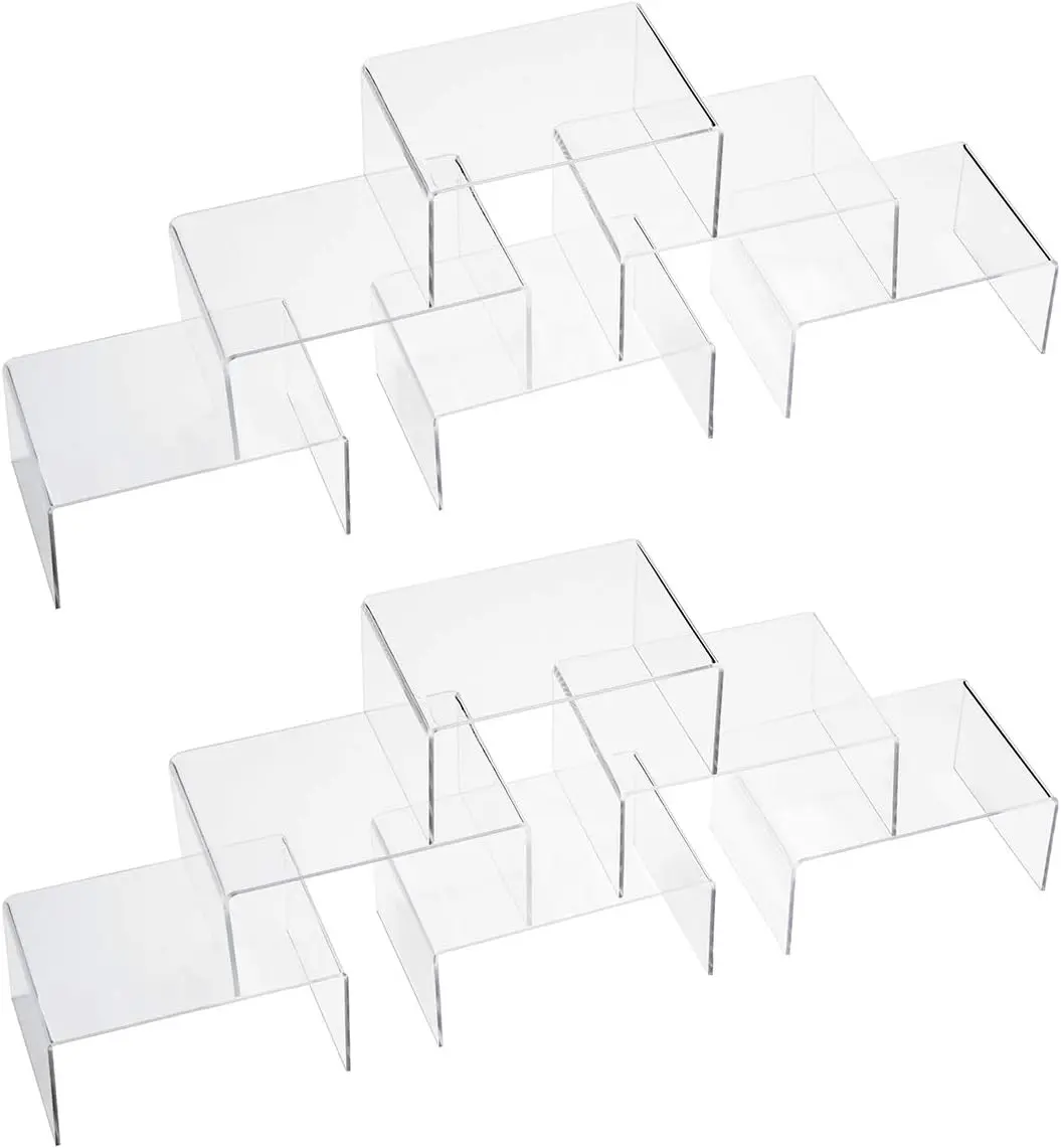 Conclude 12 pc acrylic risers. All one size 4” Wide X 3” Long X 2” High. Made from 0.08" (2mm) thick, clear, flame polished prime grade acrylic Great display for neat and organized arrangement. Works great for Funko Pop, Nendoroids, Gundams, Tamashii and Good Smile Figmas, and Amiibos there is a printed plastic film on all the surfaces to protect the acrylic during shipping Just rip it off and you will see clear stand