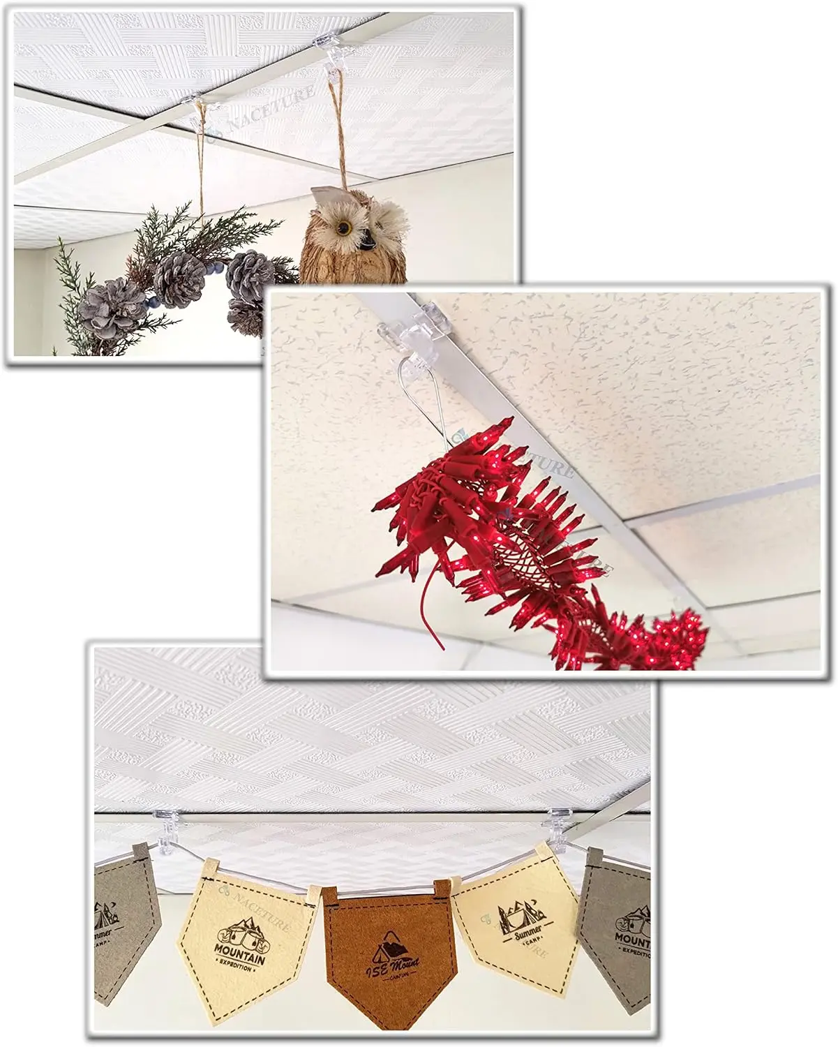 ✅VALUE PACK : Generously packed with 25 clear drop ceiling hooks for all your different hanging needs. for hanging and displaying posters, banners, artwork, lights, small and more. 1.5-inch-long x 1.1 inch wide.