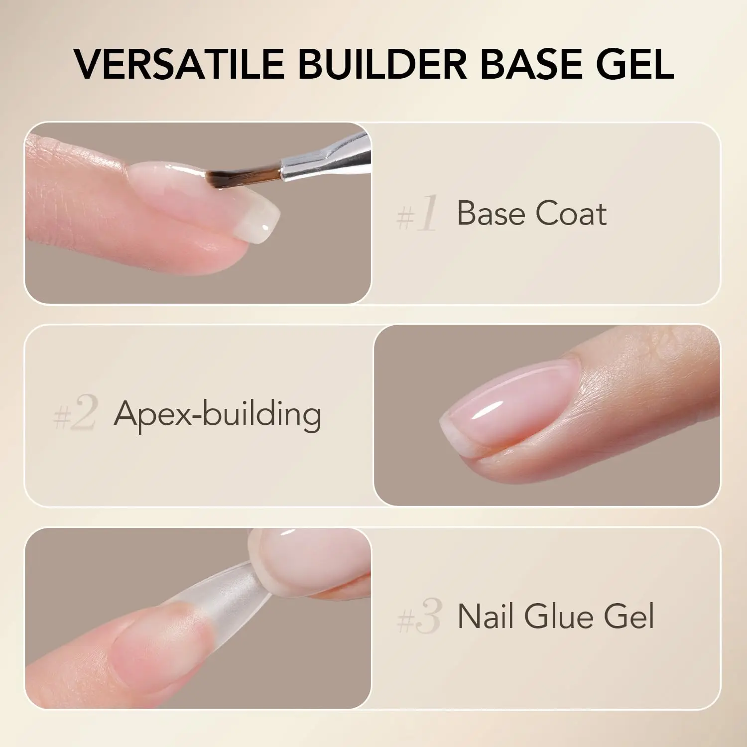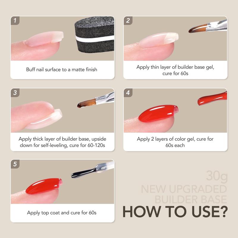 2-in-1 Builder Base: builder base gel = base coat + builder gel. No additional base coat is required, making your manicure easier